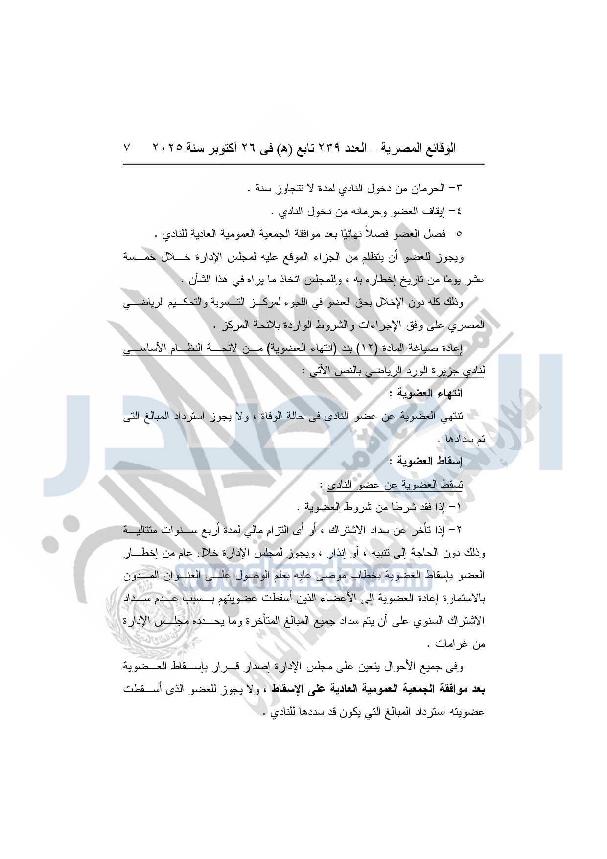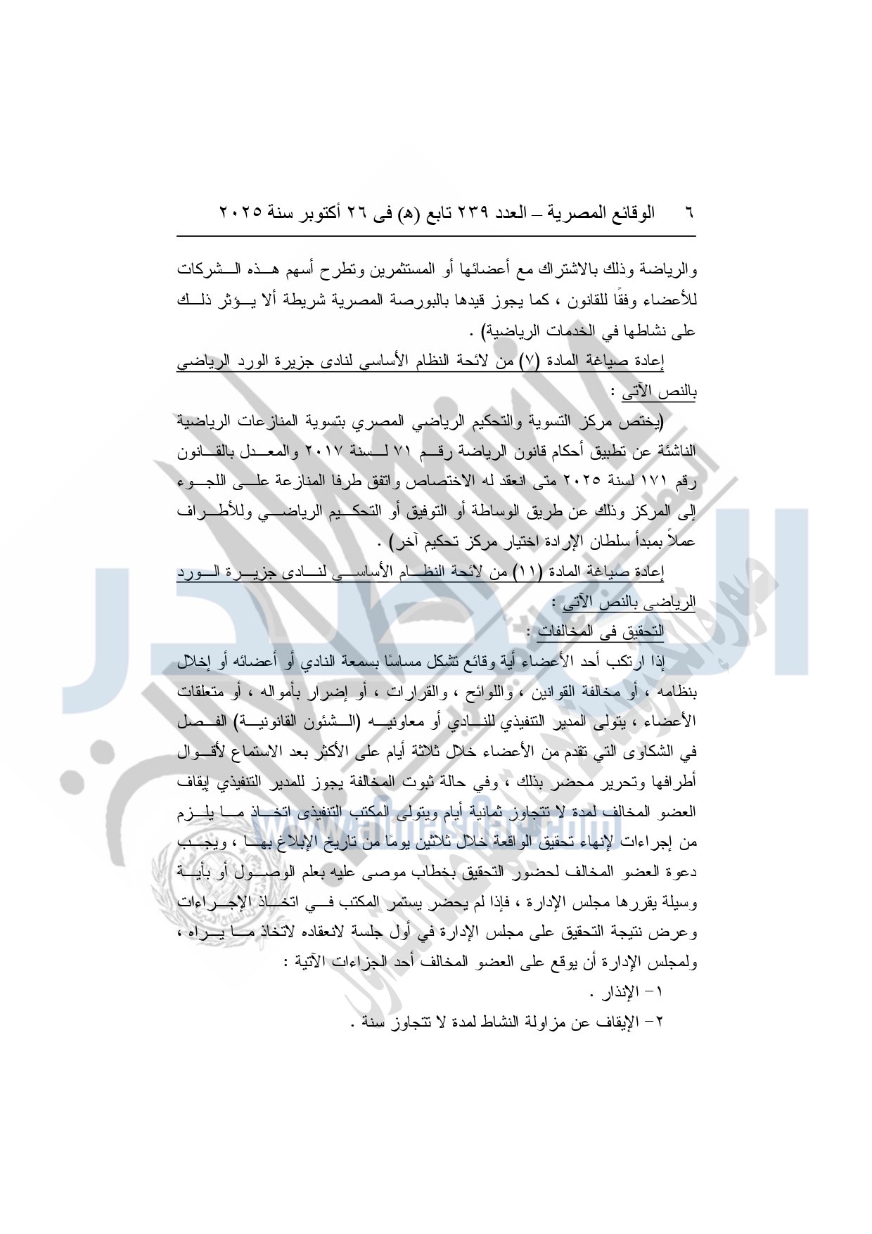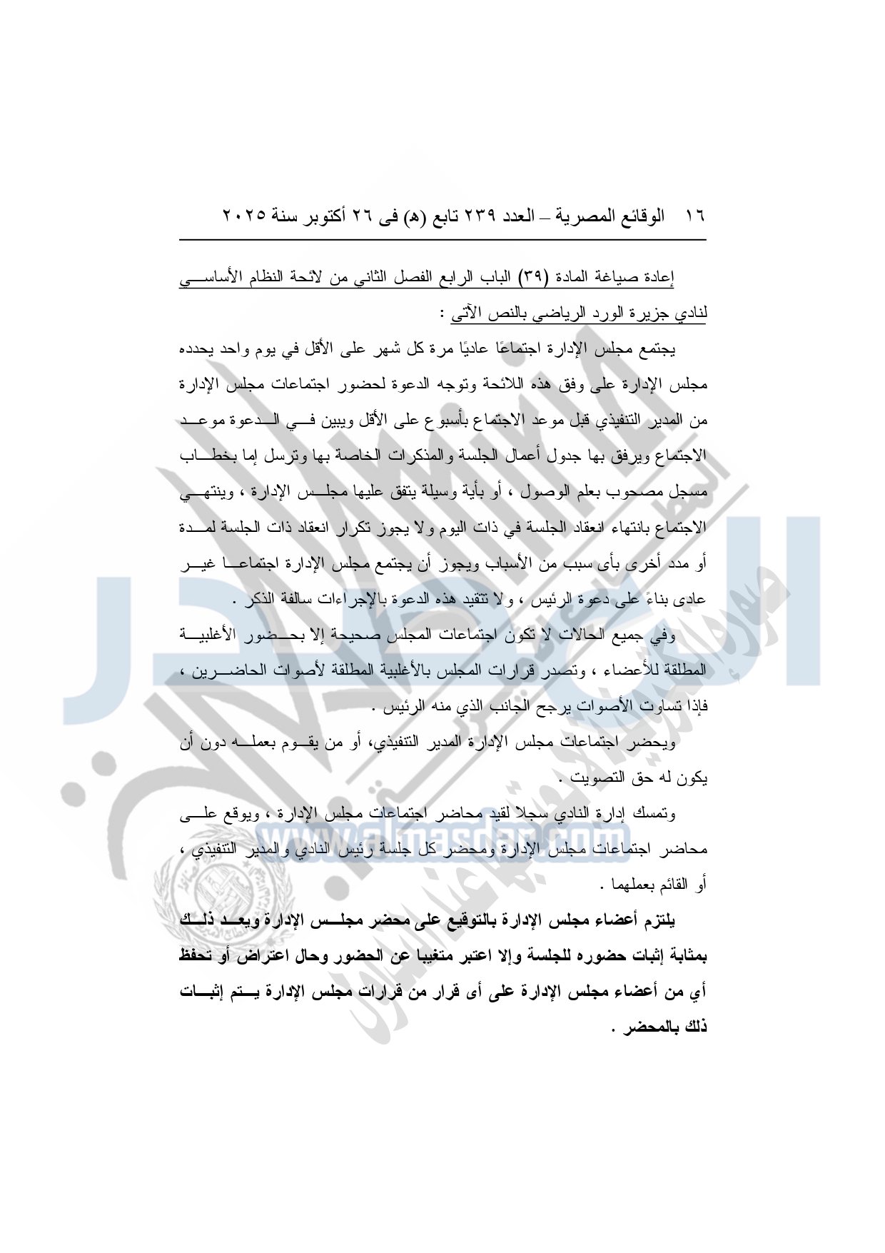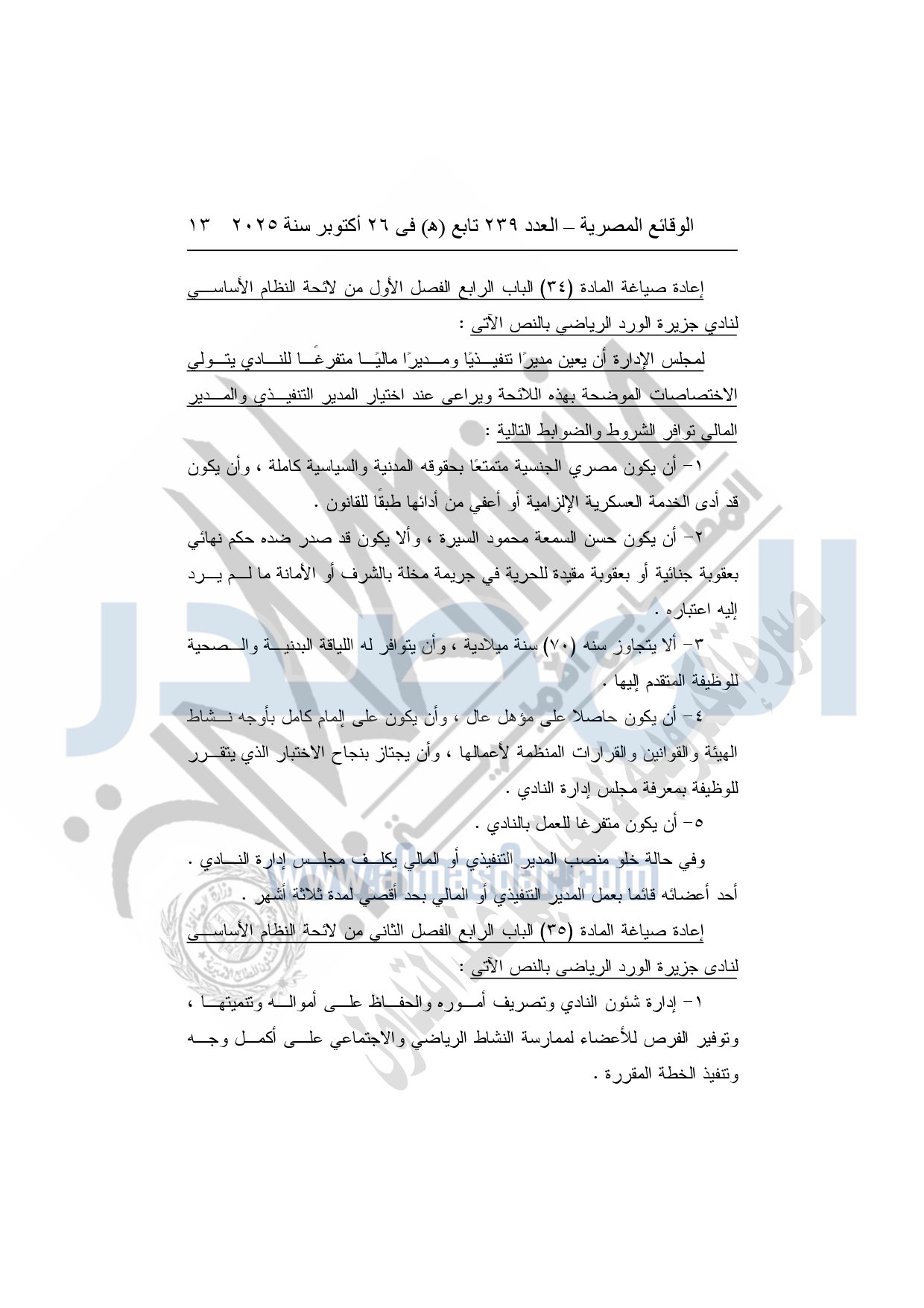 تعديل المواد التالية بلائحة النظام الأساسي لنادى جزيرة الورد الرياضي وفقًا للقانون رقم 171 لسنة 2025 المنشورة بالجريدة الرسمية بالعدد 198 تابع "ب" في 30 أغسطس سنة 2017 باستبدال "مادة 1، مادة 4، مادة 5، مادة 6، مادة 7، مادة 11، مادة 12، مادة 13، مادة 16، مادة 19، مادة 20، مادة 28، مادة 30، مادة 31، مادة 34، مادة 35، مادة 39، مادة 41، مادة 42، مادة 43".