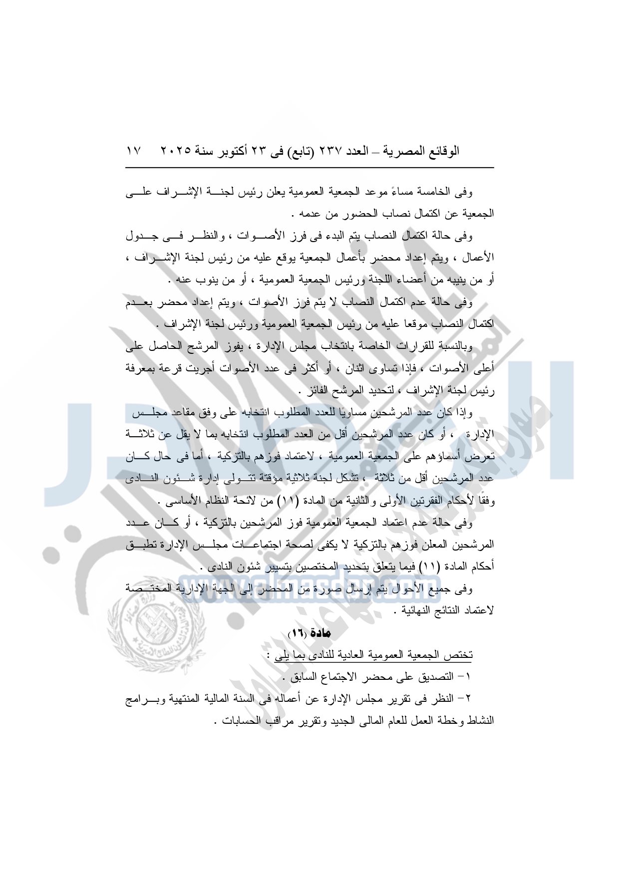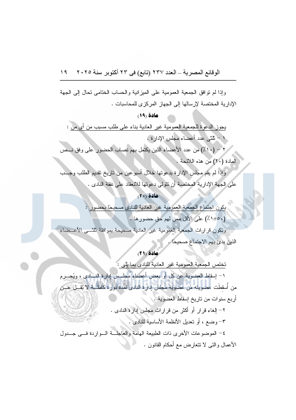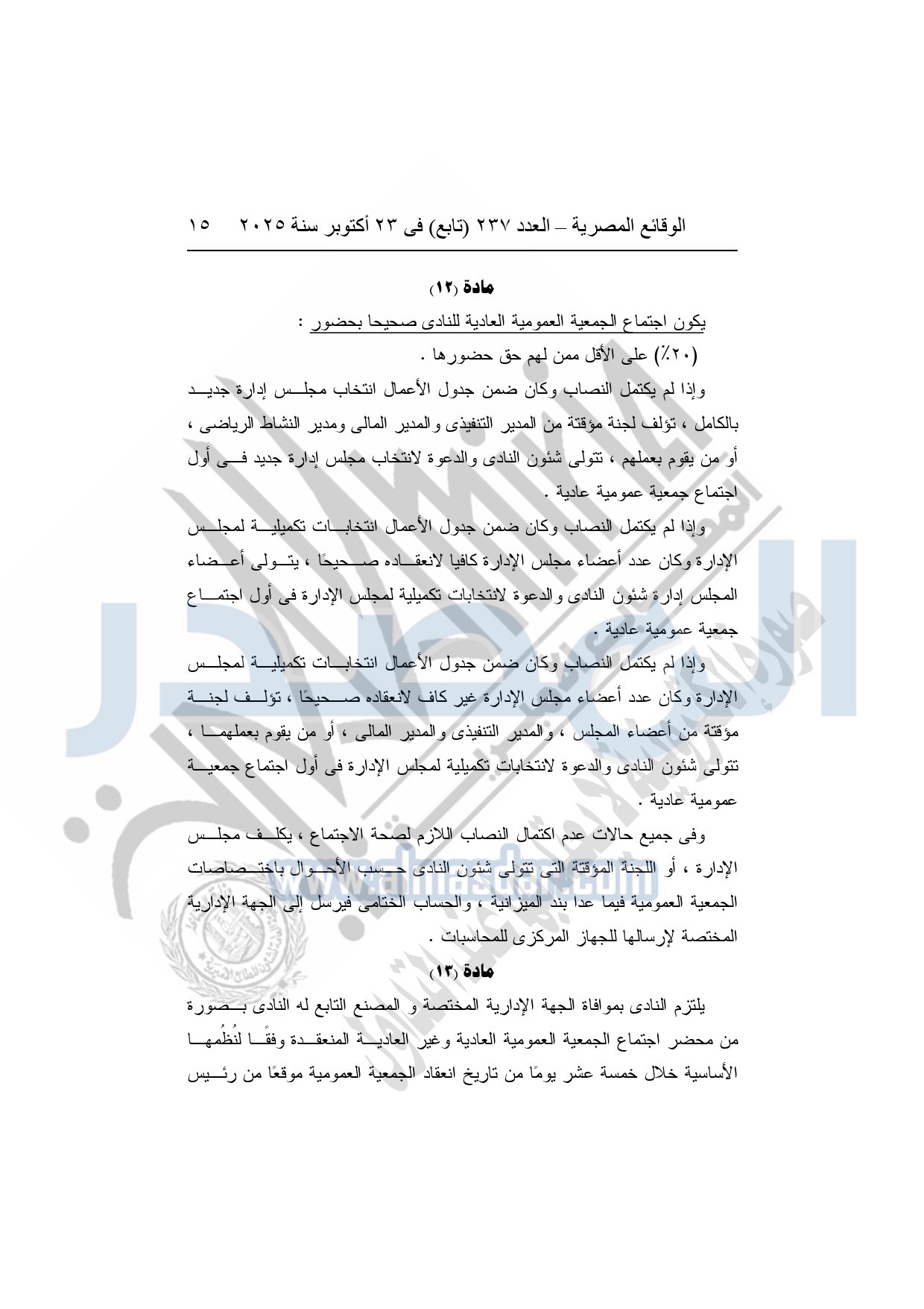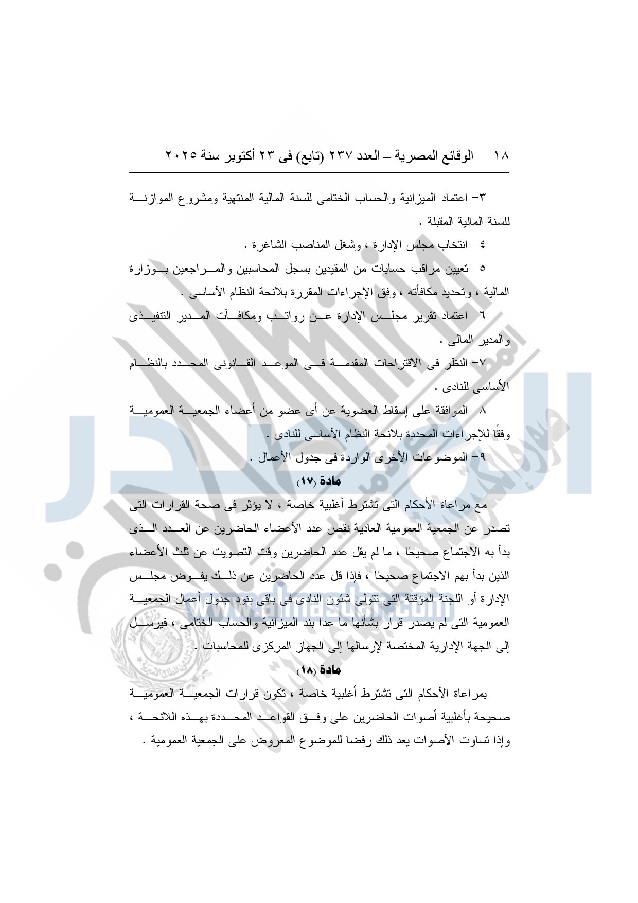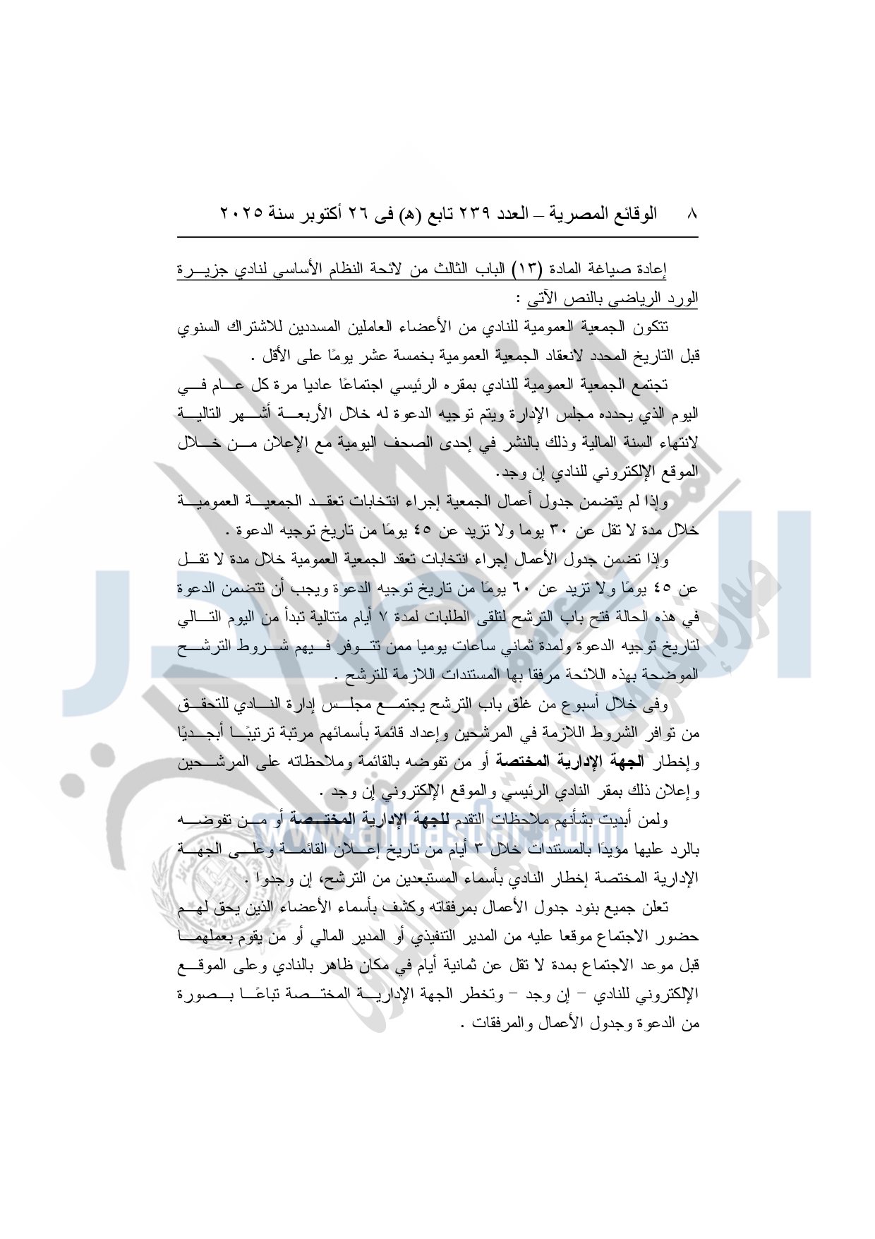 تعديل المواد التالية بلائحة النظام الأساسي لنادى جزيرة الورد الرياضي وفقًا للقانون رقم 171 لسنة 2025 المنشورة بالجريدة الرسمية بالعدد 198 تابع "ب" في 30 أغسطس سنة 2017 باستبدال "مادة 1، مادة 4، مادة 5، مادة 6، مادة 7، مادة 11، مادة 12، مادة 13، مادة 16، مادة 19، مادة 20، مادة 28، مادة 30، مادة 31، مادة 34، مادة 35، مادة 39، مادة 41، مادة 42، مادة 43".