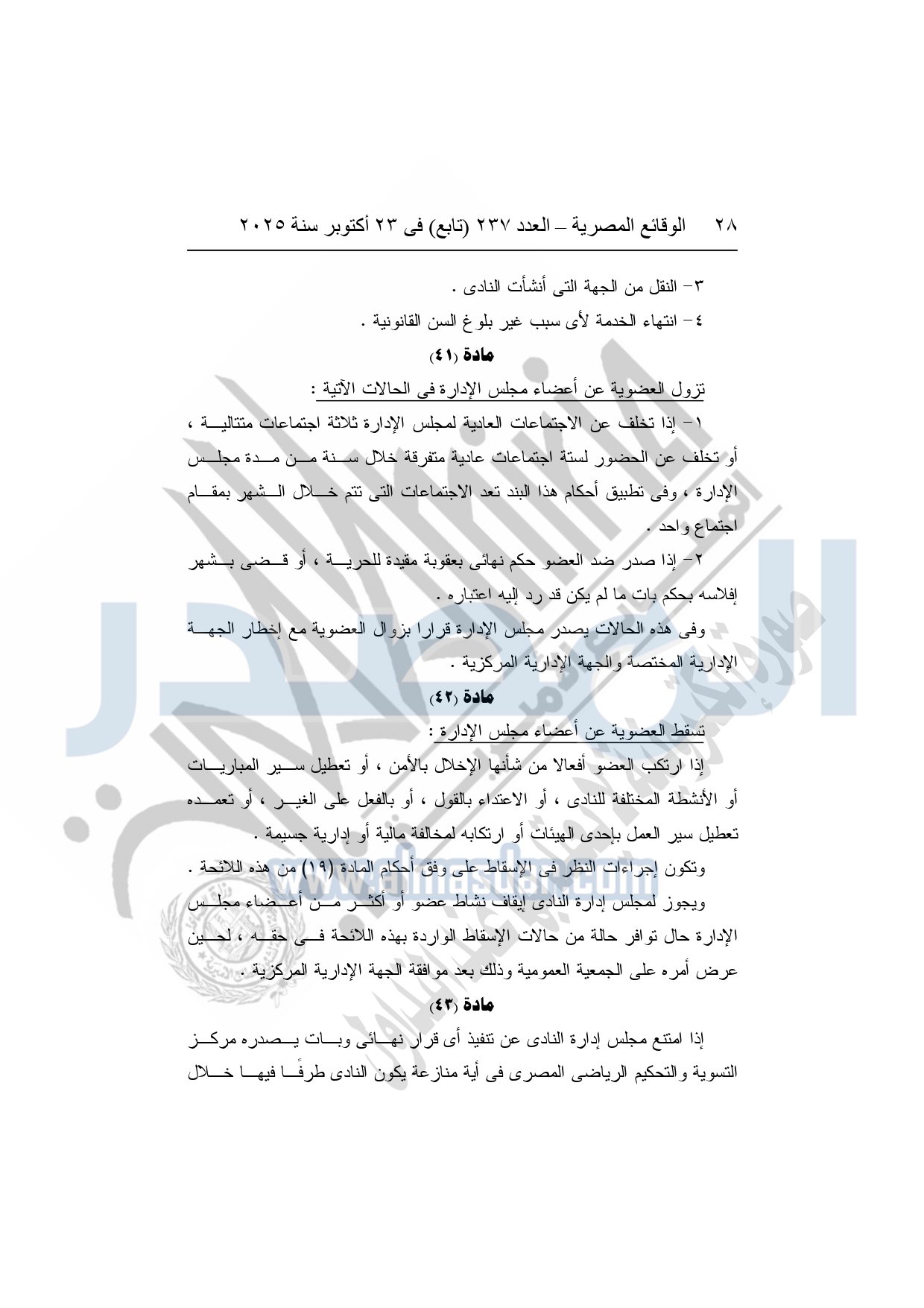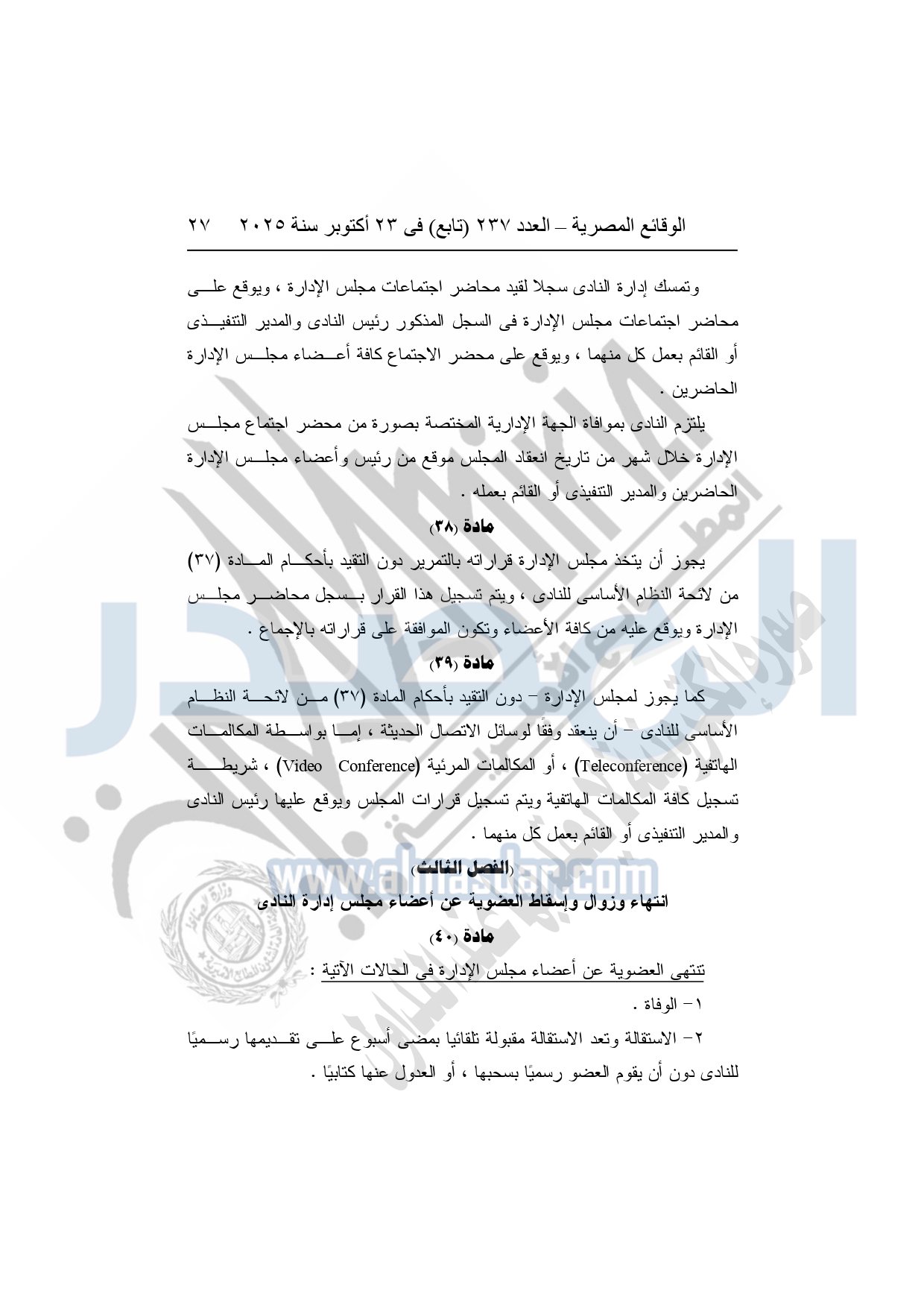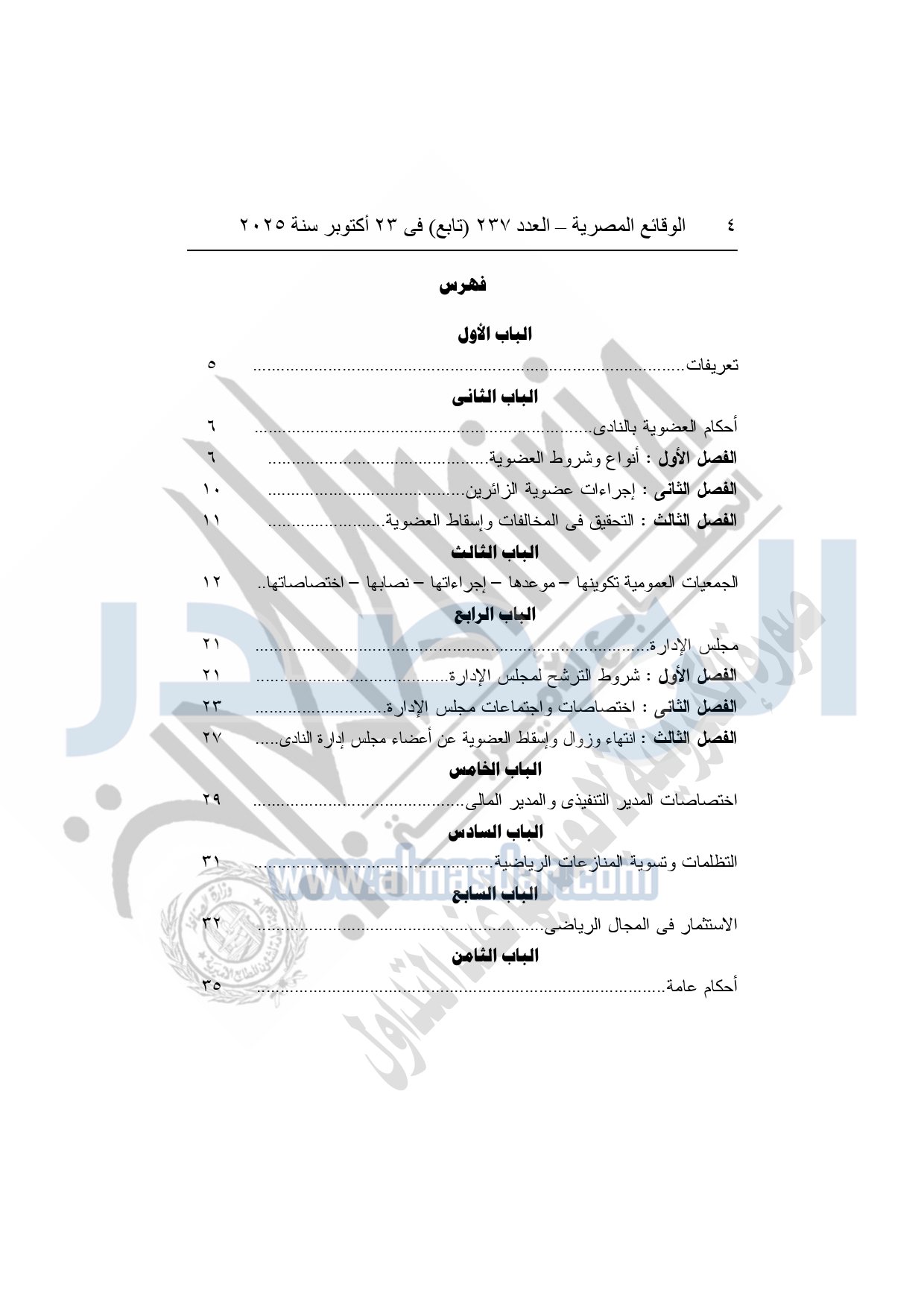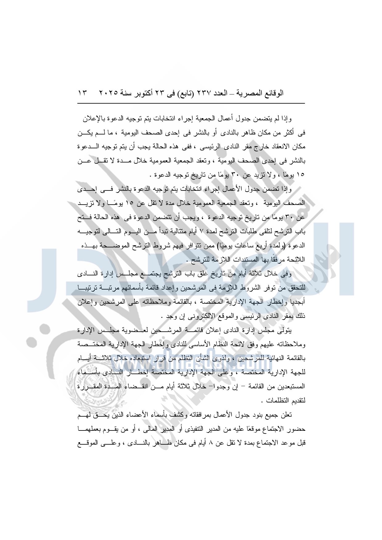 تعديل المواد التالية بلائحة النظام الأساسي لنادى جزيرة الورد الرياضي وفقًا للقانون رقم 171 لسنة 2025 المنشورة بالجريدة الرسمية بالعدد 198 تابع "ب" في 30 أغسطس سنة 2017 باستبدال "مادة 1، مادة 4، مادة 5، مادة 6، مادة 7، مادة 11، مادة 12، مادة 13، مادة 16، مادة 19، مادة 20، مادة 28، مادة 30، مادة 31، مادة 34، مادة 35، مادة 39، مادة 41، مادة 42، مادة 43".