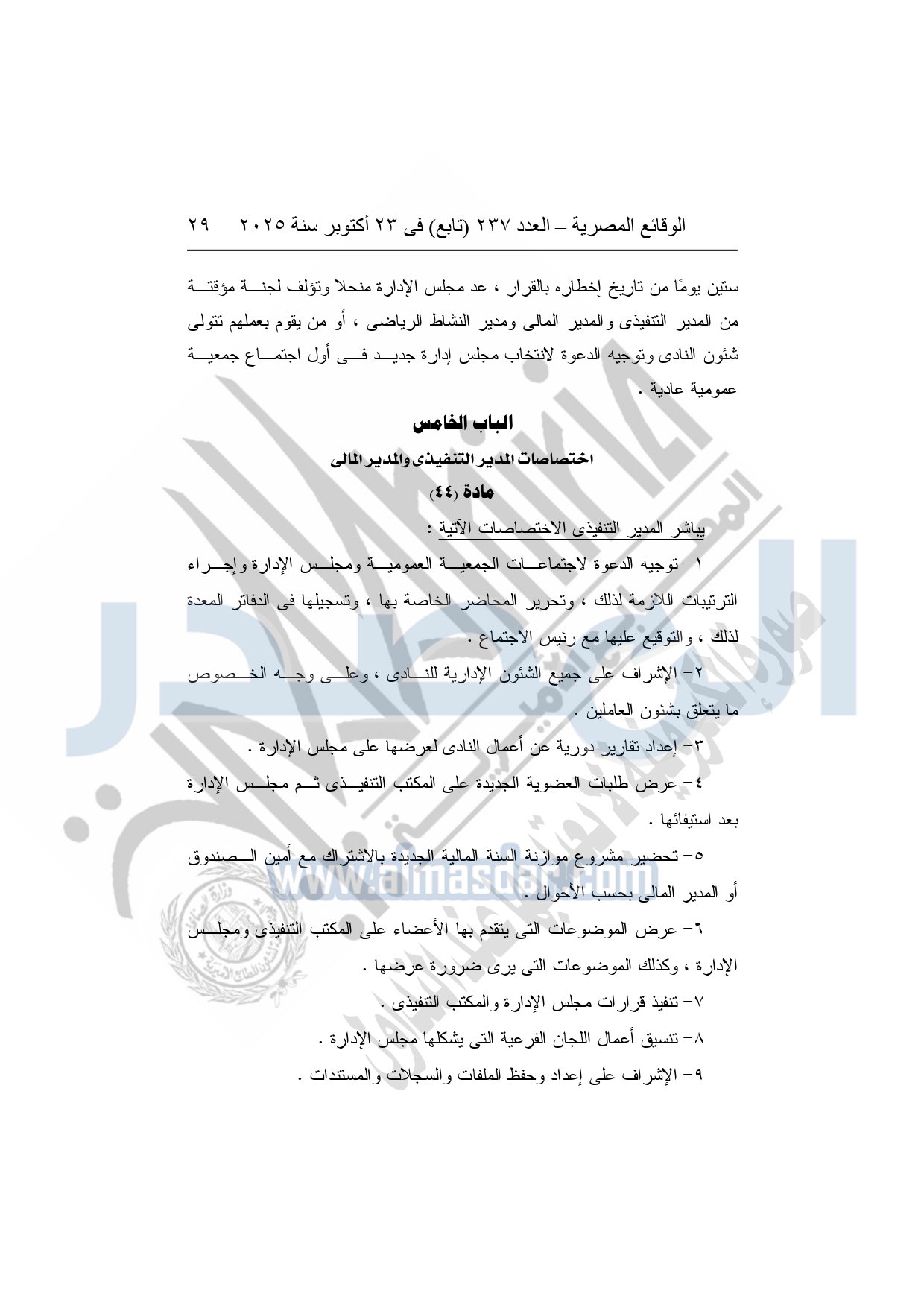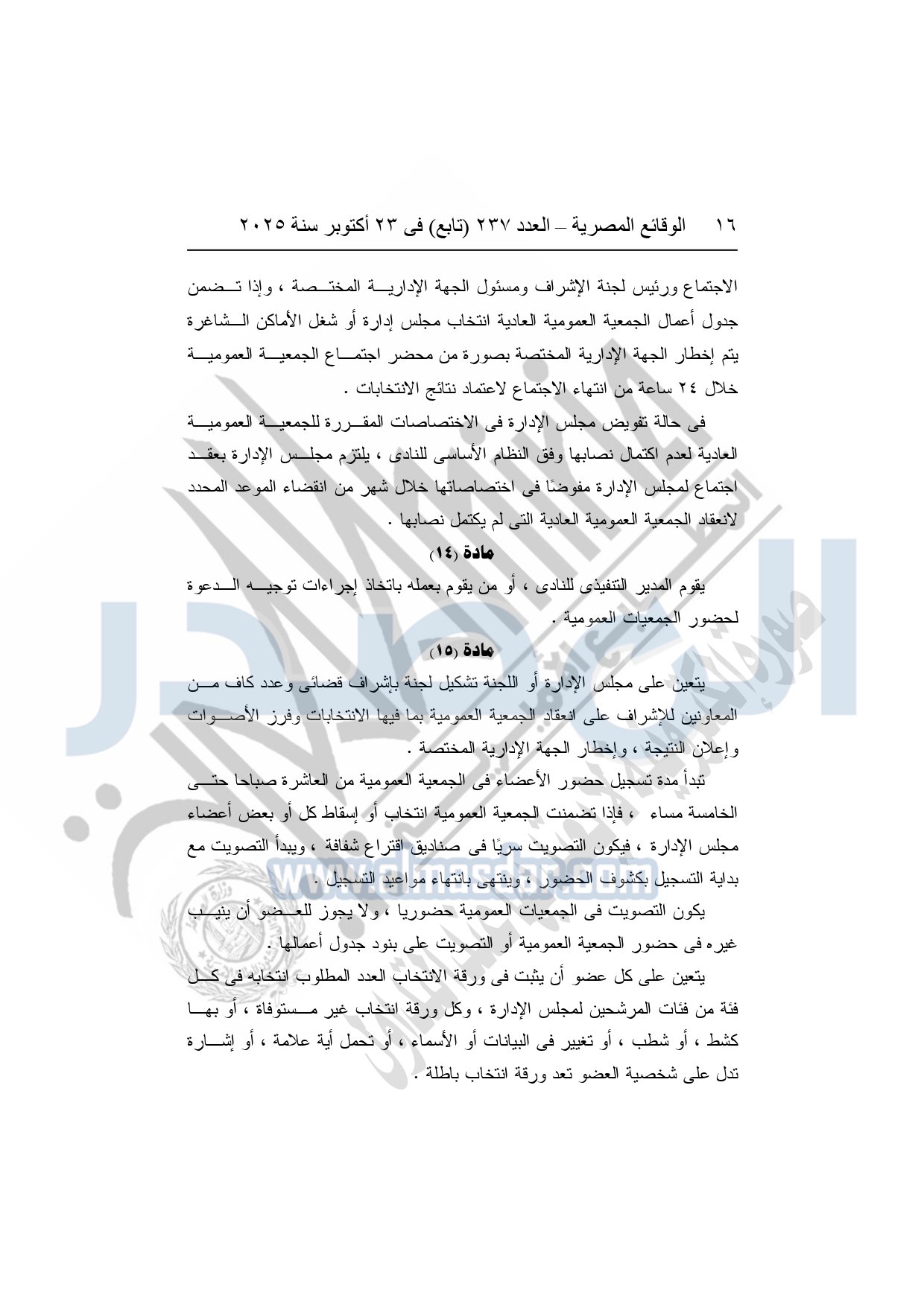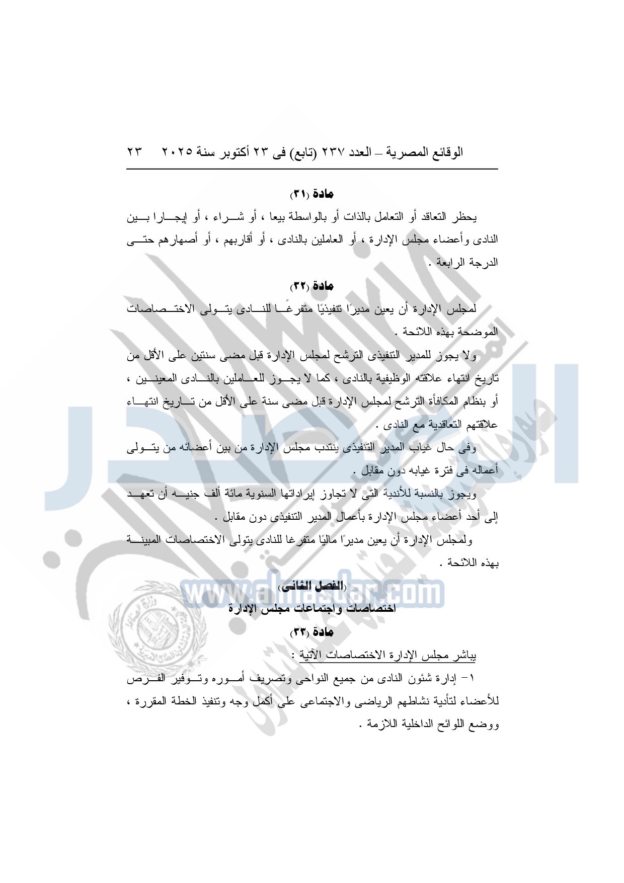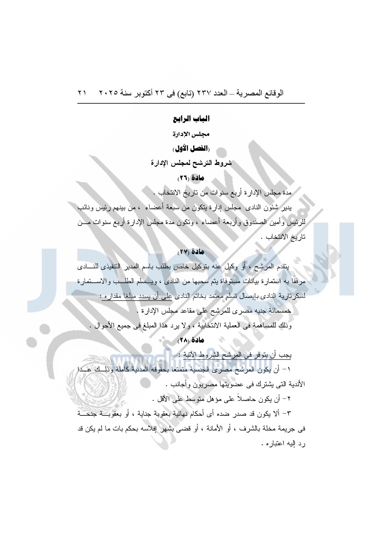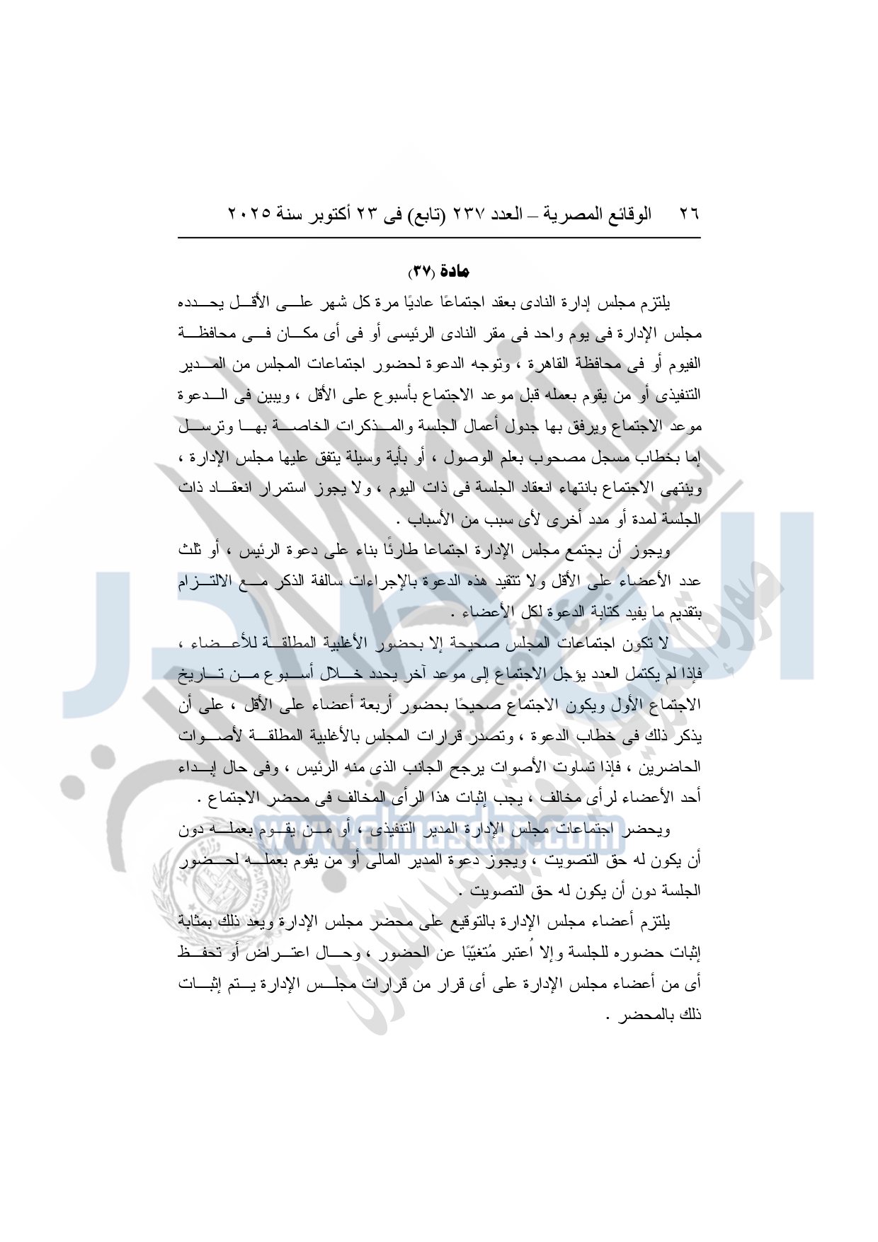 تعديل المواد التالية بلائحة النظام الأساسي لنادى جزيرة الورد الرياضي وفقًا للقانون رقم 171 لسنة 2025 المنشورة بالجريدة الرسمية بالعدد 198 تابع "ب" في 30 أغسطس سنة 2017 باستبدال "مادة 1، مادة 4، مادة 5، مادة 6، مادة 7، مادة 11، مادة 12، مادة 13، مادة 16، مادة 19، مادة 20، مادة 28، مادة 30، مادة 31، مادة 34، مادة 35، مادة 39، مادة 41، مادة 42، مادة 43".
