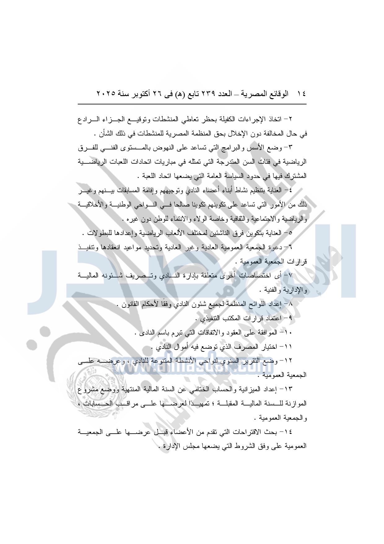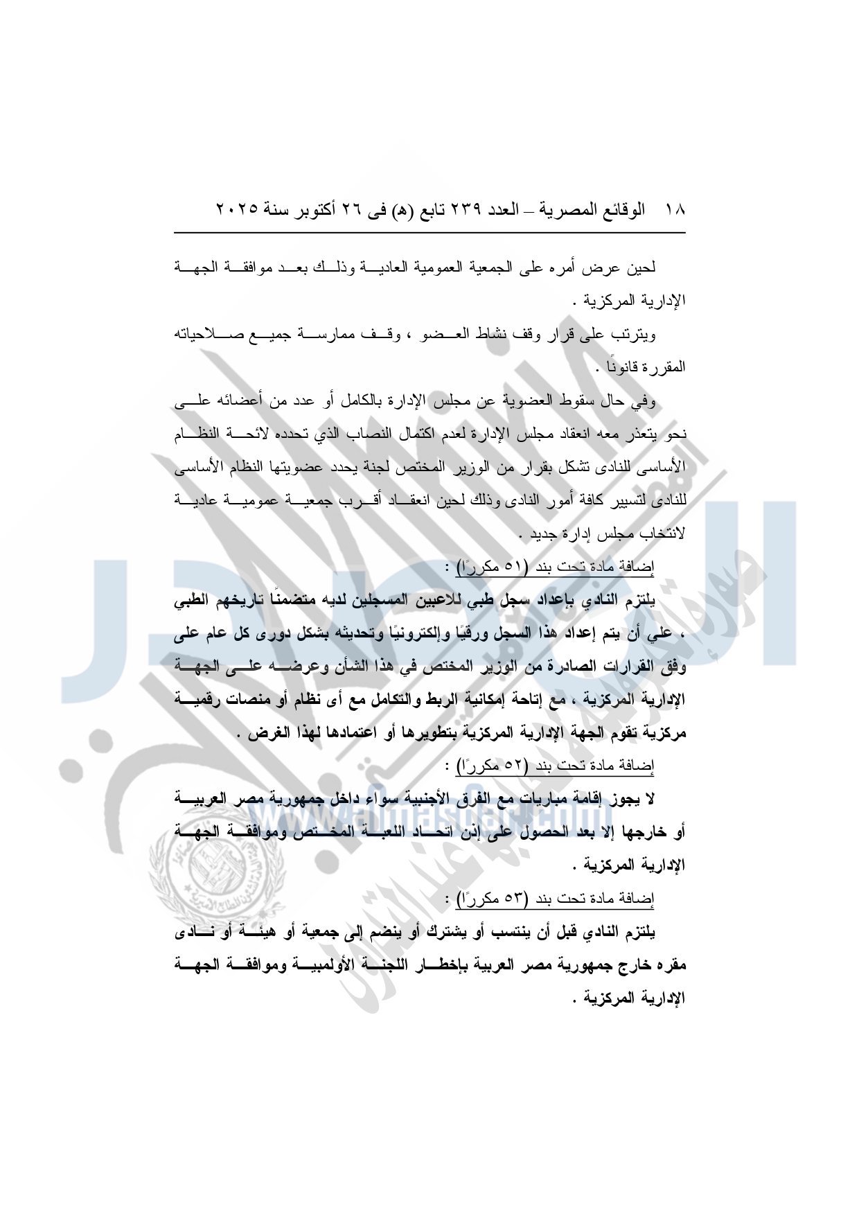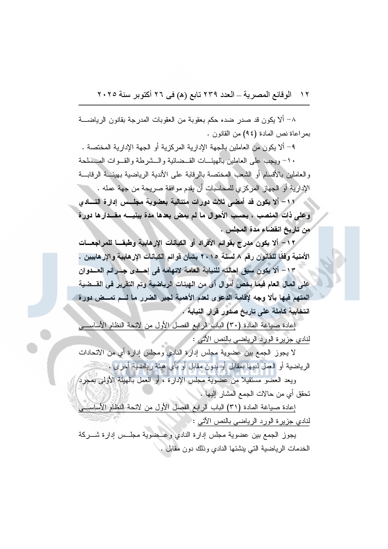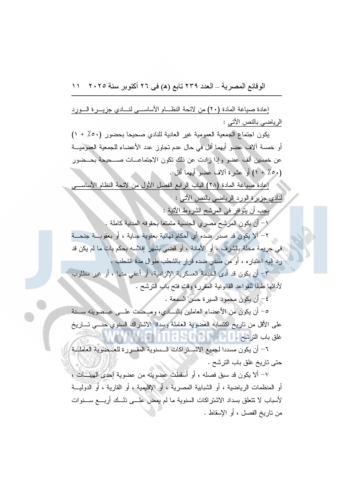 نشرت الوقائع المصرية في العدد 239 تابع "هـ"، بتاريخ 26 أكتوبر 2025، قرار وزارة الشباب والرياضة، رقم 1463 لسنة 2025، بتاريخ 26-10-2025، بشأن تعديل المواد التالية بلائحة النظام الأساسي لنادى جزيرة الورد الرياضي.