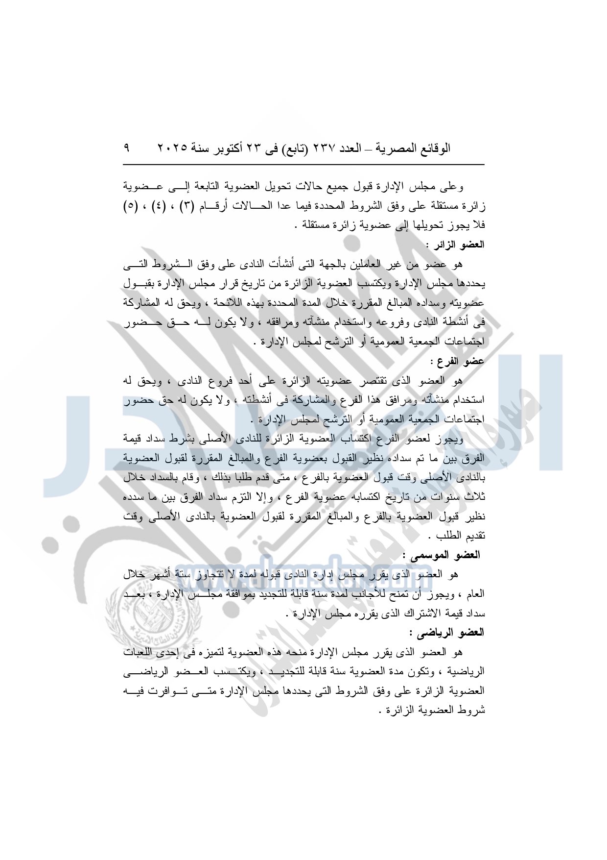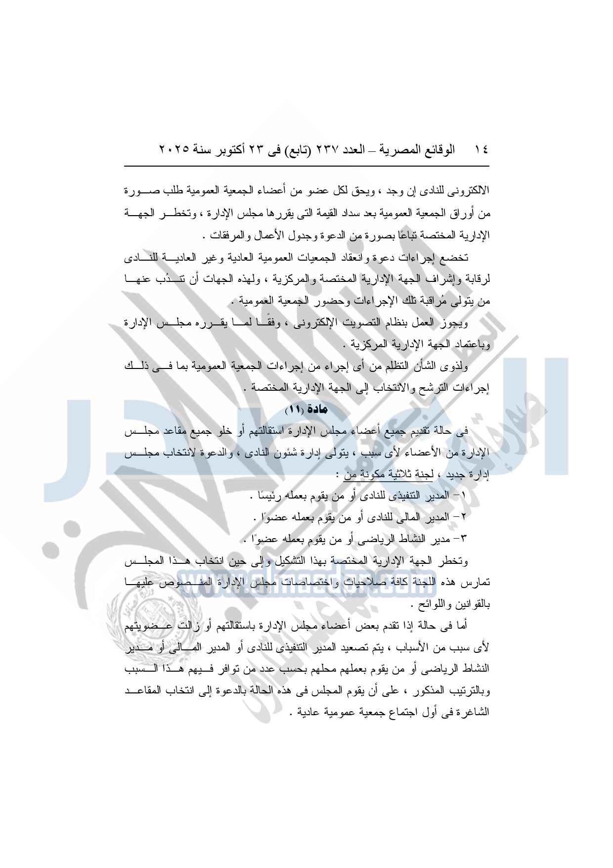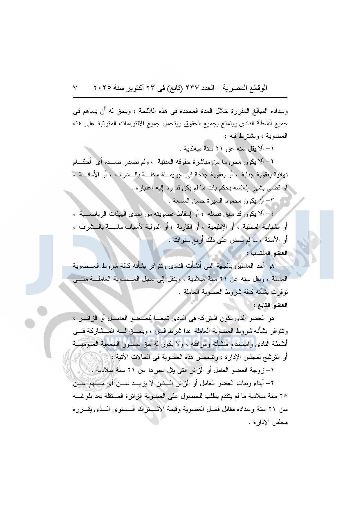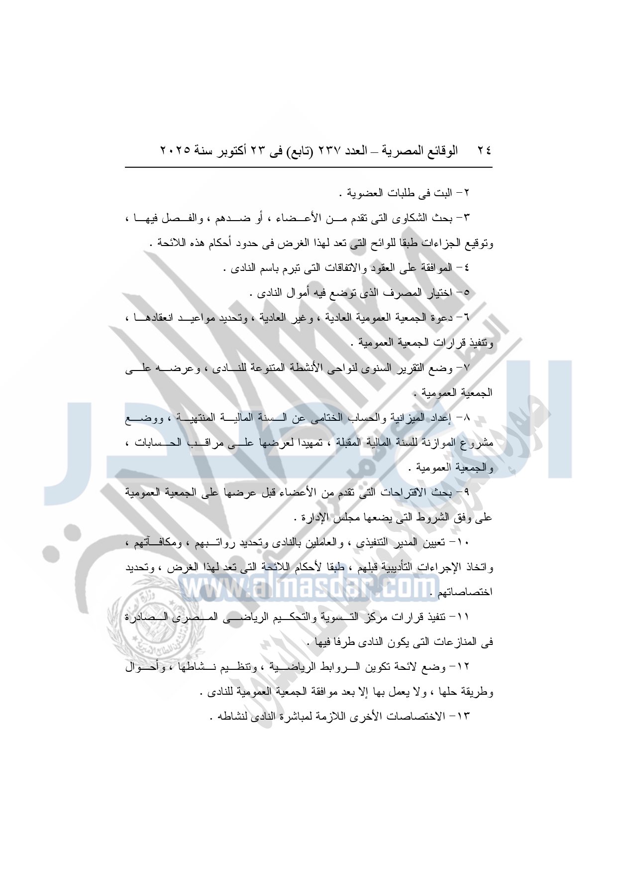 نشرت الوقائع المصرية في العدد 239 تابع "هـ"، بتاريخ 26 أكتوبر 2025، قرار وزارة الشباب والرياضة، رقم 1463 لسنة 2025، بتاريخ 26-10-2025، بشأن تعديل المواد التالية بلائحة النظام الأساسي لنادى جزيرة الورد الرياضي.