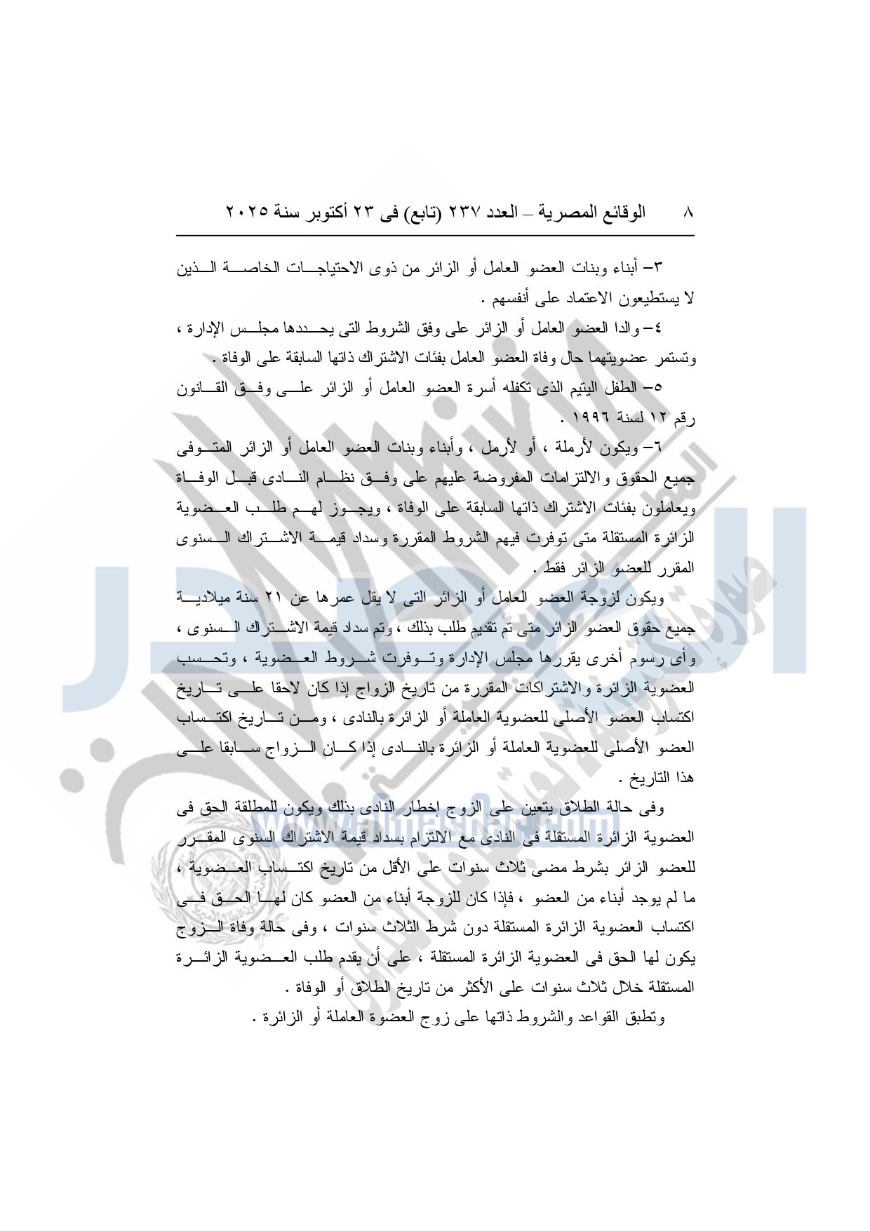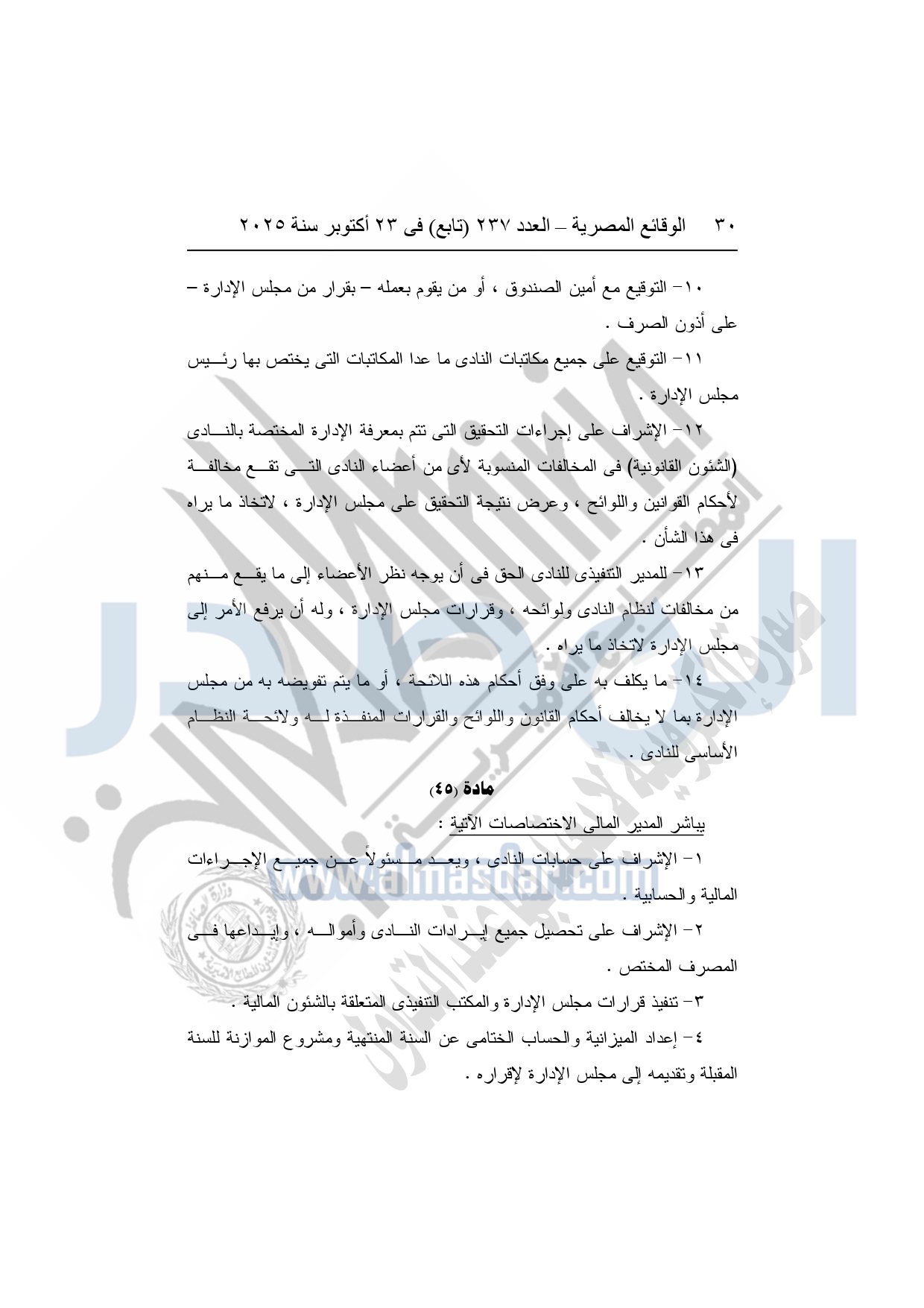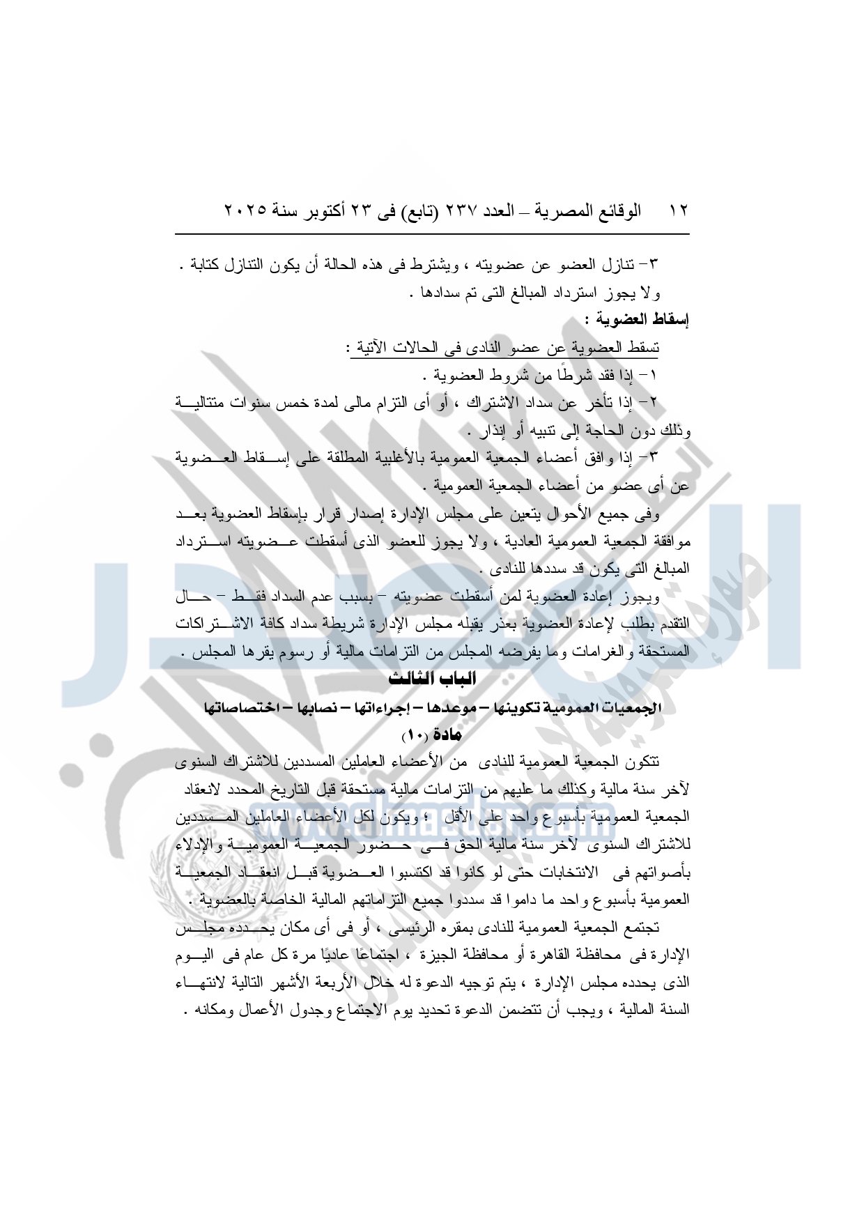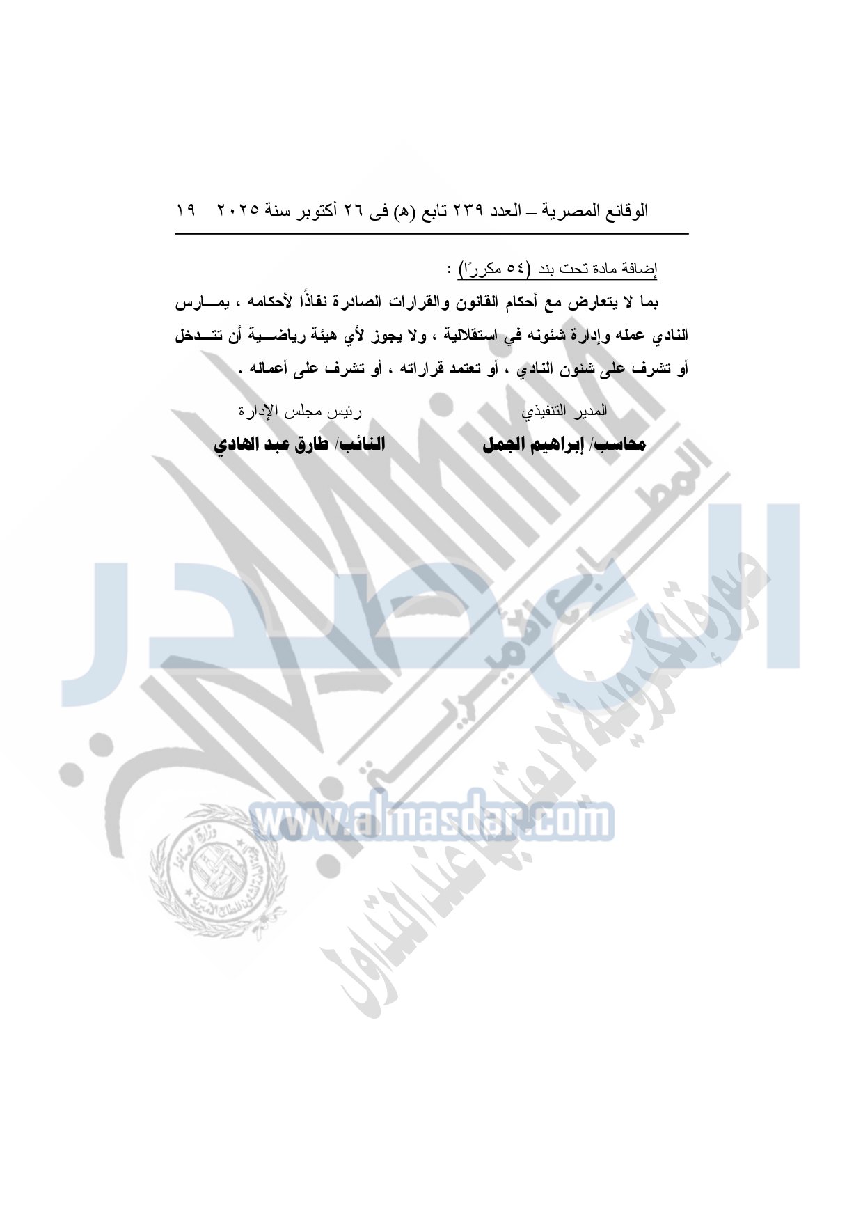 نشرت الوقائع المصرية في العدد 239 تابع "هـ"، بتاريخ 26 أكتوبر 2025، قرار وزارة الشباب والرياضة، رقم 1463 لسنة 2025، بتاريخ 26-10-2025، بشأن تعديل المواد التالية بلائحة النظام الأساسي لنادى جزيرة الورد الرياضي.