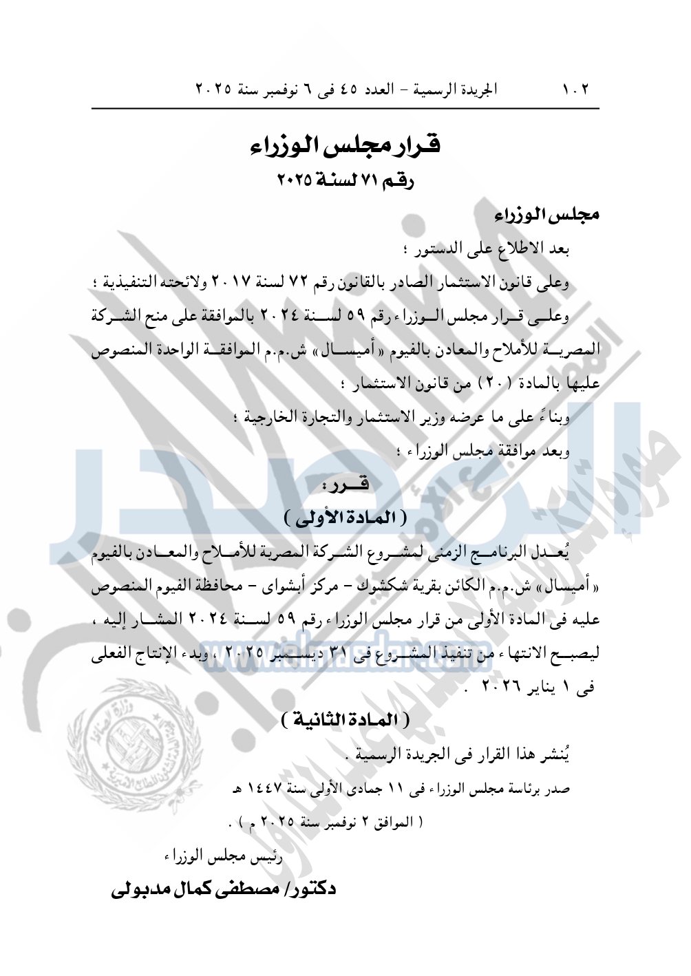 نشرت الجريدة الرسمية في العدد 45، بتاريخ 6 نوفمبر 2025، قرار رئيس مجلس الوزراء، رقم 71 لسنة 2025، بشأن تعديل البرنامج الزمنى لمشروع الشركة المصرية للأملاح والمعادن بالفيوم.