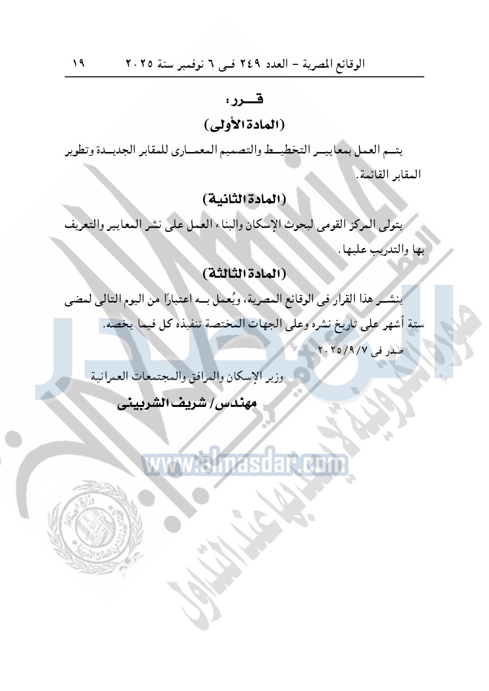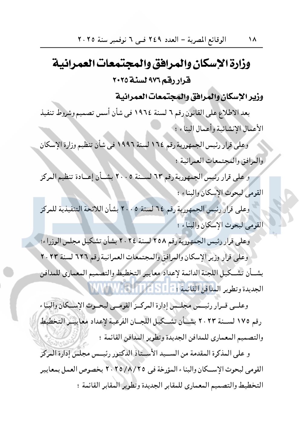 نشرت الوقائع المصرية في العدد 249، بتاريخ 6 نوفمبر 2025، قرار وزارة الإسكان والمرافق والمجتمعات العمرانية، رقم 976 لسنة 2025، بشأن إعتماد معايير التخطيط والتصميم المعمارى للمقابر الجديدة.