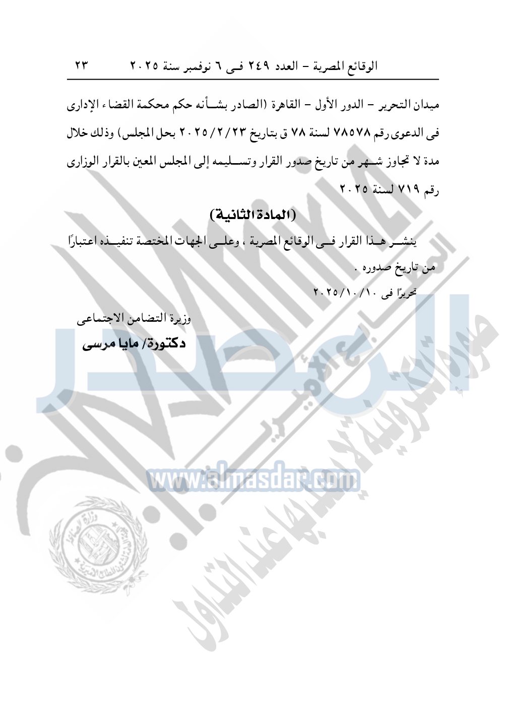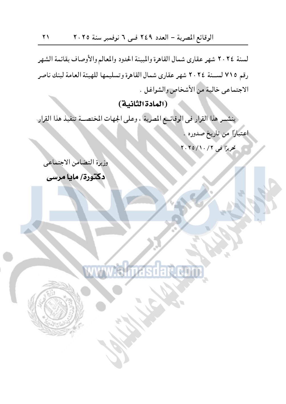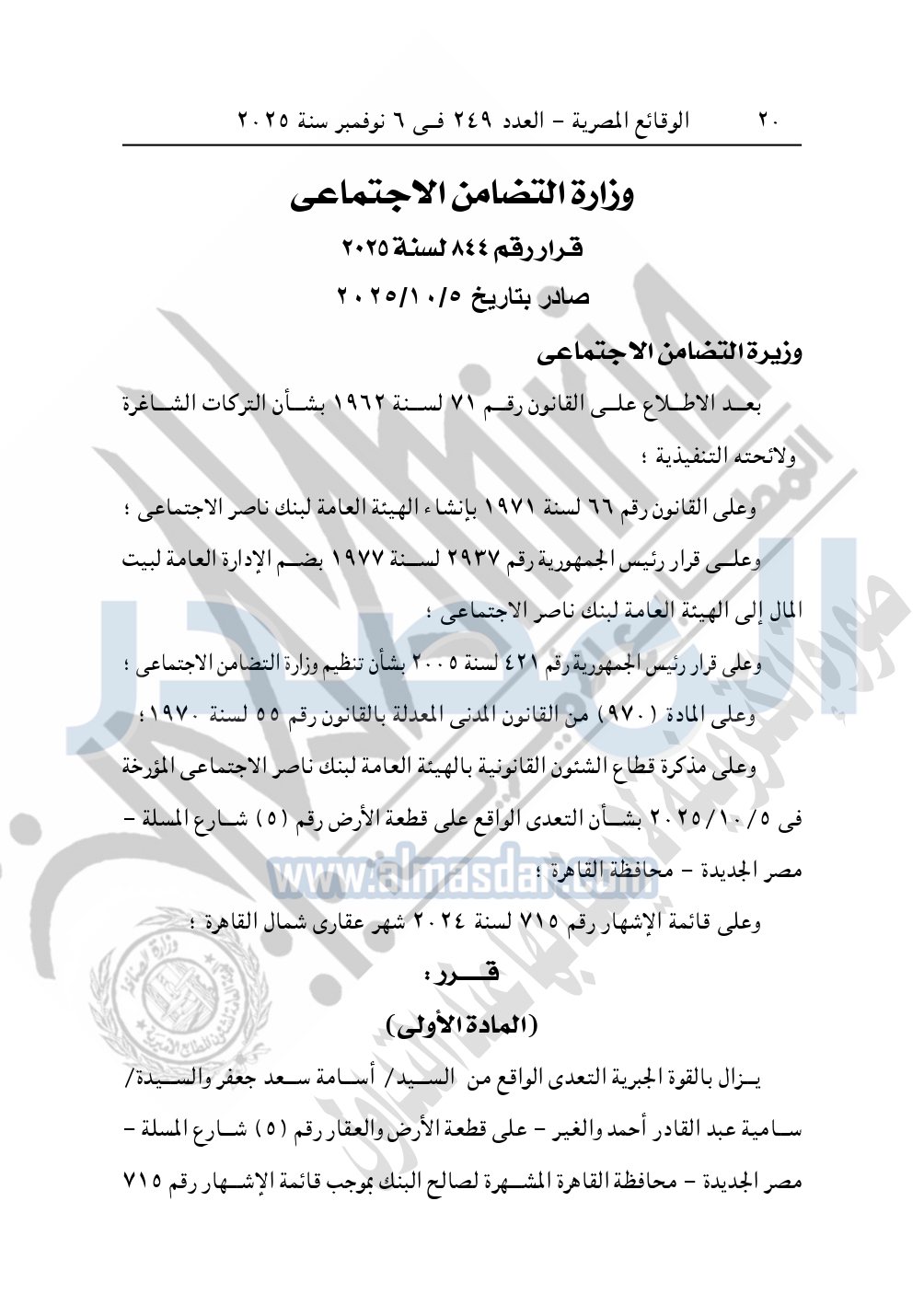 نشرت الوقائع المصرية في العدد 249، بتاريخ 6 نوفمبر 2025، قرار وزارة التضامن الاجتماعي، رقم 844 لسنة 2025، بتاريخ 5-10-2025، بشأن إزالة القوة الجبرية التعدى الواقع من أسامة سعد جعفر وسامية عبد القادر أحمد والغير بمحافظة القاهرة.