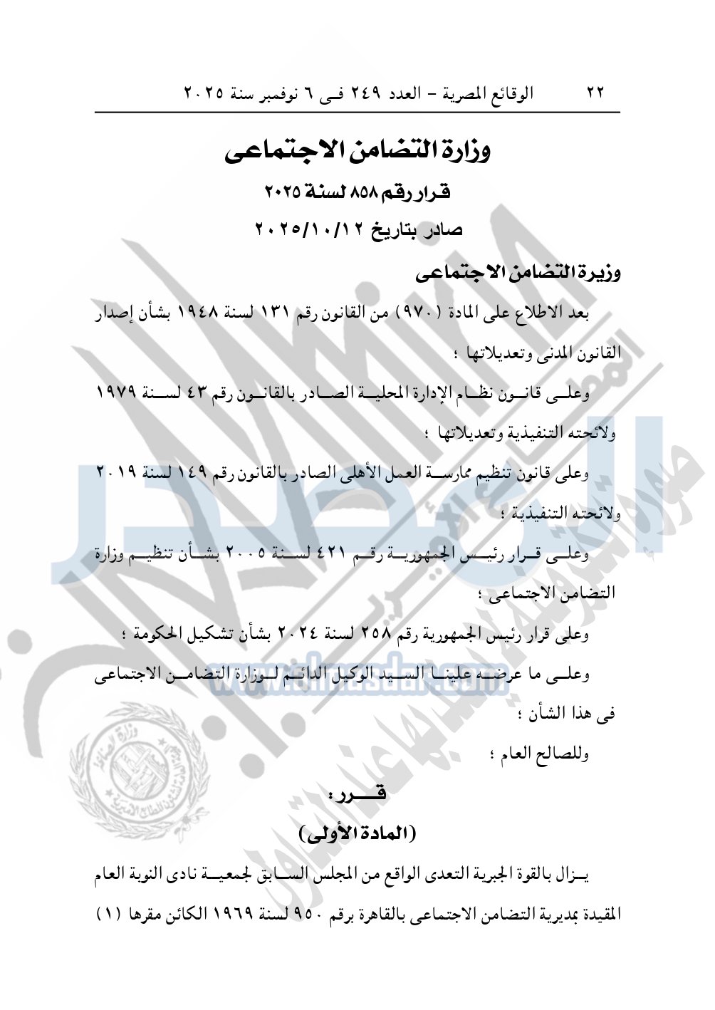 كما نشرت الوقائع المصرية في العدد 249، بتاريخ 6 نوفمبر 2025، قرار وزارة التضامن الاجتماعي، رقم 858 لسنة 2025، بتاريخ 12-10-2025، بشأن إزالة بالقوة الجبرية التعدى الواقع من المجلس السابق لجمعية نادى النوبة.