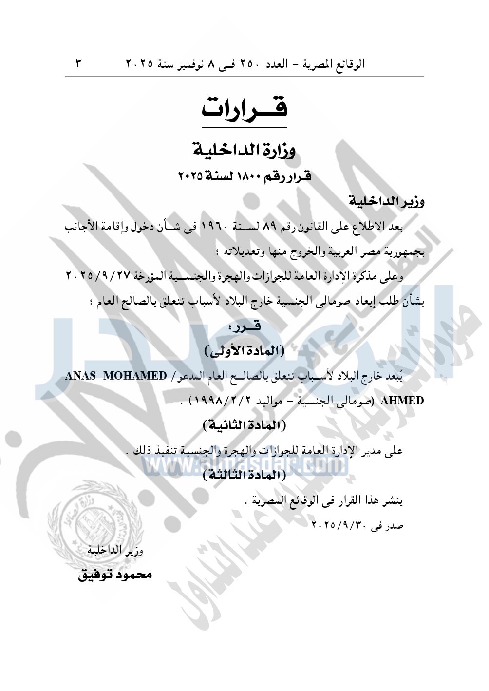 كما نشرت الوقائع المصرية في العدد 250 في 8 نوفمبر سنة 2025، وزارة الداخلية قرار رقم 1801 لسنة 2025، بشأن إبعاد شخص سورى الجنسية خارج البلاد.
