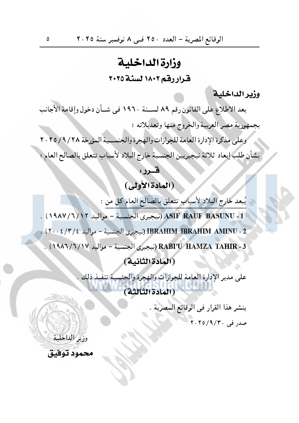 ونشرت الوقائع المصرية في العدد 250 الصادر في 8 نوفمبر سنة 2025، وزارة الداخلية قرار رقم 1802 لسنة 2025، بشأن إبعاد 3 أشخاص نيجيريين الجنسية خارج البلاد.
