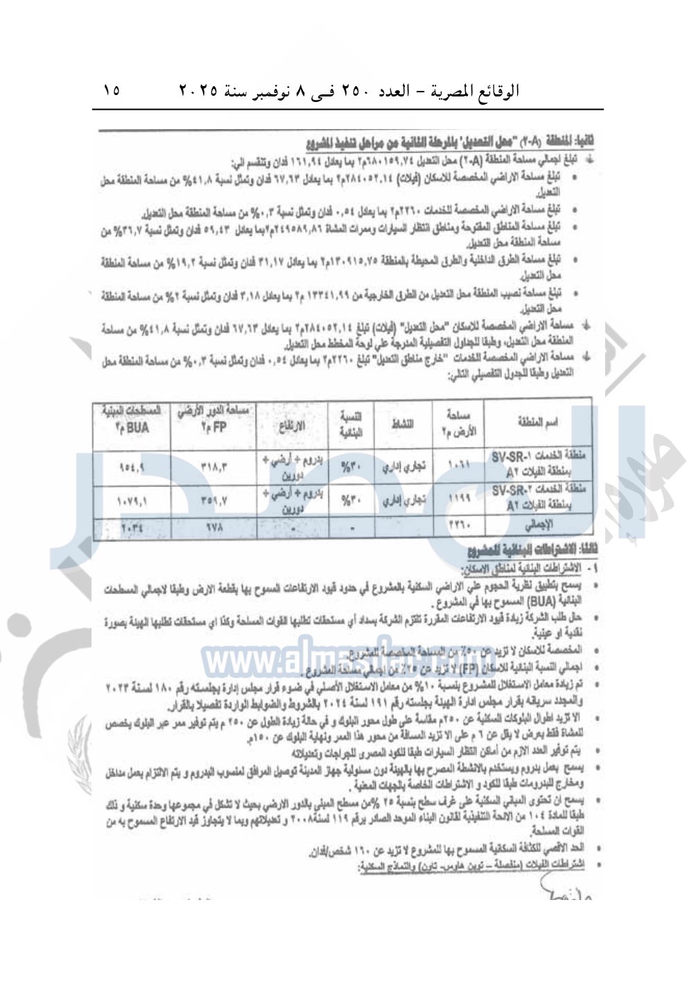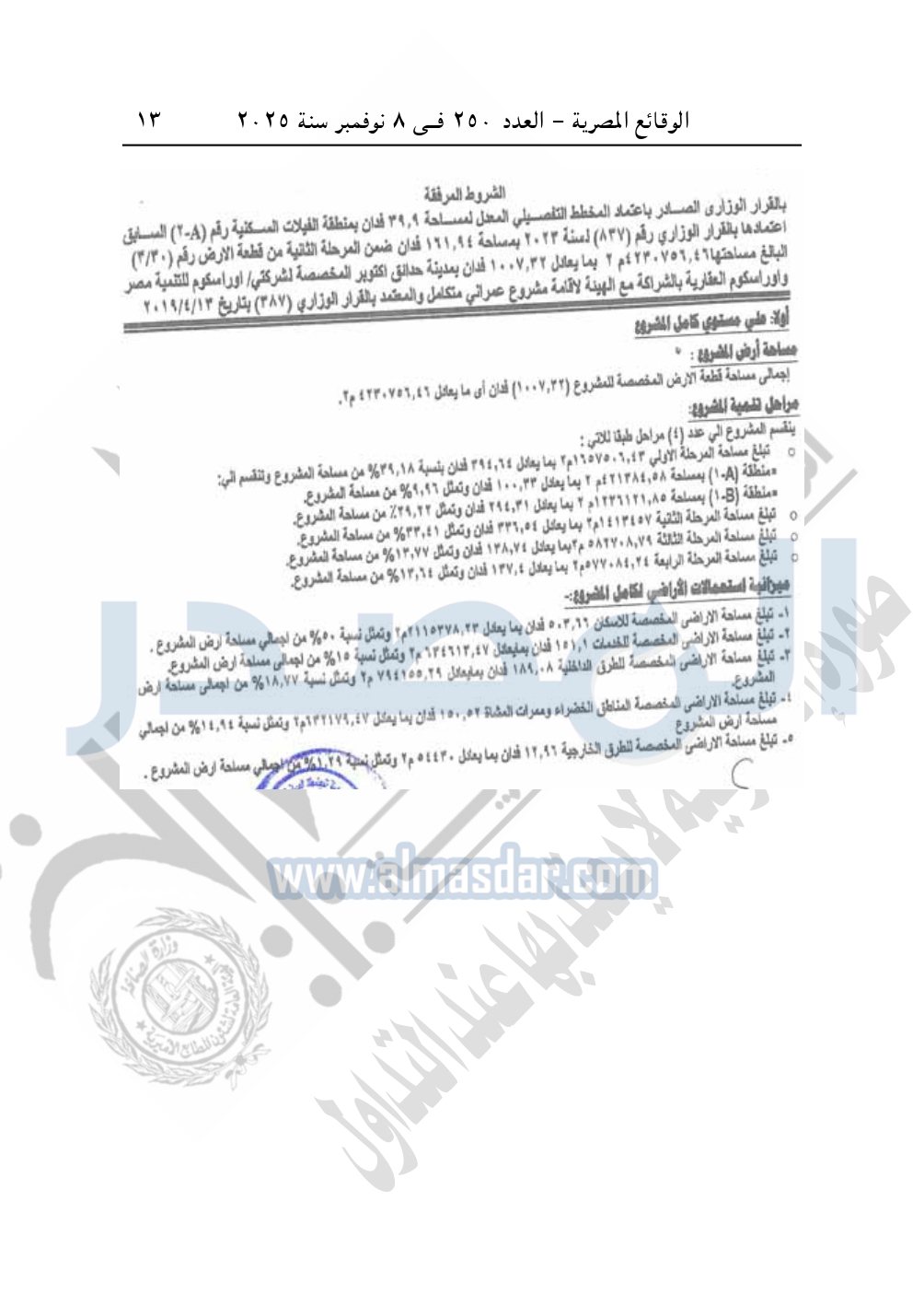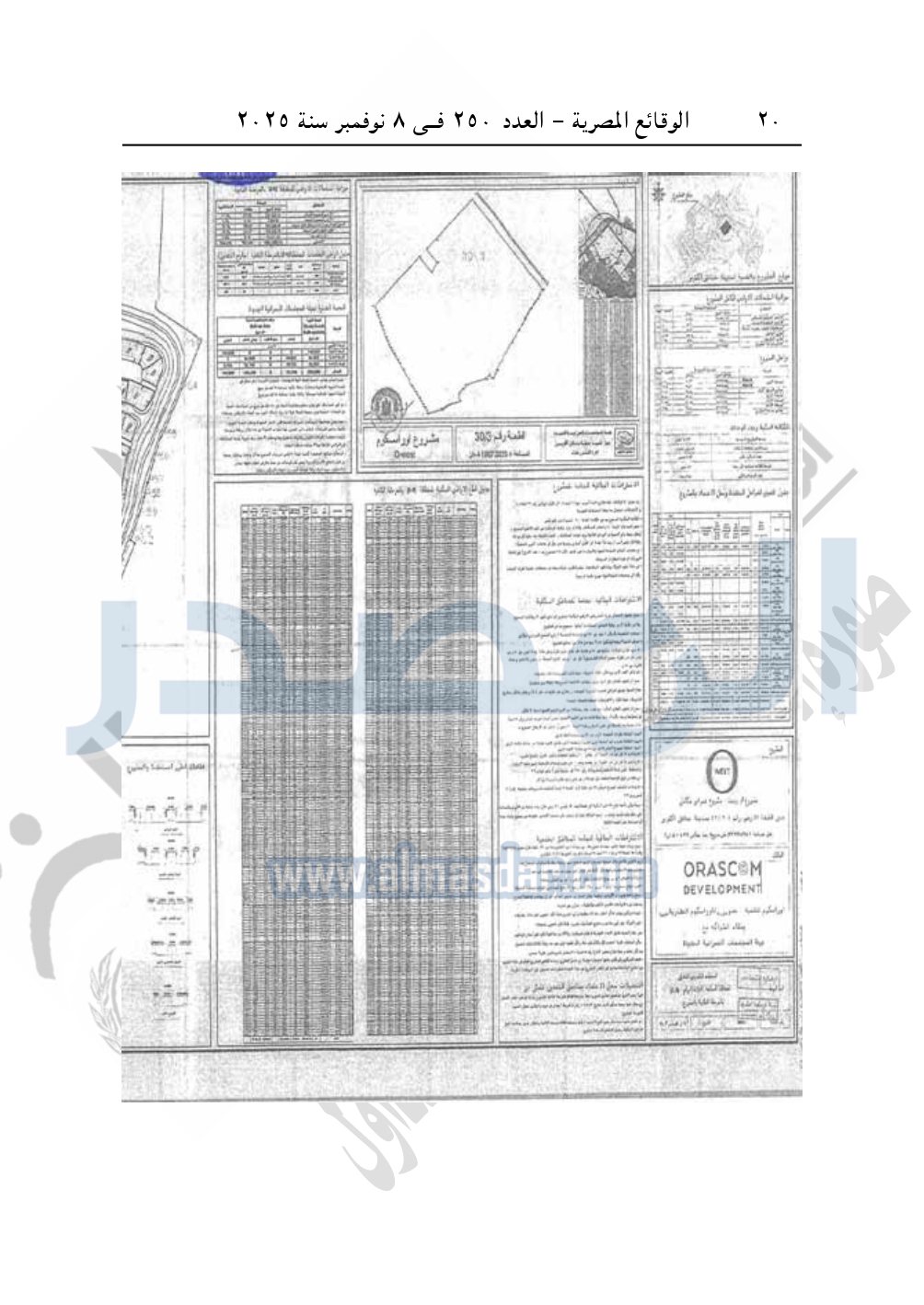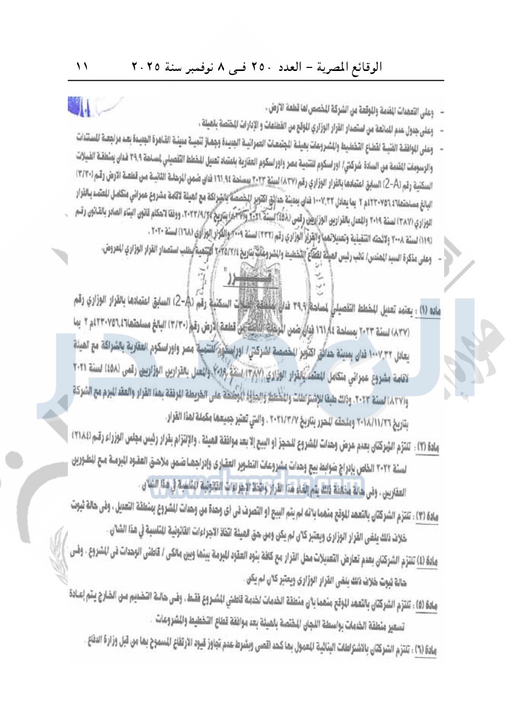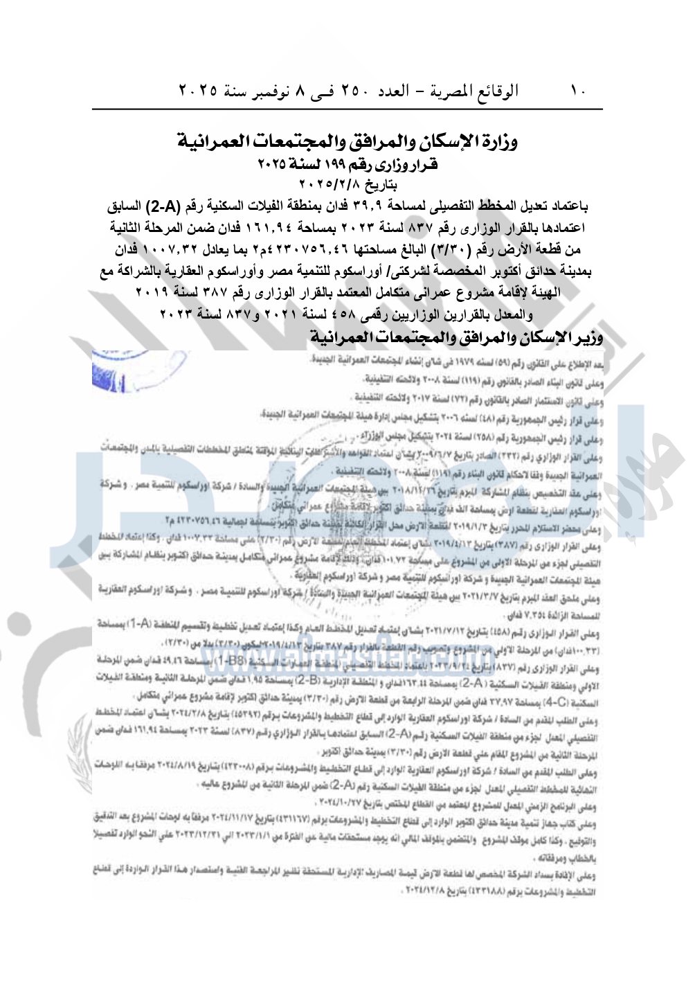 نشرت الوقائع المصرية في العدد 250 الصادر في 8 نوفمبر سنة 2025، وزارة الإسكان والمرافق والمجتمعات العمرانية، قرار وزاري رقم 199 لسنة 2025 بتاريخ 8-2-2025، باعتماد تعديل المخطط التفصيلي لمساحة 39.9 فدان بمنطقة الفيلات السكنية رقم "2-A" السابق اعتمادها بالقرار الوزاري رقم 837 لسنة 2023 بمساحة 161.94 فدان ضمن المرحلة الثانية من قطعة الأرض رقم "30/3" البالغ مساحتها 4230756.46 م2 بما يعادل 1007.32 فدان بمدينة حدائق أكتوبر المخصصة لشركتى/ أوراسكوم للتنمية مصر وأوراسكوم العقارية بالشراكة مع الهيئة لإقامة مشروع عمراني متكامل المعتمد بالقرار الوزاري رقم 387 لسنة 2019 والمعدل بالقراراين الوزاريين رقمي 458 لسنة 2021 و837 لسنة 2023.