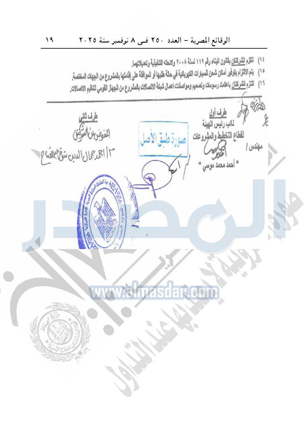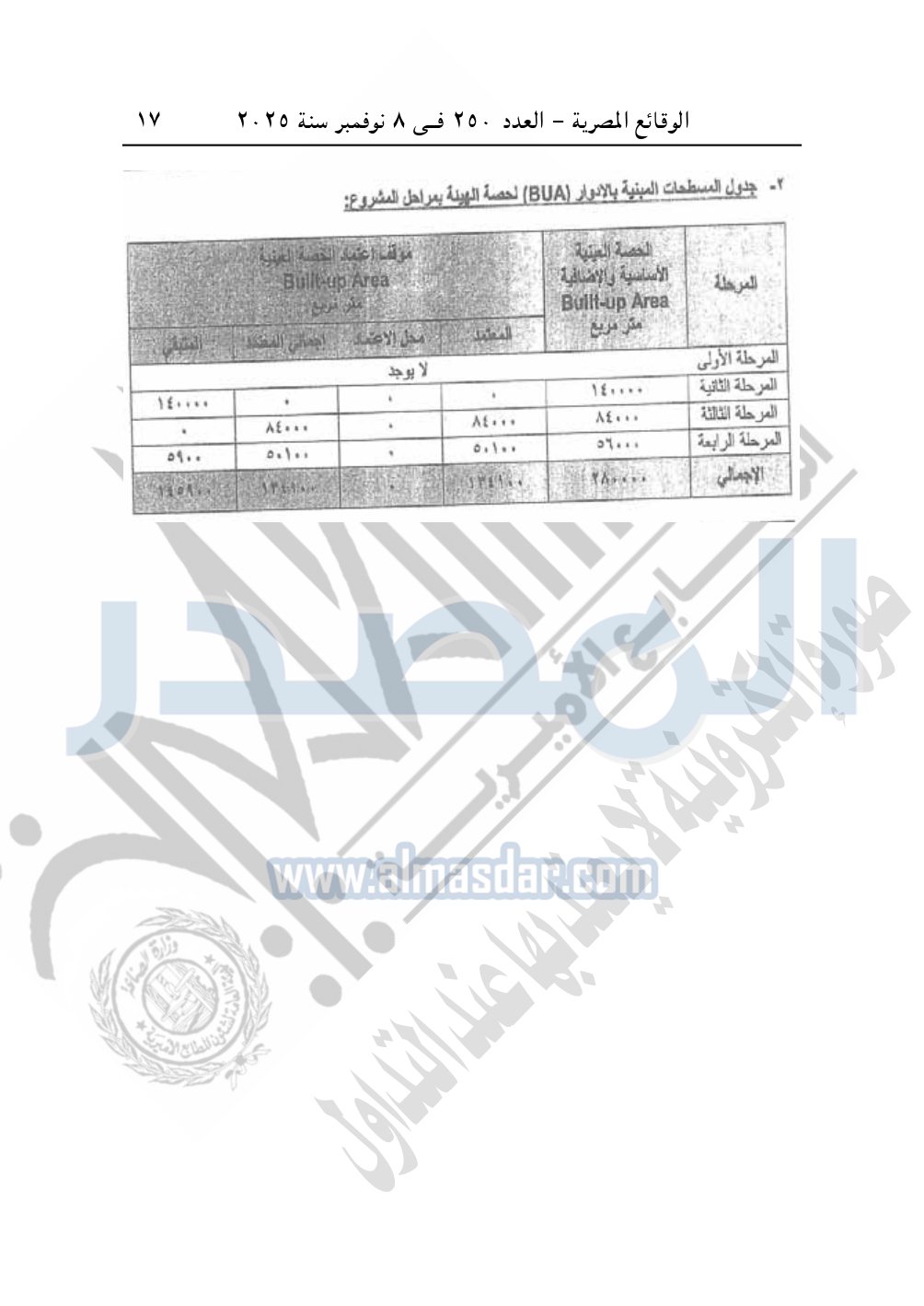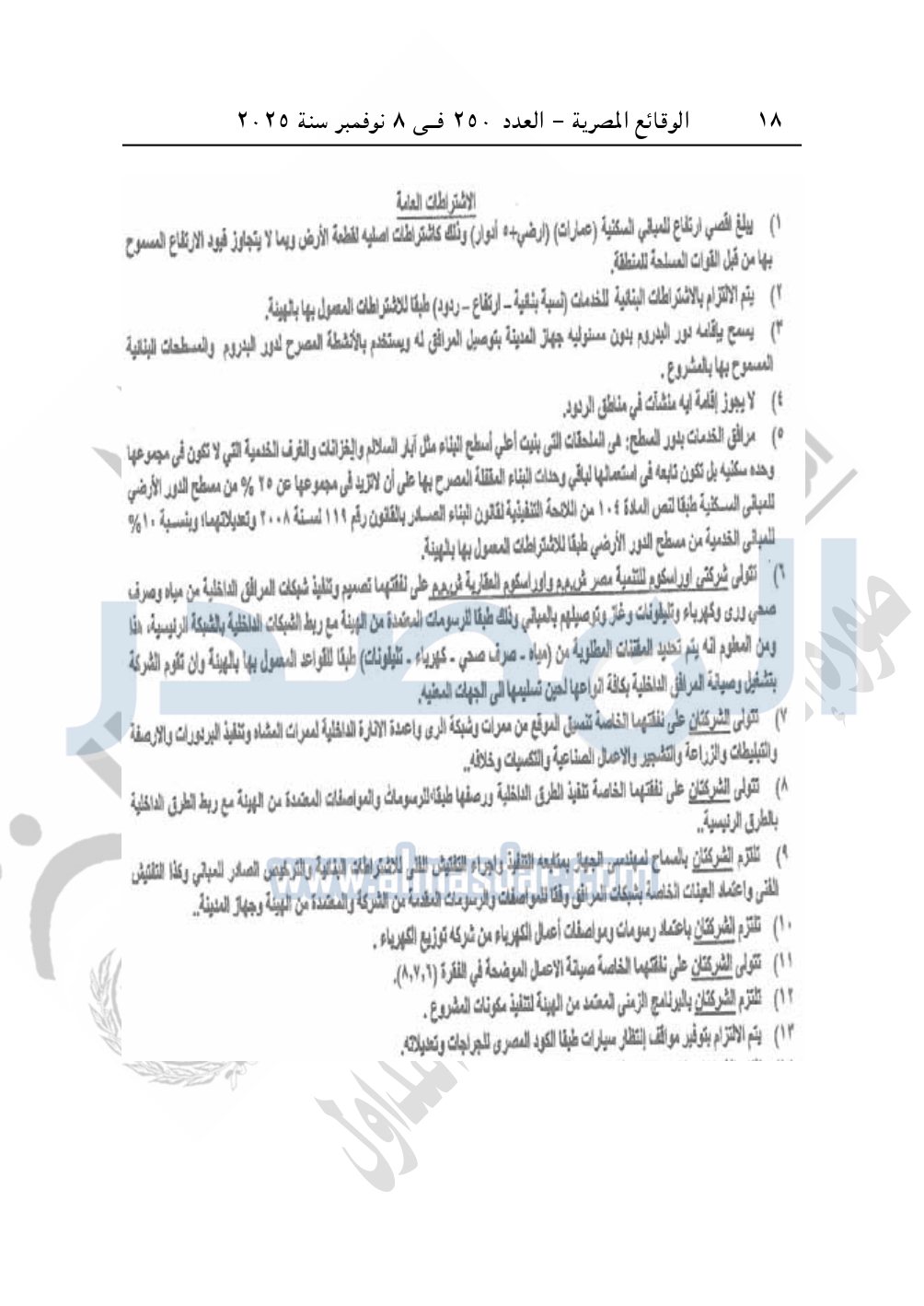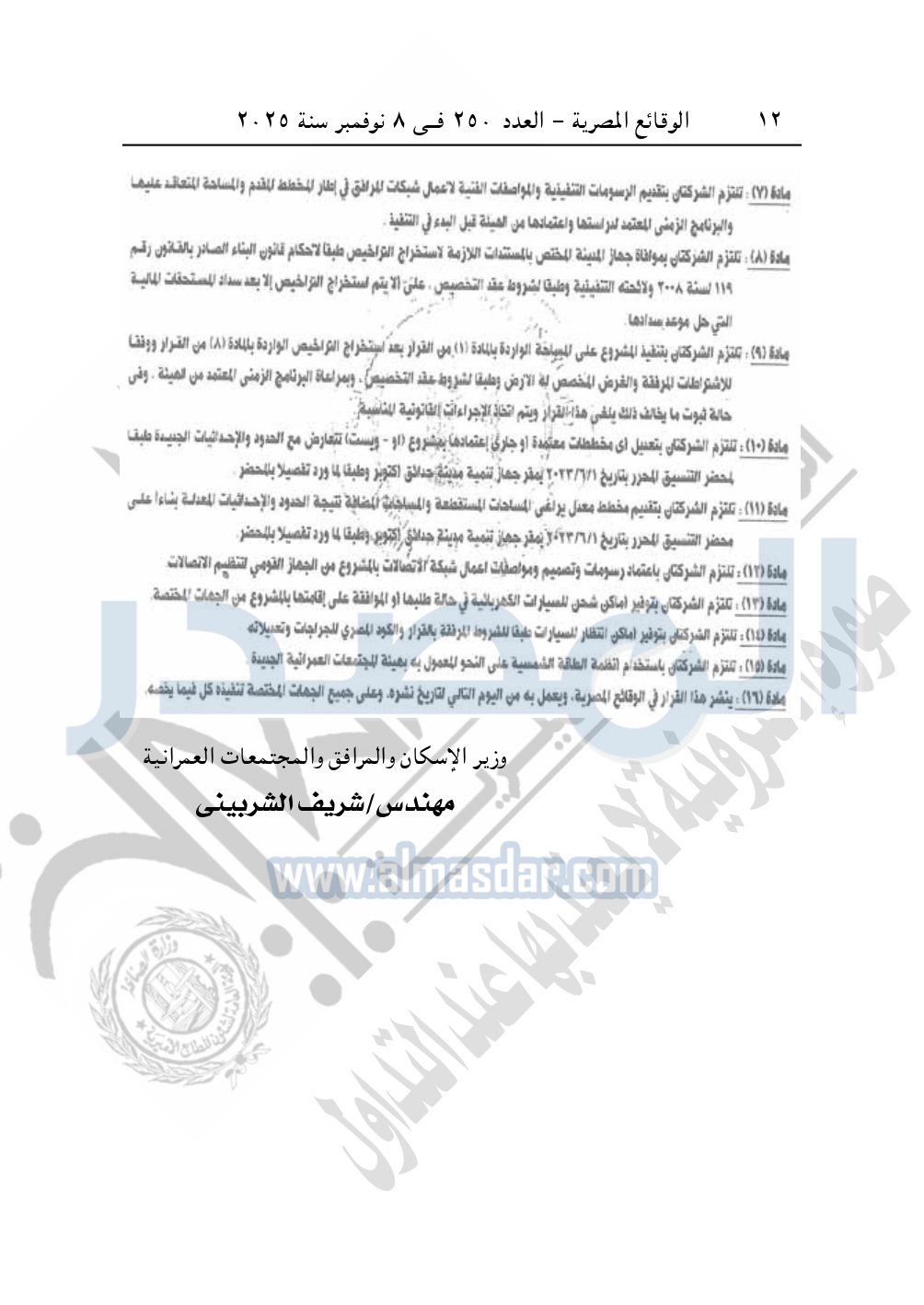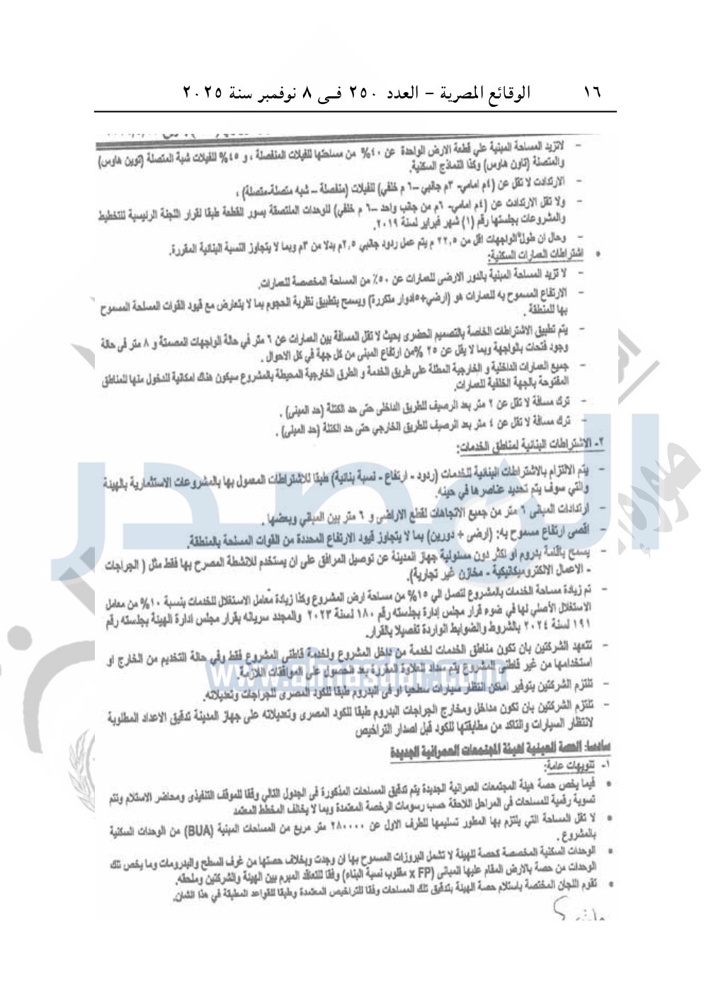 نشرت الوقائع المصرية في العدد 250 الصادر في 8 نوفمبر سنة 2025، وزارة الإسكان والمرافق والمجتمعات العمرانية، قرار وزاري رقم 199 لسنة 2025 بتاريخ 8-2-2025، باعتماد تعديل المخطط التفصيلي لمساحة 39.9 فدان بمنطقة الفيلات السكنية رقم "2-A" السابق اعتمادها بالقرار الوزاري رقم 837 لسنة 2023 بمساحة 161.94 فدان ضمن المرحلة الثانية من قطعة الأرض رقم "30/3" البالغ مساحتها 4230756.46 م2 بما يعادل 1007.32 فدان بمدينة حدائق أكتوبر المخصصة لشركتى/ أوراسكوم للتنمية مصر وأوراسكوم العقارية بالشراكة مع الهيئة لإقامة مشروع عمراني متكامل المعتمد بالقرار الوزاري رقم 387 لسنة 2019 والمعدل بالقراراين الوزاريين رقمي 458 لسنة 2021 و837 لسنة 2023.