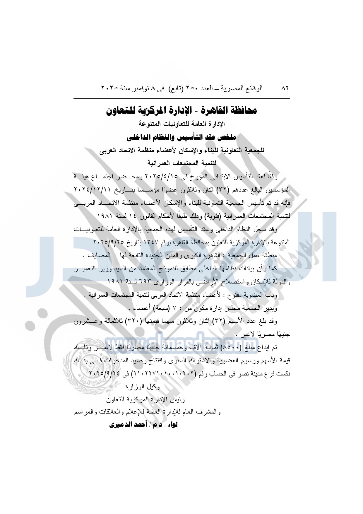 نشرت الوقائع المصرية في العدد 250 "تابع"، بتاريخ 8 نوفمبر 2025، قرار محافظة القاهرة، الإدارة المركزية للتعاون الإدارة العامة للتعاونيات المتنوعة، بشأن ملخص عقد التأسيس والنظام الداخلى للجمعية التعاونية للبناء والإسكان لأعضاء منظمة الاتحاد العربي لتنمية المجتمعات العمرانية.