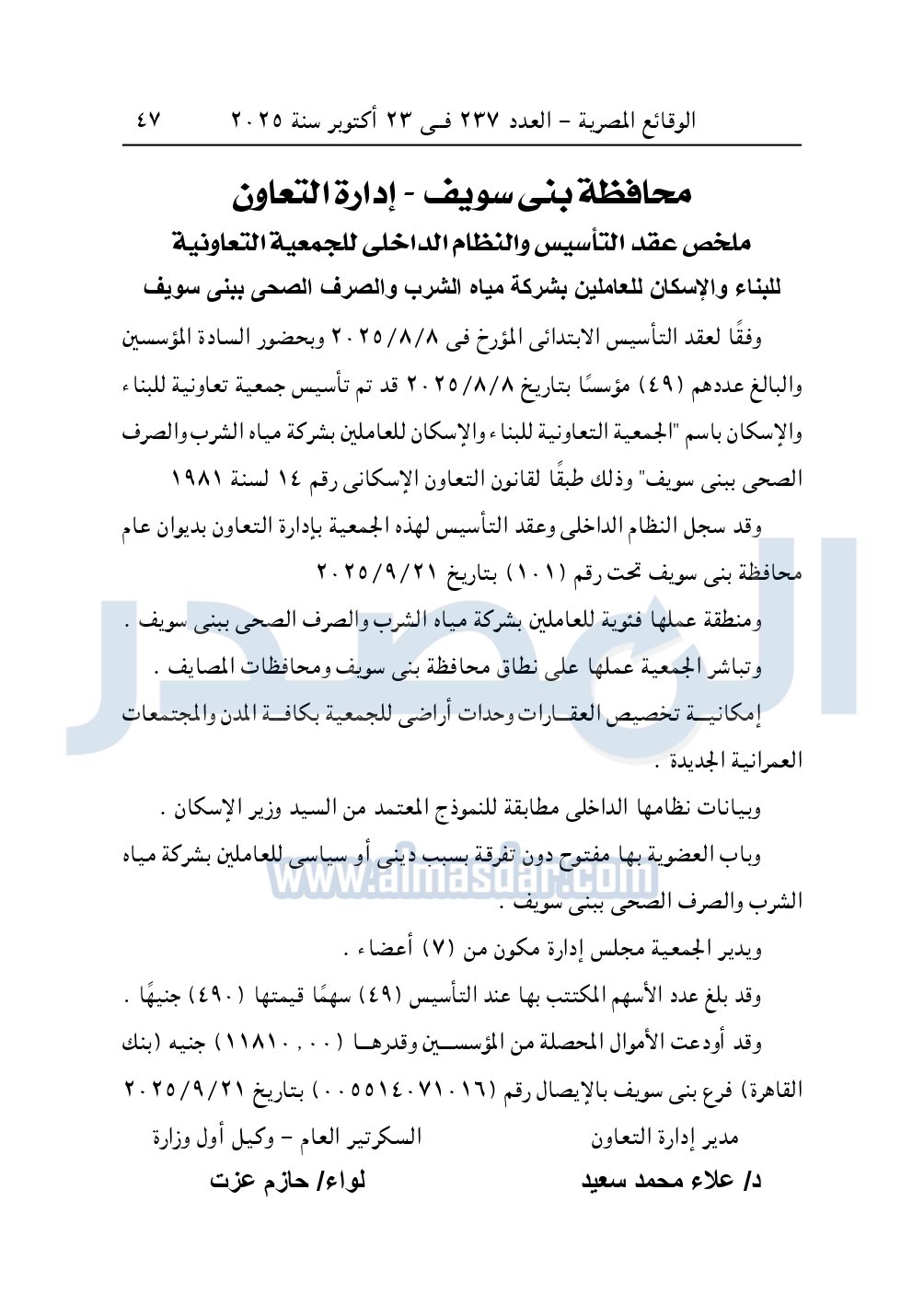 كما نشرت الوقائع المصرية في العدد 237، بتاريخ 23 أكتوبر 2025، قرار محافظة بني سويف، إدارة التعاون، بشأن ملخص عقد التأسيس والنظام الداخلى للجمعية التعاونية للبناء والإسكان للعاملين بشركة مياه الشرب والصرف الصحى ببنى سويف.
