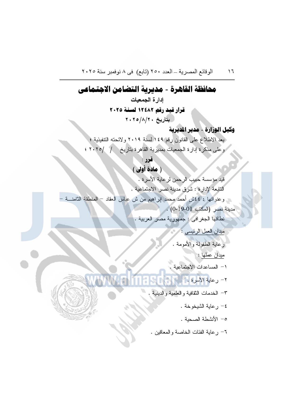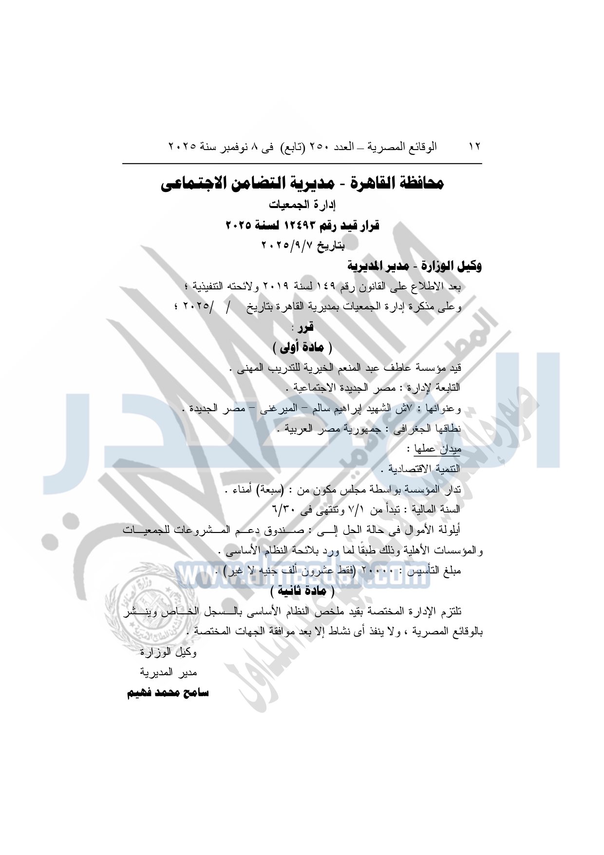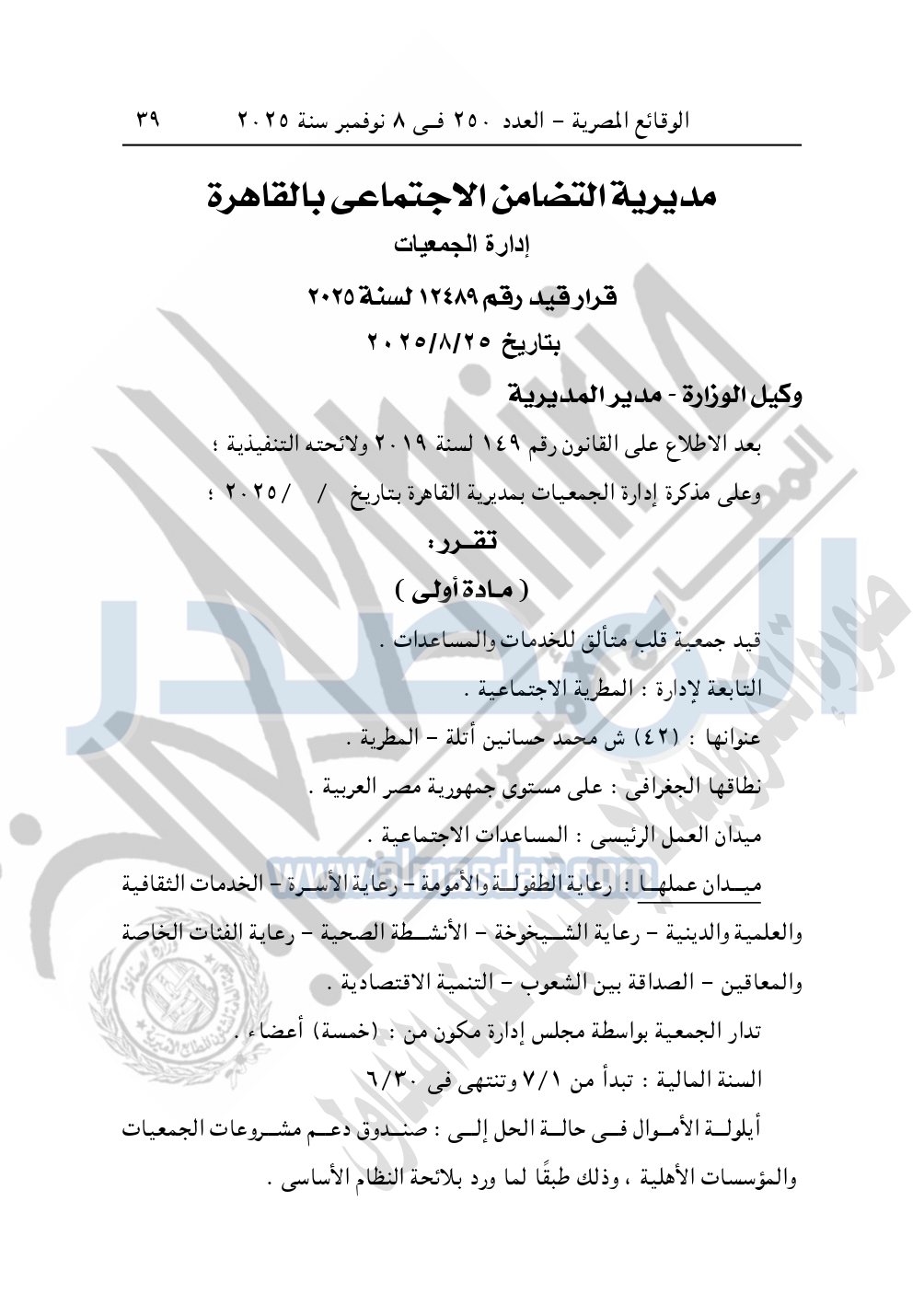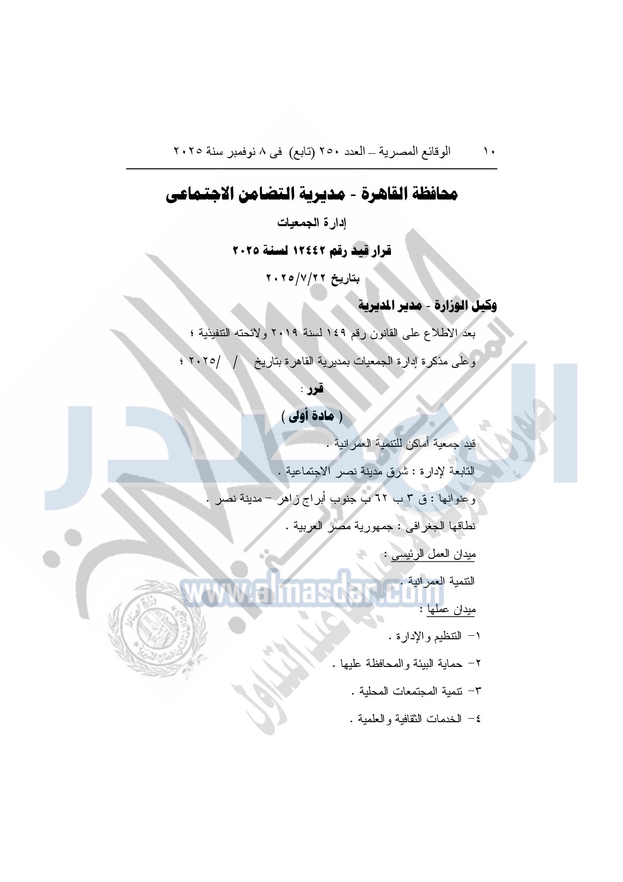 كما نشرت الوقائع المصرية في العدد 250 "تابع" الصادر في 8 نوفمبر سنة 2025، محافظة القاهرة – مديرية التضامن الاجتماعي، إدارة الجمعيات، قرار قيد رقم 12442 لسنة 2025، بتاريخ 22-7-2025.