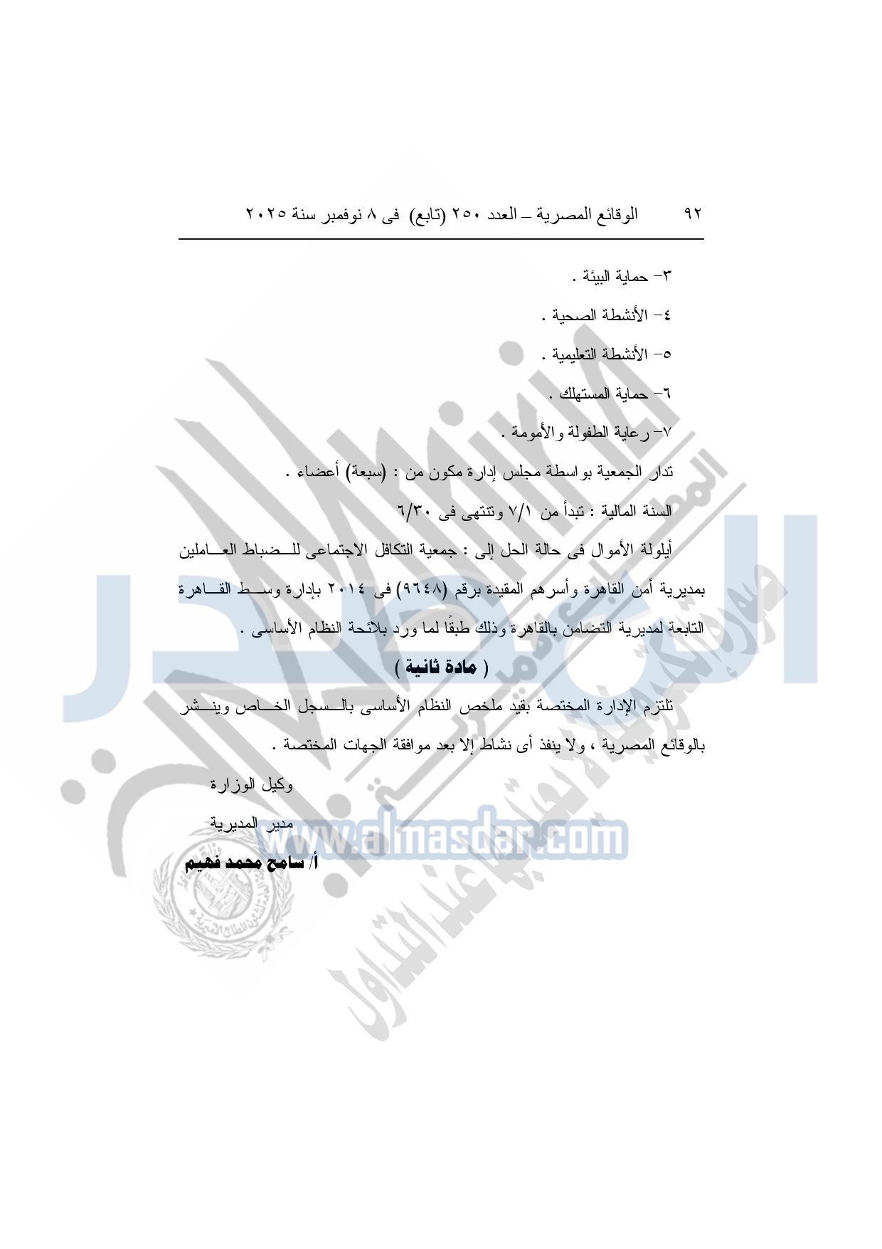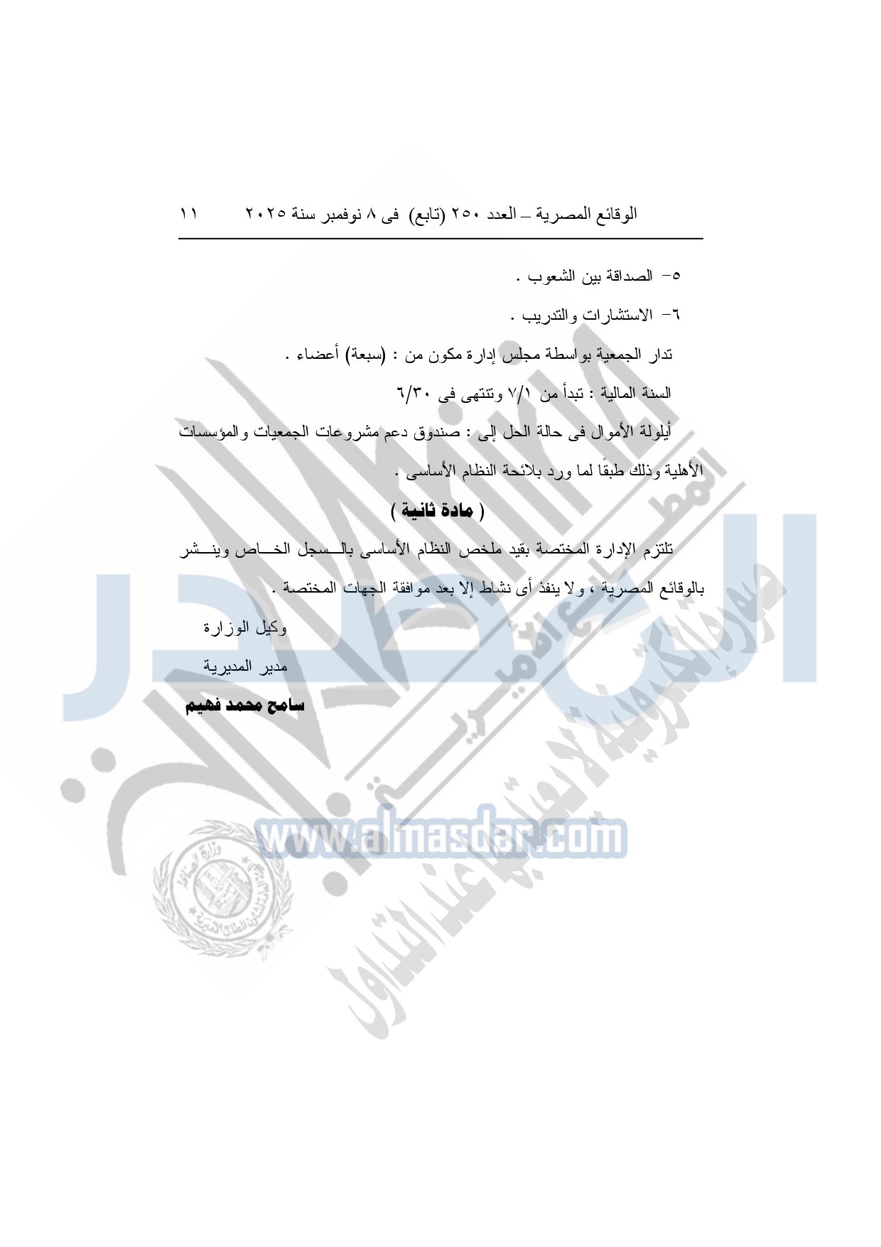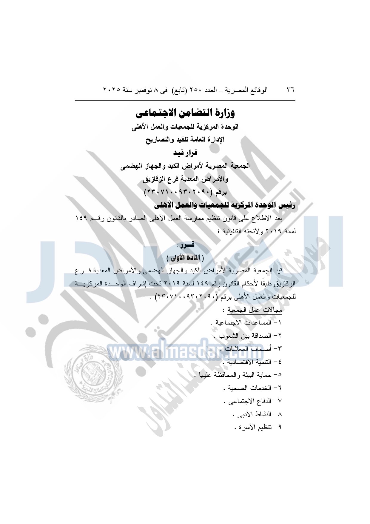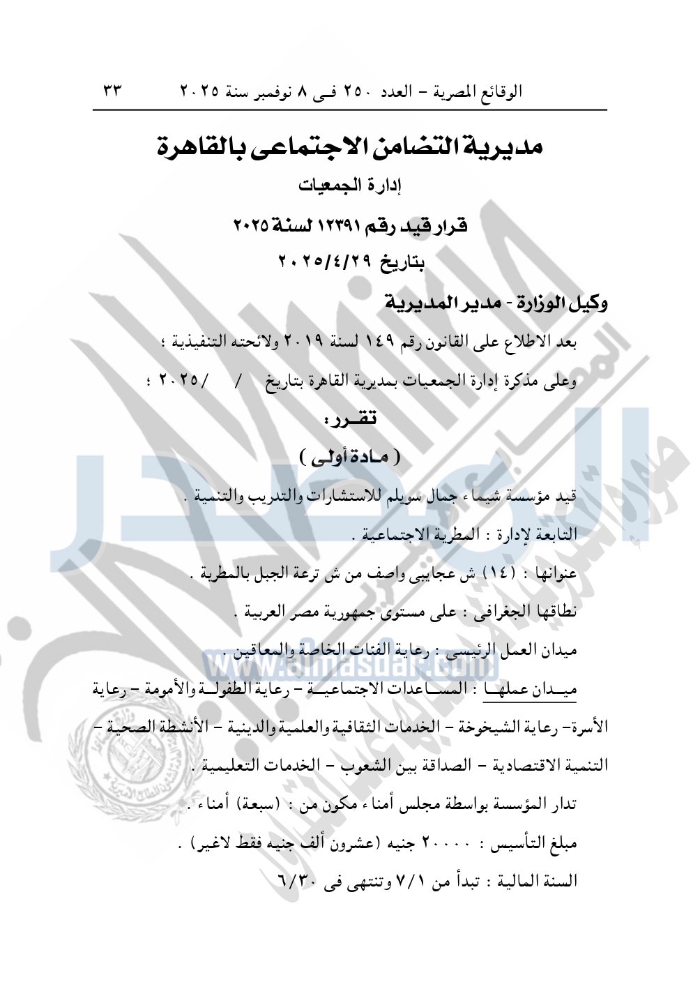 كما نشرت الوقائع المصرية في العدد 250 "تابع" الصادر في 8 نوفمبر سنة 2025، محافظة القاهرة – مديرية التضامن الاجتماعي، إدارة الجمعيات، قرار قيد رقم 12442 لسنة 2025، بتاريخ 22-7-2025.