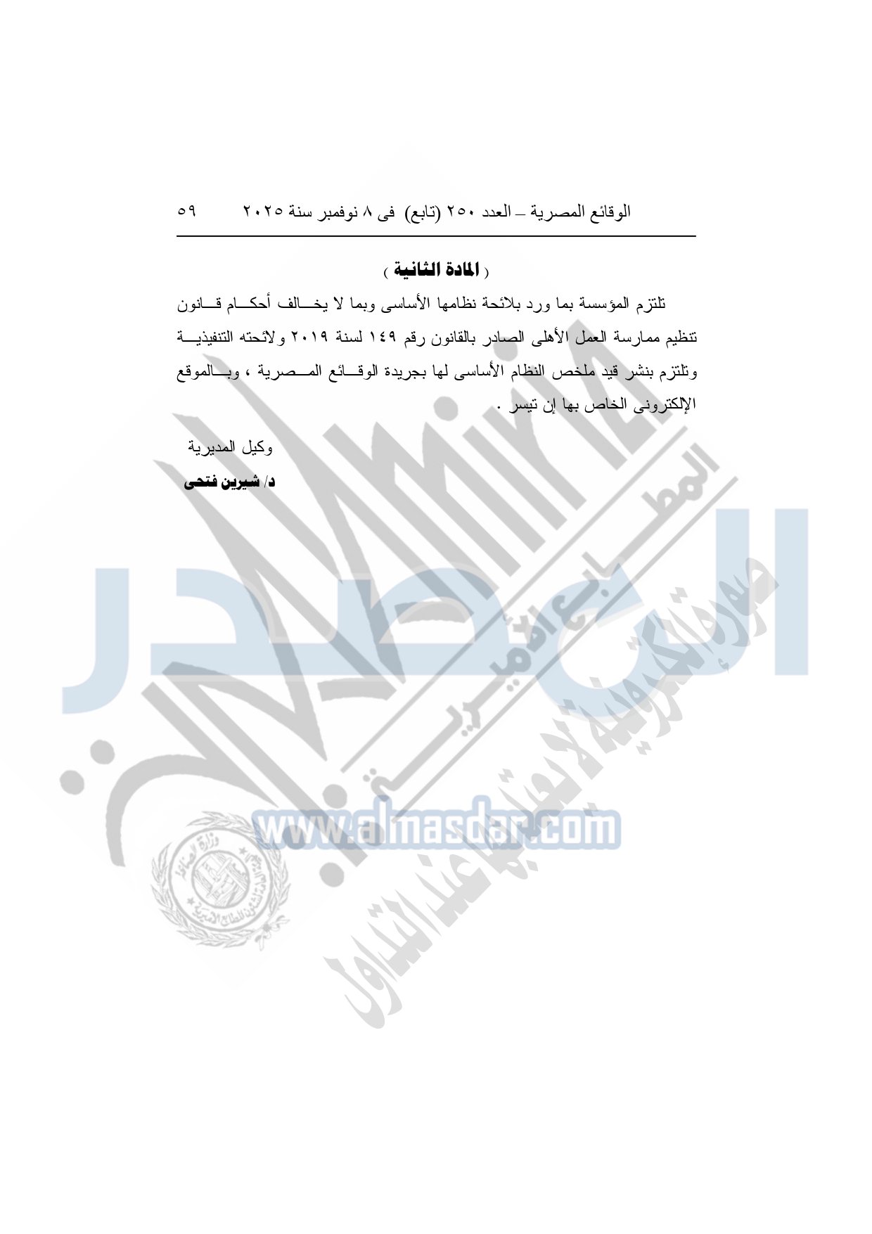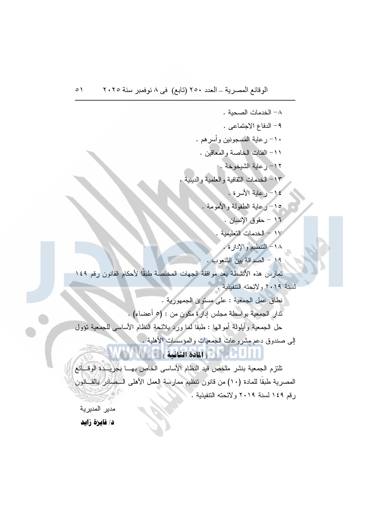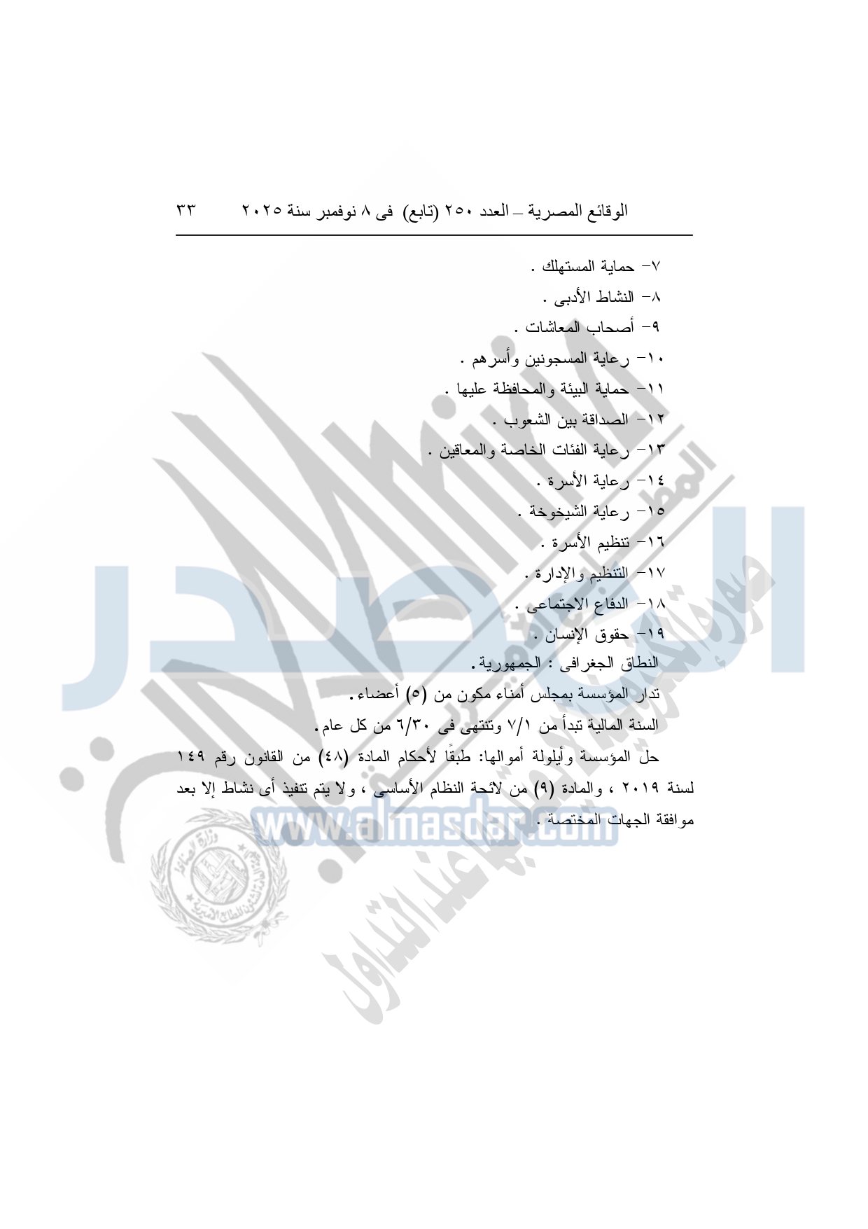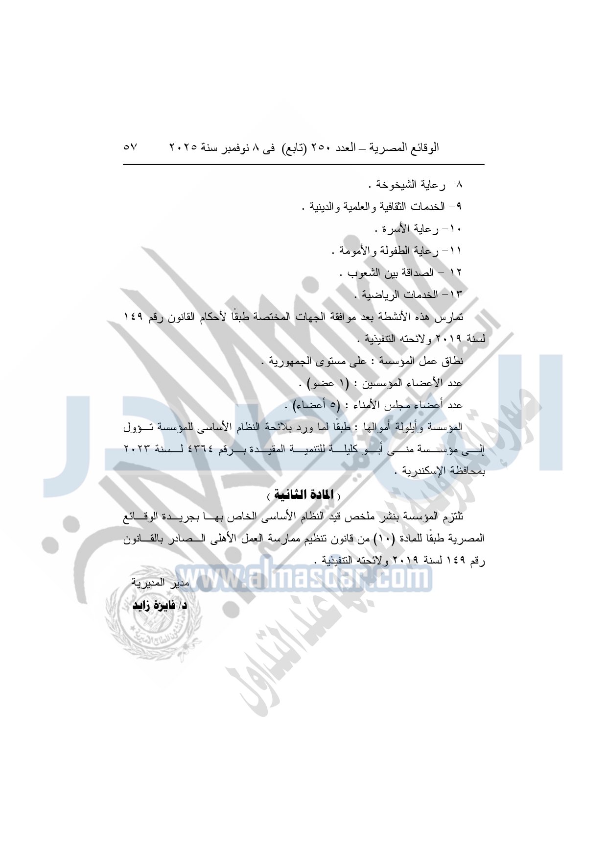 كما نشرت الوقائع المصرية في العدد 250 "تابع" الصادر في 8 نوفمبر سنة 2025، محافظة القاهرة – مديرية التضامن الاجتماعي، إدارة الجمعيات، قرار قيد رقم 12442 لسنة 2025، بتاريخ 22-7-2025.