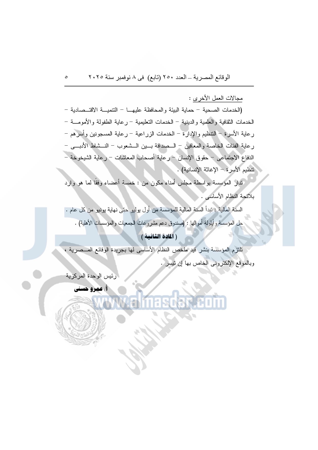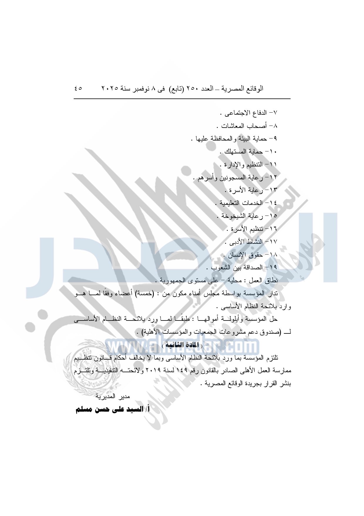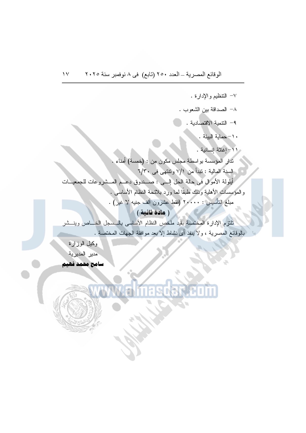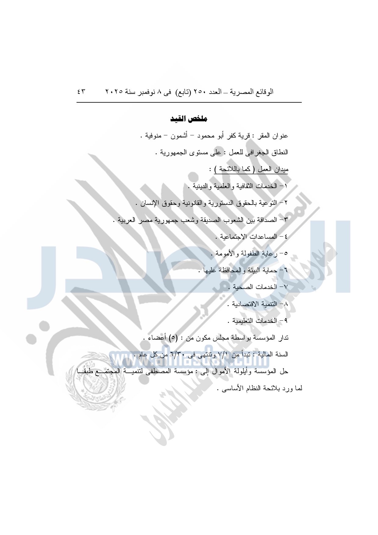 كما نشرت الوقائع المصرية في العدد 250 "تابع" الصادر في 8 نوفمبر سنة 2025، محافظة المنوفية – مديرية التضامن الاجتماعي، إدارة الجمعيات والاتحادات، قرار قيد رقم 2387 لسنة 2025، بتاريخ 17-8-2025.
