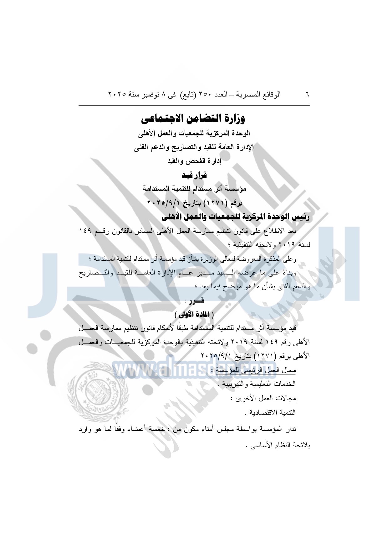 كما نشرت الوقائع المصرية في العدد 250 "تابع" الصادر في 8 نوفمبر سنة 2025، وزارة التضامن الاجتماعي الوحدة المركزية للجمعيات والعمل الاهلي، الإدارة العامة للقيد والتصاريح والدعم الفني، إدارة الفحص والقيد، قرار قيد مؤسسة أثر مستدام للتنمية المستدامة برقم "1271" بتاريخ 1-9-2025.