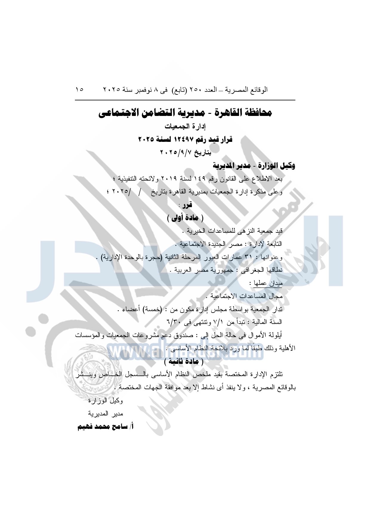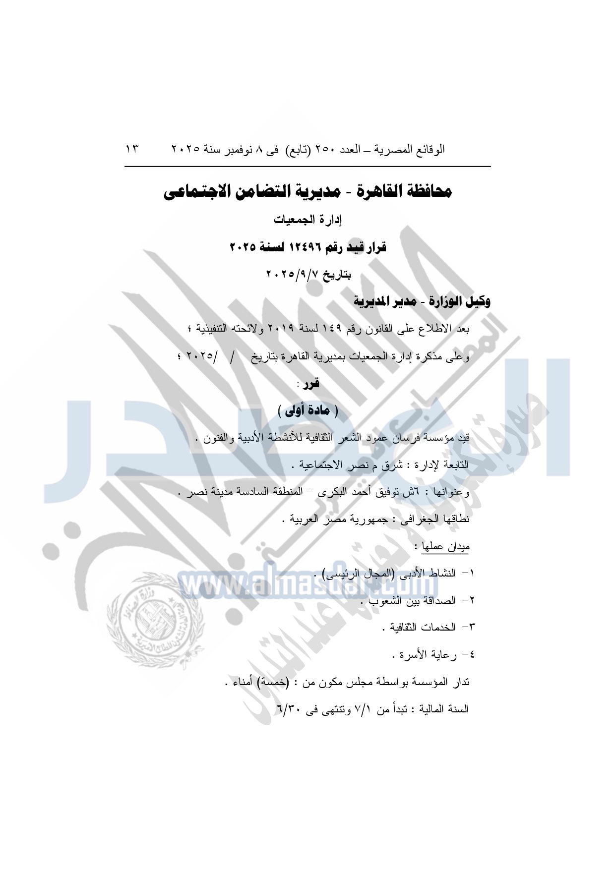ونشرت الوقائع المصرية في العدد 250 "تابع" الصادر في 8 نوفمبر سنة 2025، محافظة القاهرة – مديرية التضامن الاجتماعي، إدارة الجمعيات، قرار قيد رقم 12497 لسنة 2025، بتاريخ 7-9-2025.