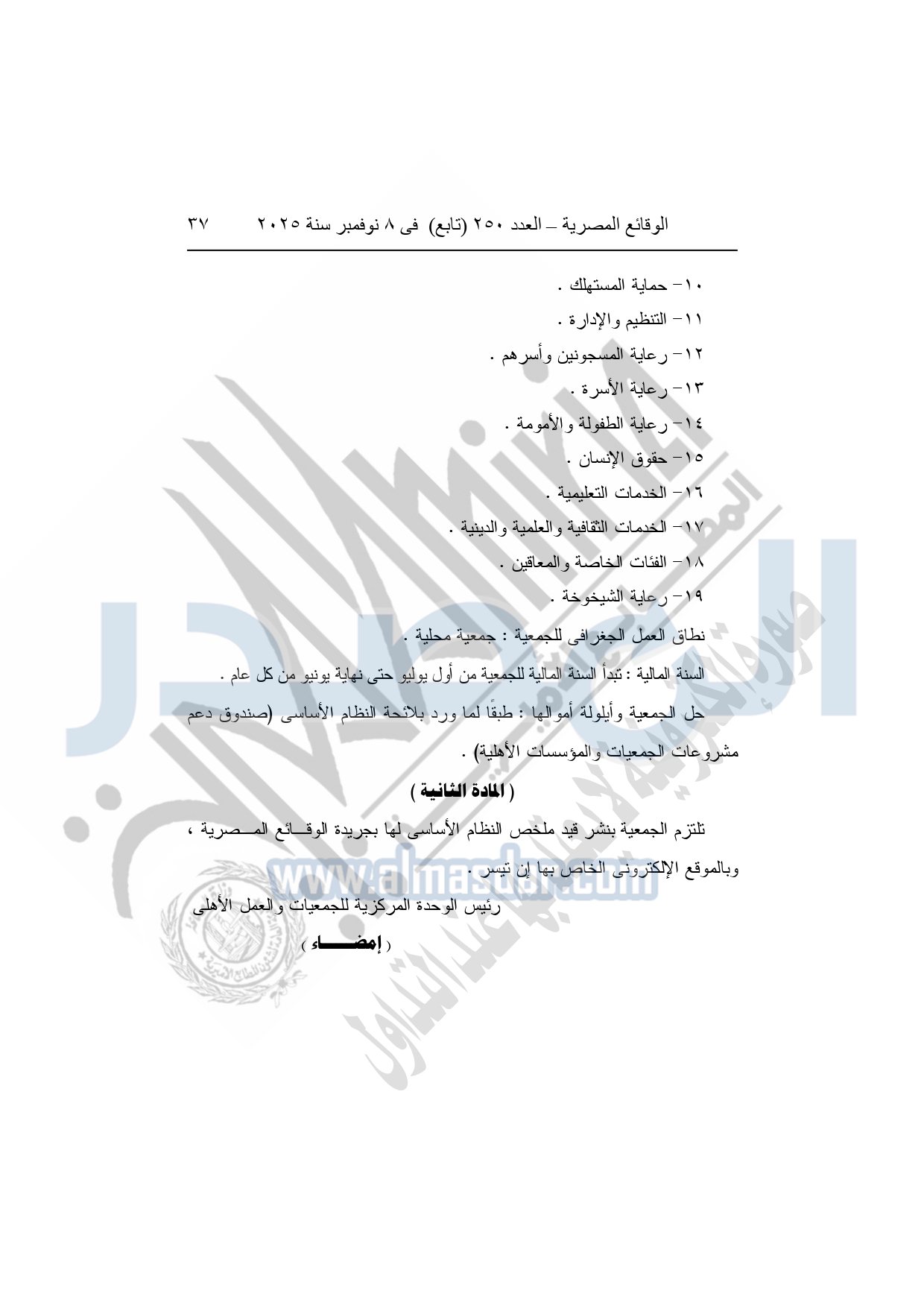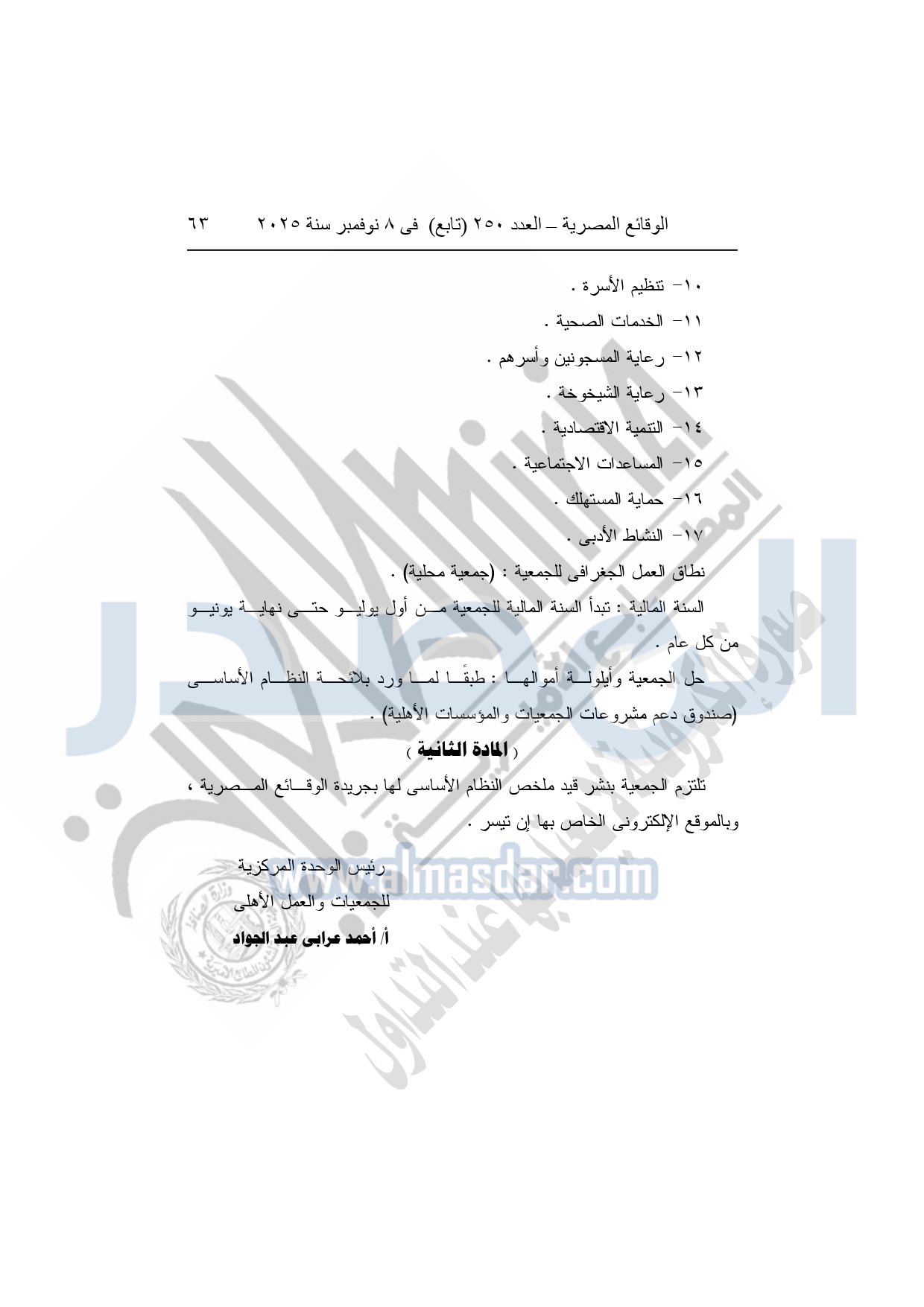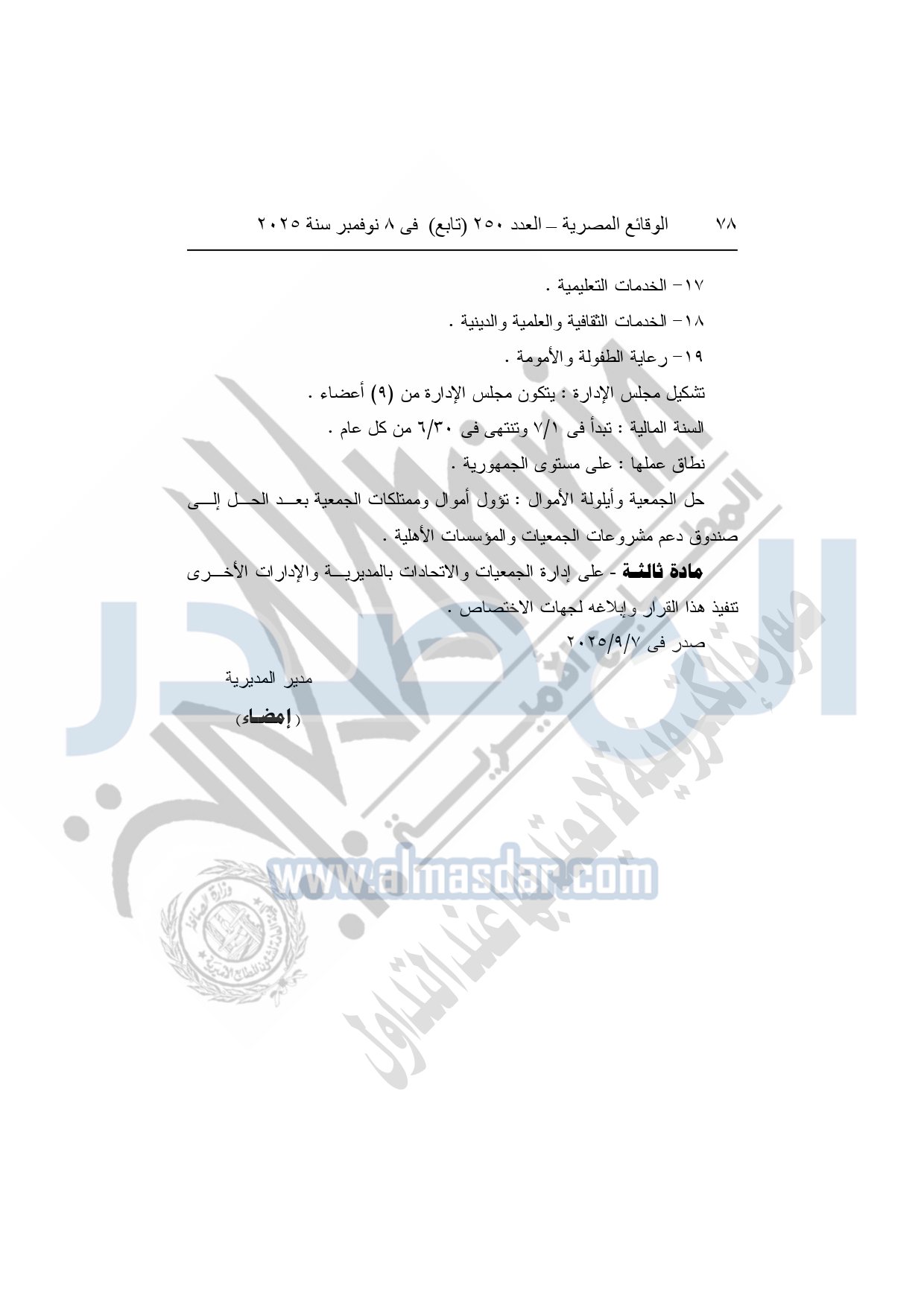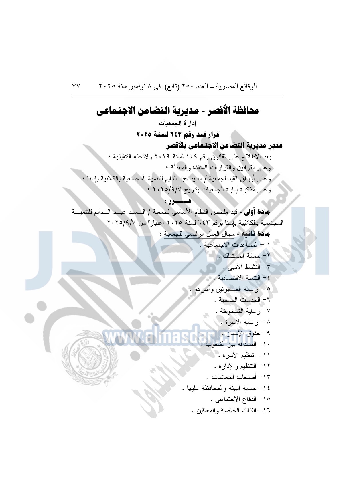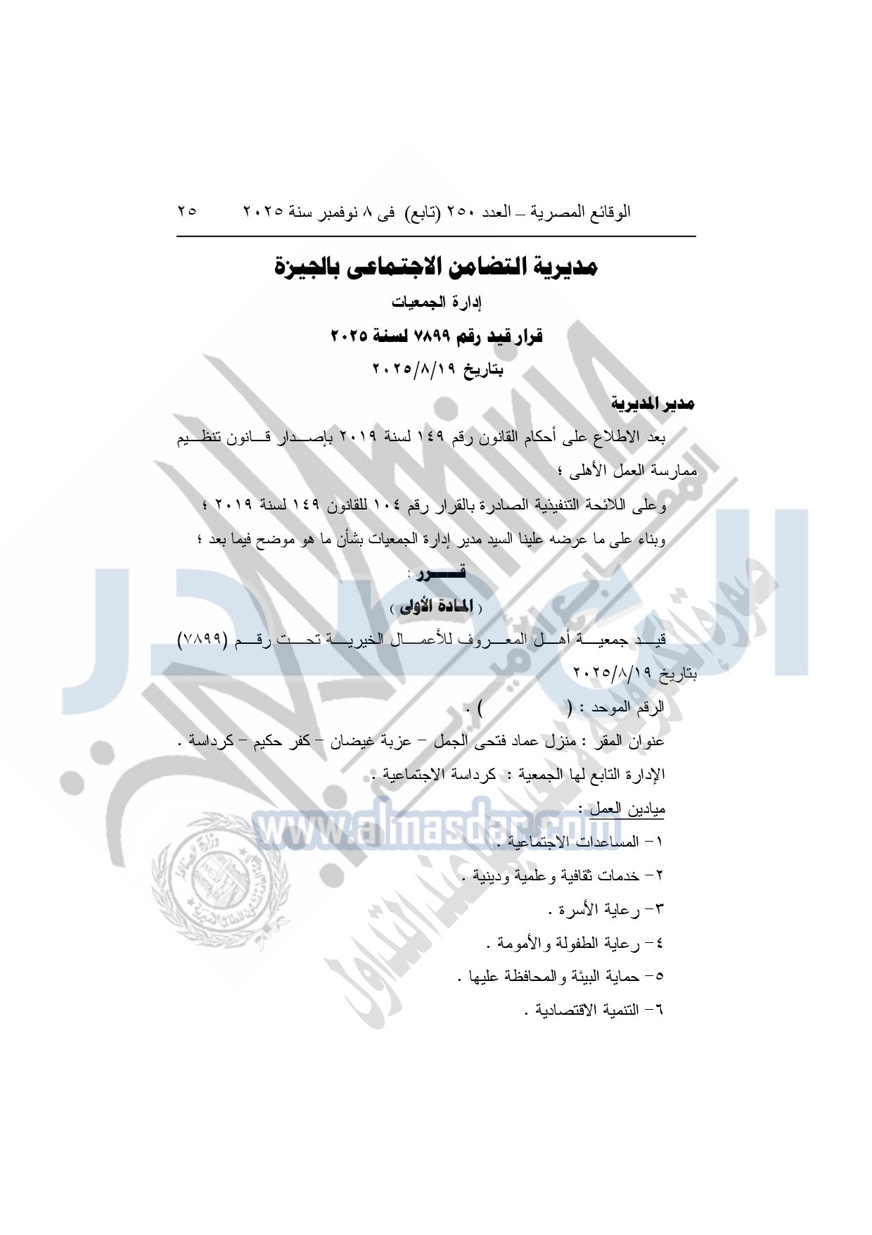 ونشرت الوقائع المصرية في العدد 250 "تابع" الصادر في 8 نوفمبر سنة 2025، مديرية التضامن الاجتماعي بالجيزة، إدارة الجمعيات، قرار قيد رقم 7899 لسنة 2025، بتاريخ 19-8- 2025.