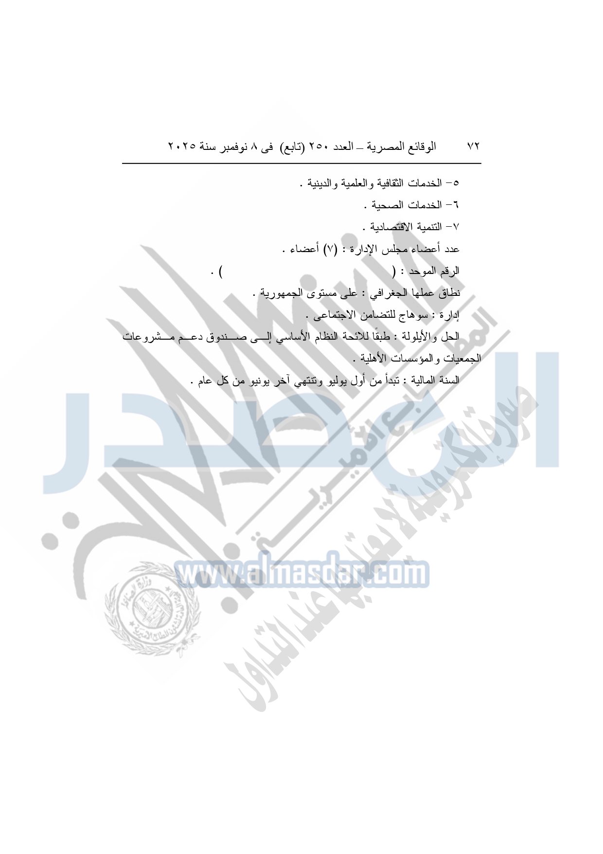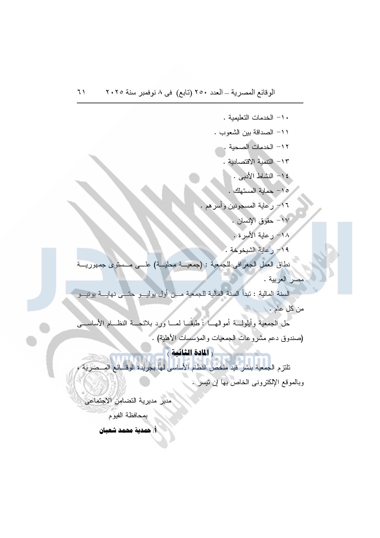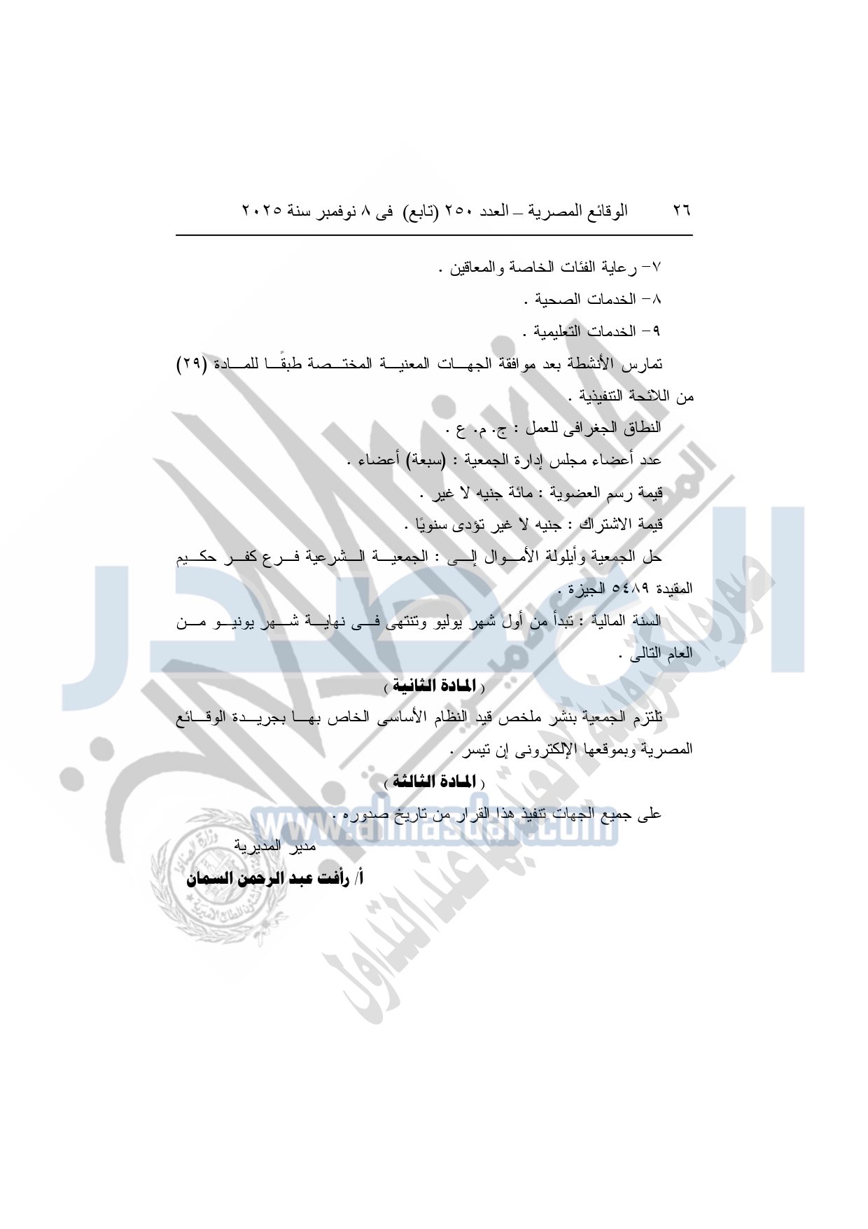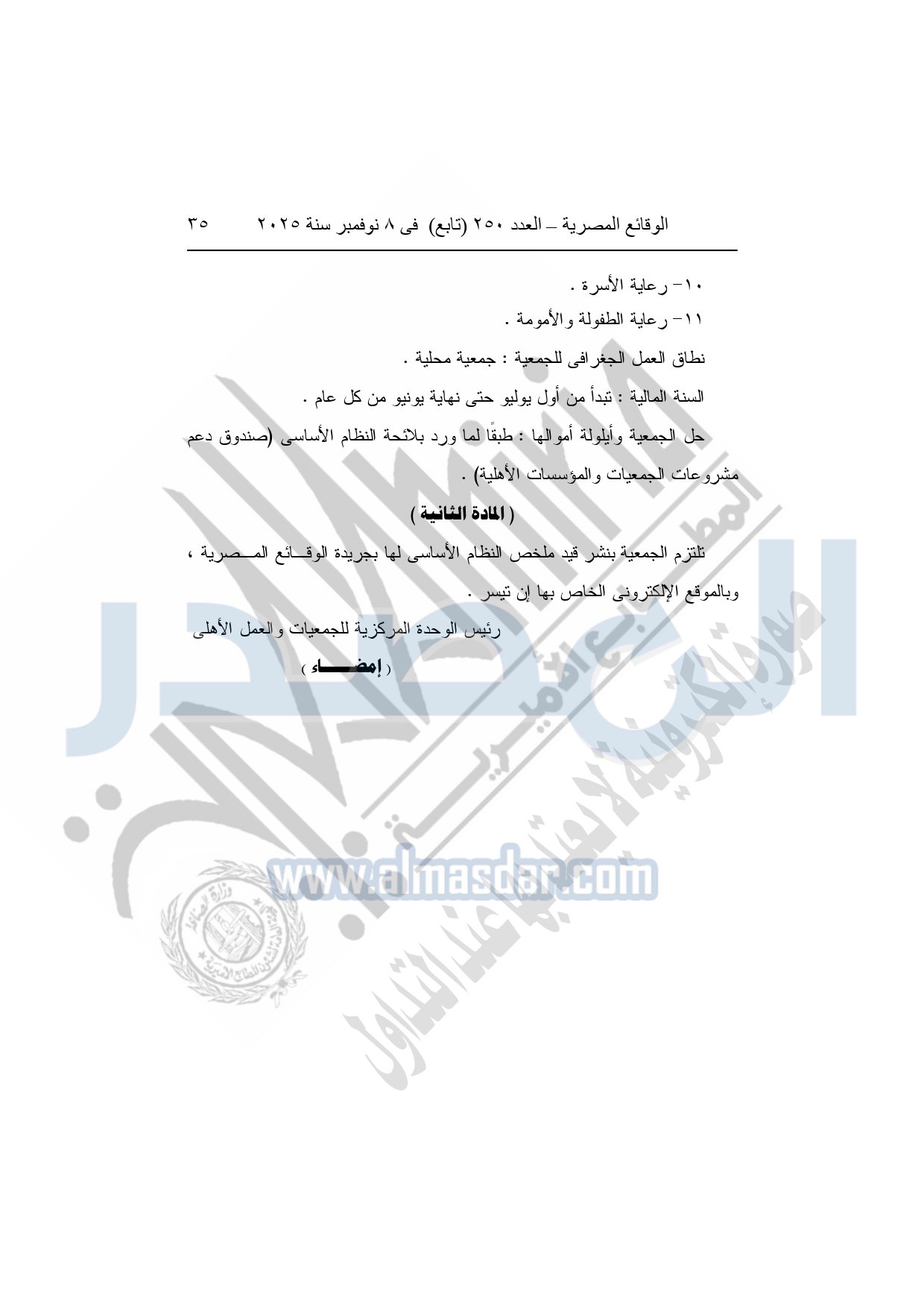 ونشرت الوقائع المصرية في العدد 250 "تابع" الصادر في 8 نوفمبر سنة 2025، مديرية التضامن الاجتماعي بالجيزة، إدارة الجمعيات، قرار قيد رقم 7899 لسنة 2025، بتاريخ 19-8- 2025.