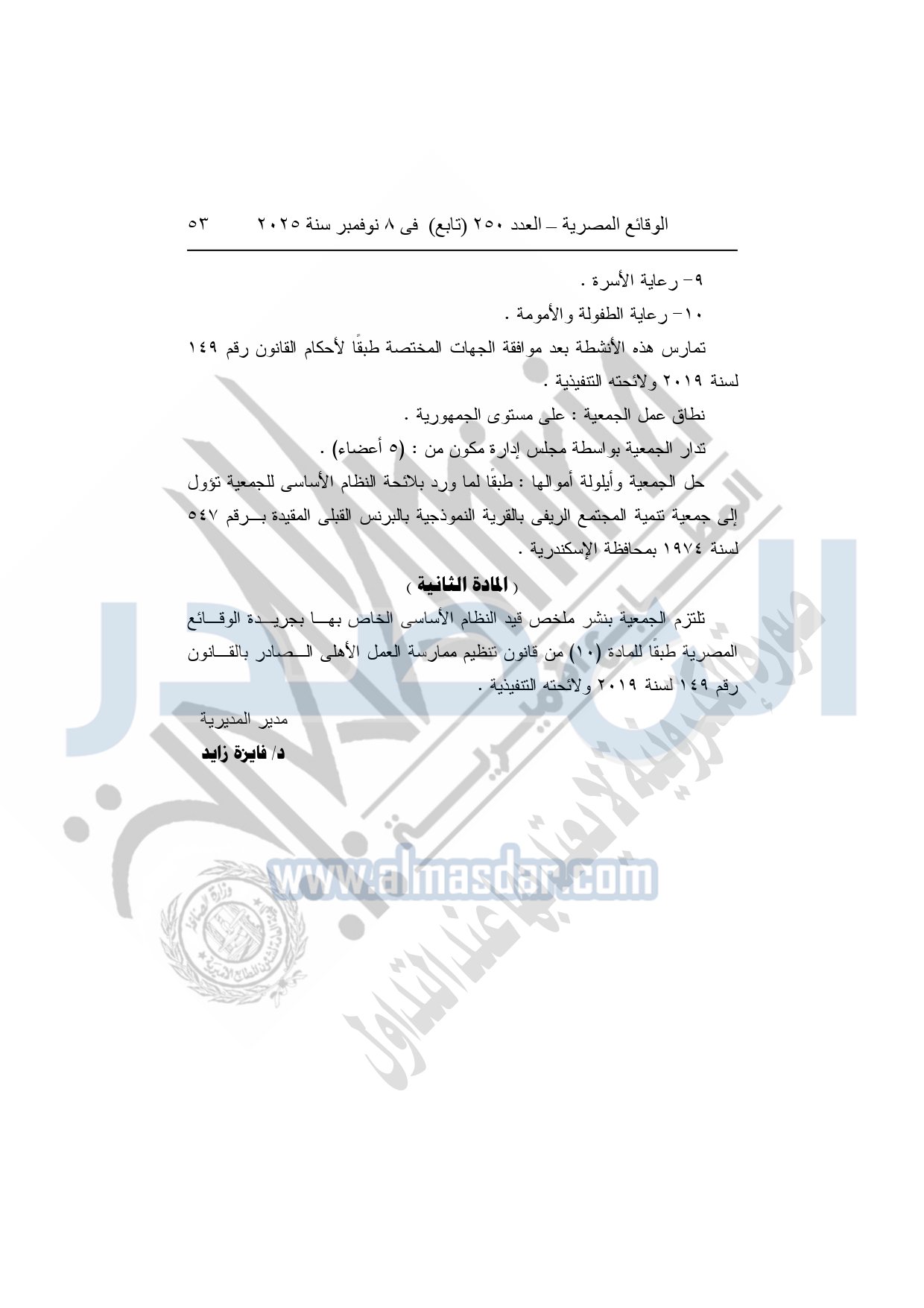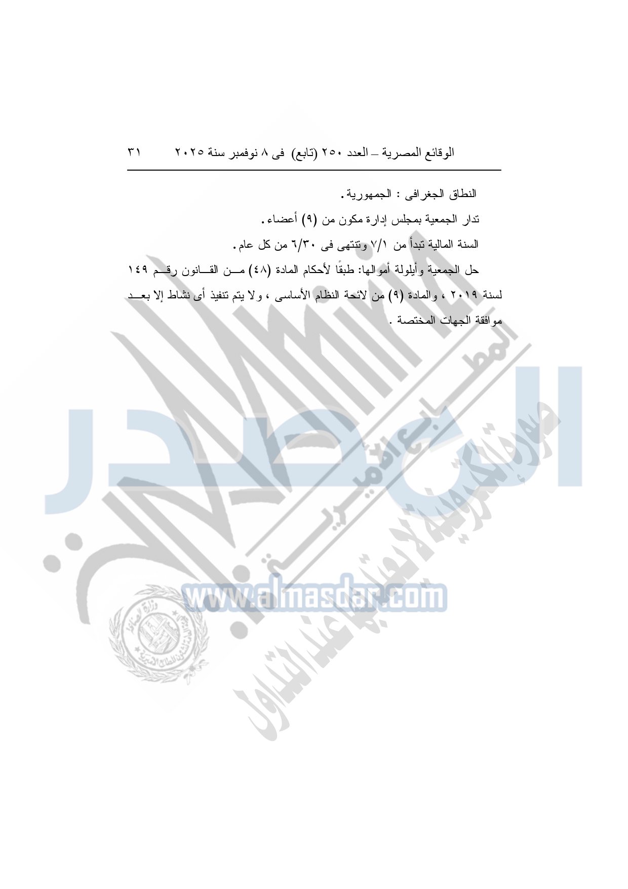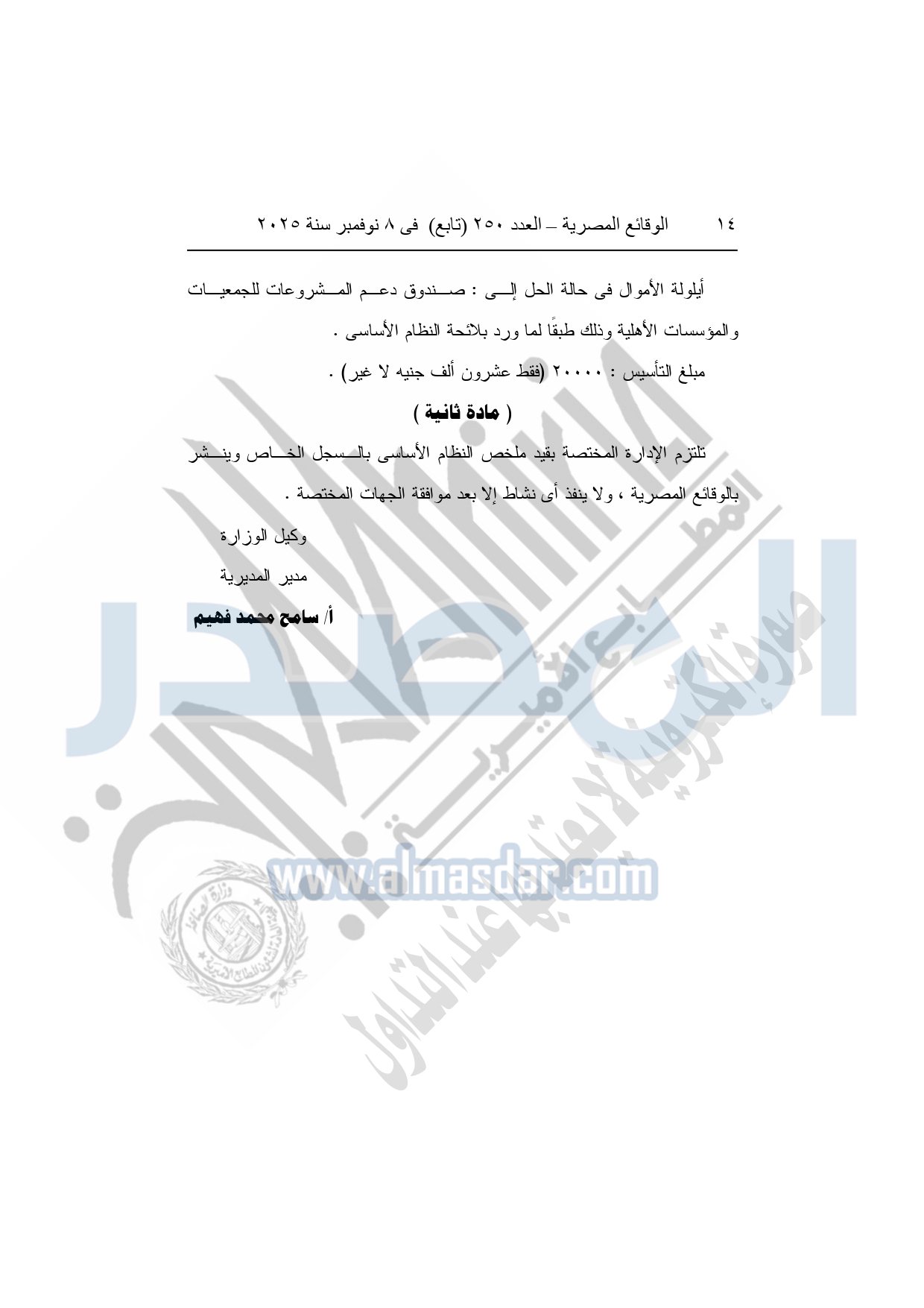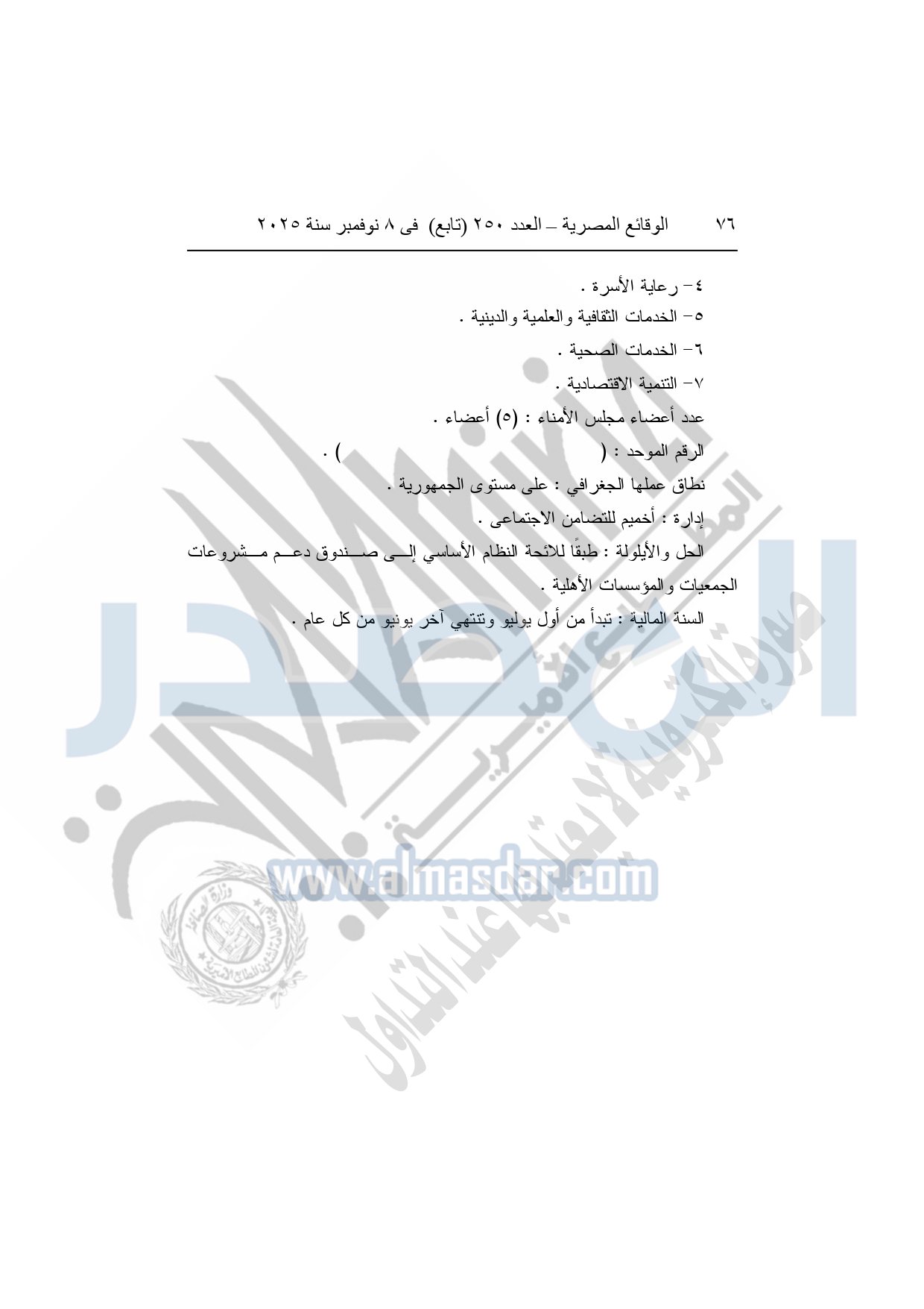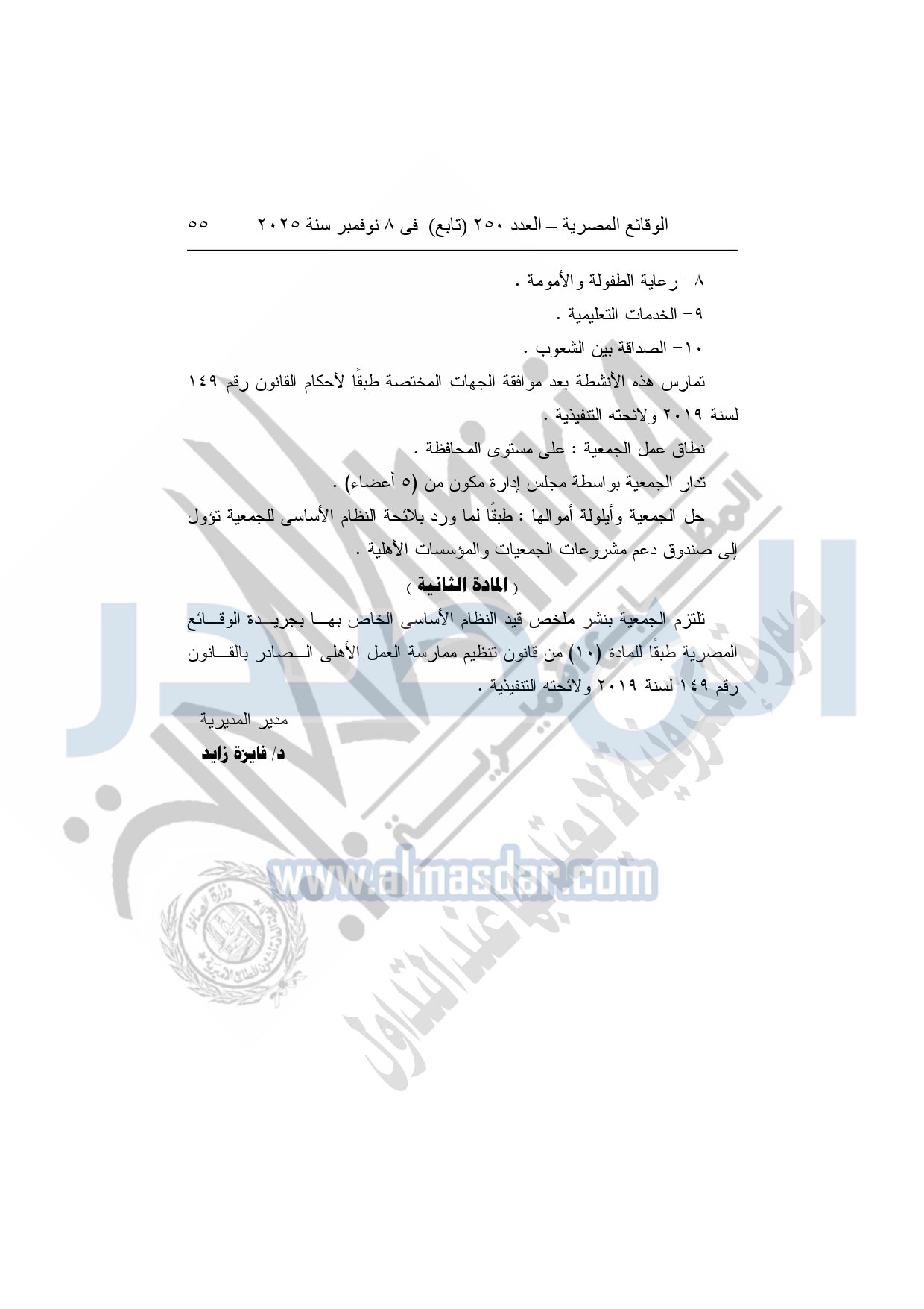 ونشرت الوقائع المصرية في العدد 250 "تابع" الصادر في 8 نوفمبر سنة 2025، مديرية التضامن الاجتماعي بالجيزة، إدارة الجمعيات، قرار قيد رقم 7899 لسنة 2025، بتاريخ 19-8- 2025.