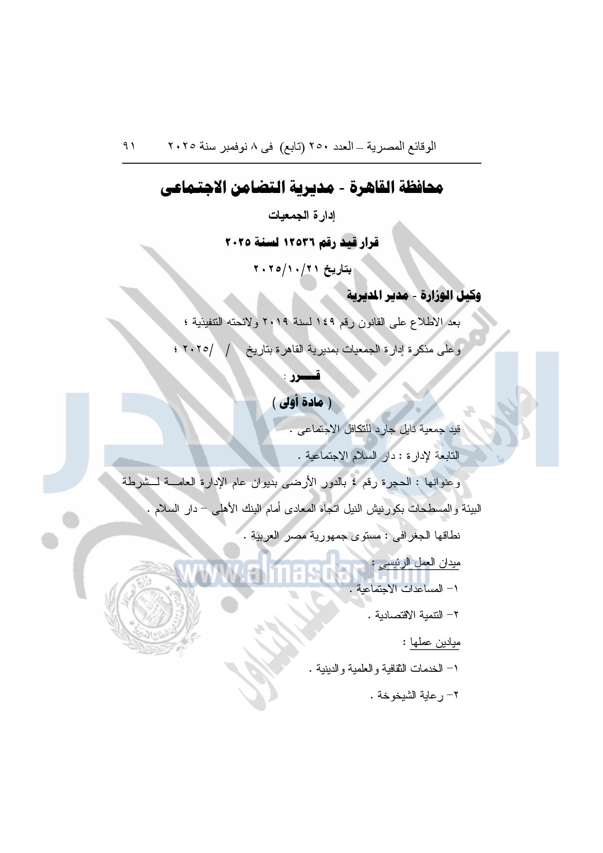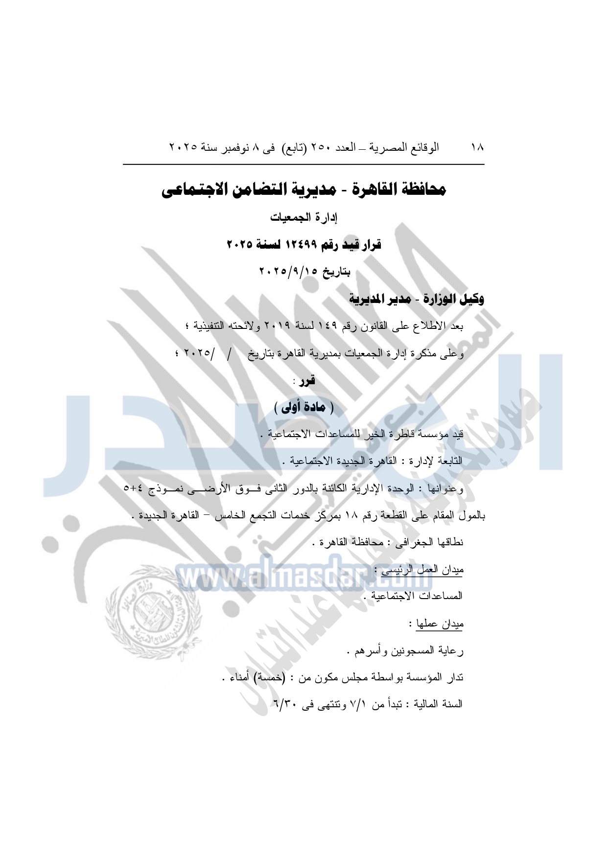 ونشرت الوقائع المصرية في العدد 250 "تابع" الصادر في 8 نوفمبر سنة 2025، محافظة القاهرة – مديرية التضامن الاجتماعي، إدارة الجمعيات، قرار قيد رقم 12499 لسنة 2025، بتاريخ 15-9-2025.