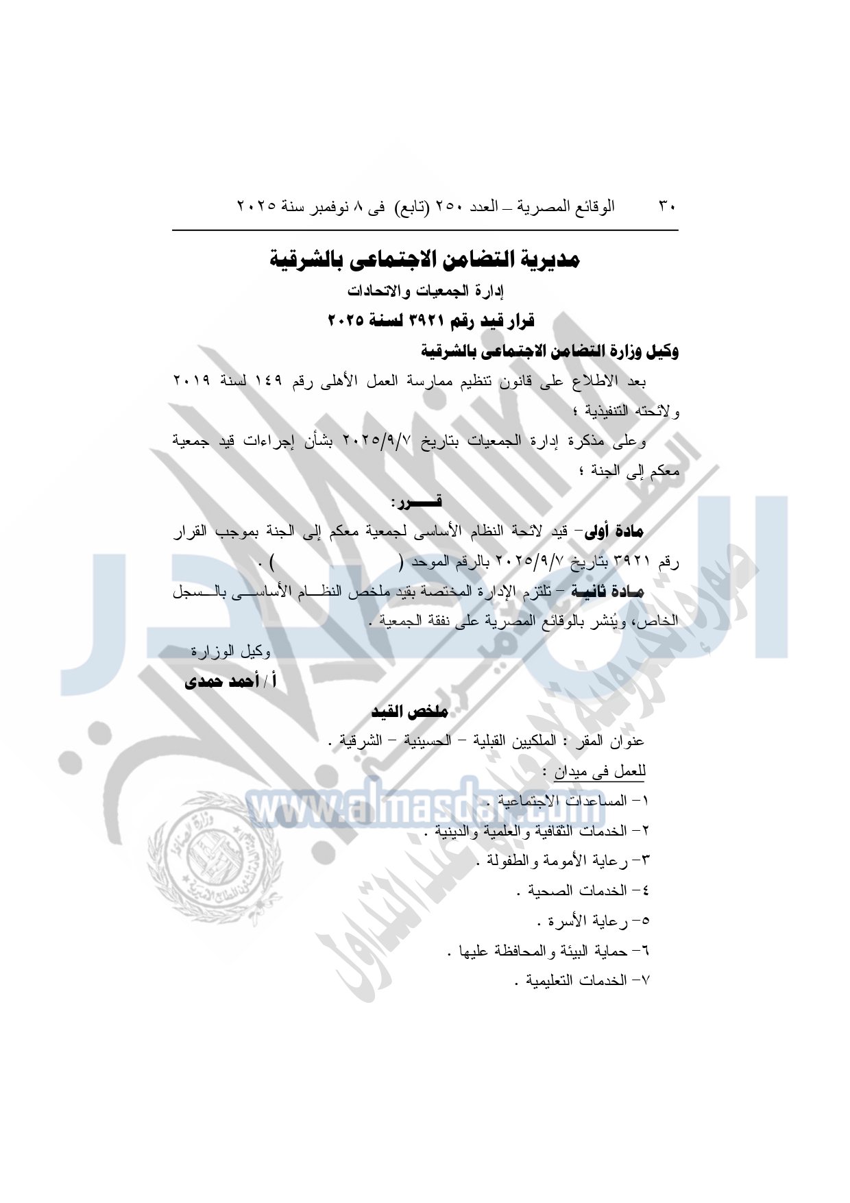 ونشرت الوقائع المصرية في العدد 250 "تابع" الصادر في 8 نوفمبر سنة 2025، مديرية التضامن الاجتماعي بالشرقية، إدارة الجمعيات والاتحادات، قرار قيد رقم 3921 لسنة 2025.
