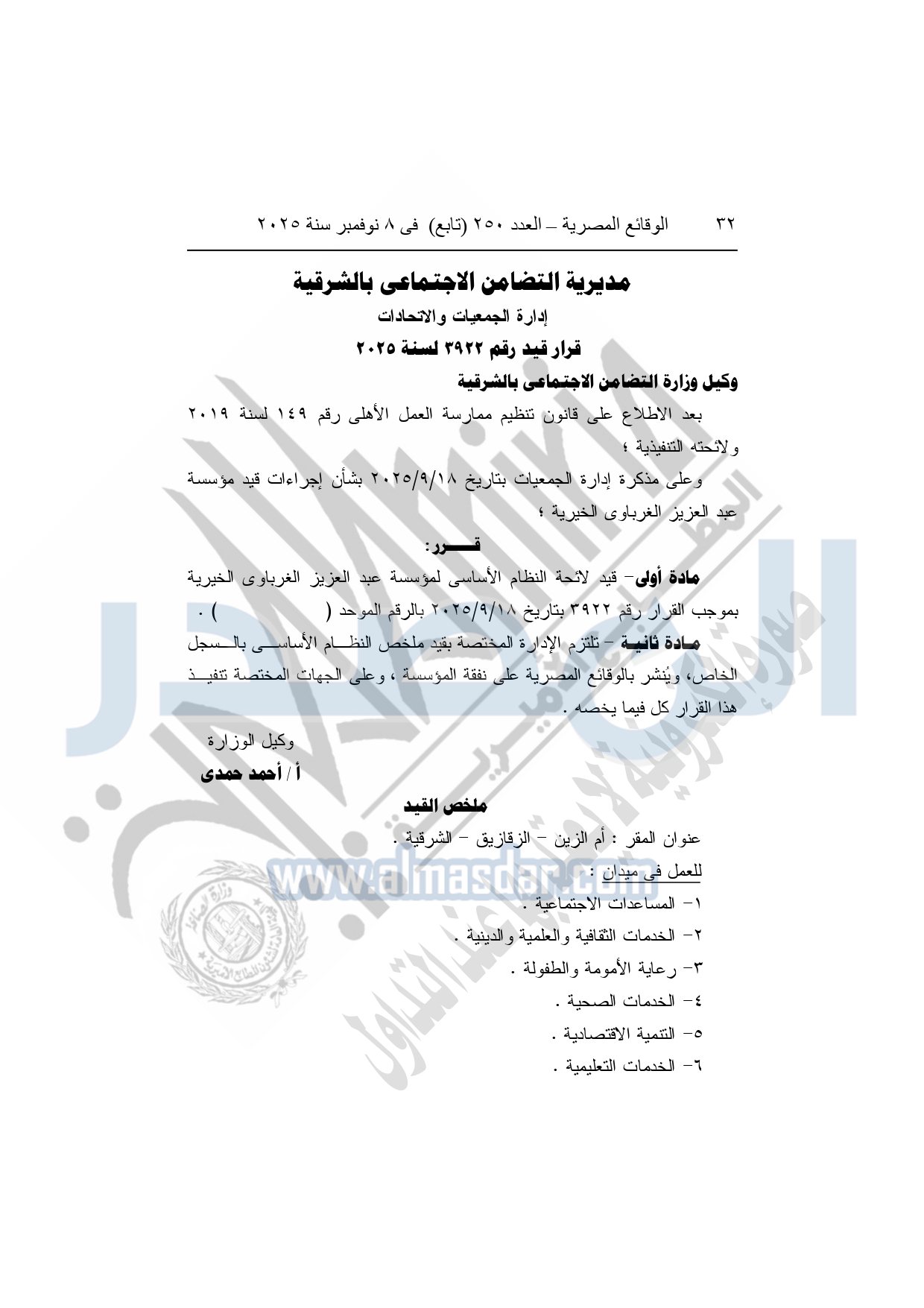 كما نشرت الوقائع المصرية في العدد 250 "تابع" الصادر في 8 نوفمبر سنة 2025، مديرية التضامن الاجتماعي بالشرقية، إدارة الجمعيات والاتحادات، قرار قيد رقم 3922 لسنة 2025.