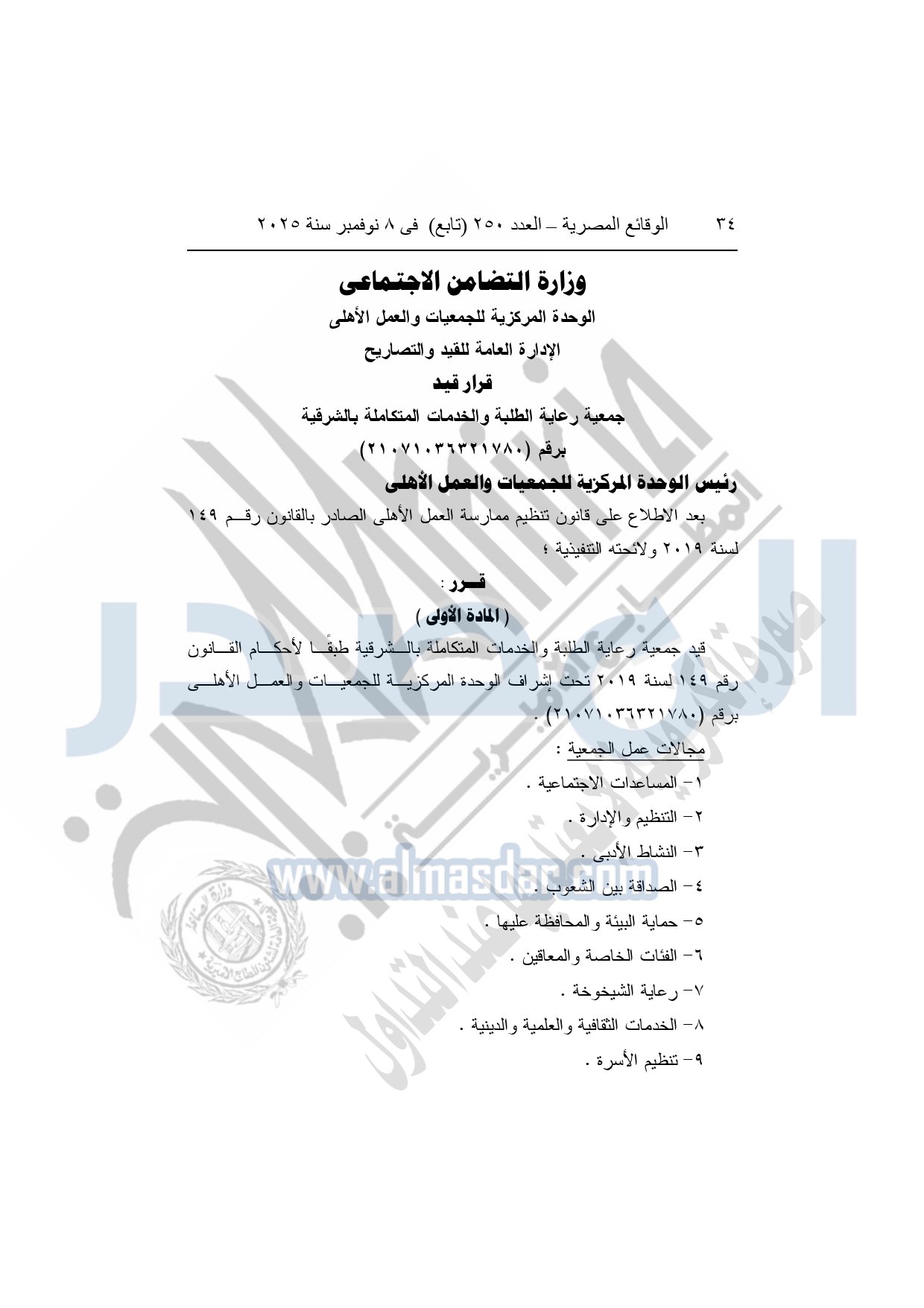 ونشرت الوقائع المصرية في العدد 250 "تابع" الصادر في 8 نوفمبر سنة 2025، وزارة التضامن الاجتماعي الوحدة المركزية للجمعيات والعمل الاهلي، الإدارة العامة للقيد والتصاريح، قرار قيد، جمعية رعاية الطلبة والخدمات المتكاملة بالشرقية برقم "21071036321780".
