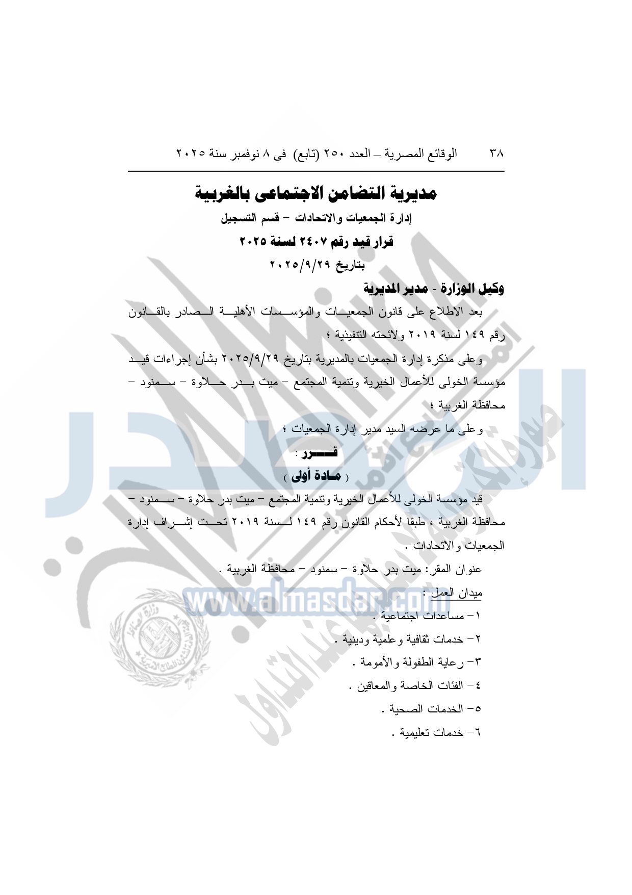 ونشرت الوقائع المصرية في العدد 250 "تابع" الصادر في 8 نوفمبر سنة 2025، مديرية التضامن الاجتماعي بالغربية، إدارة الجمعيات والاتحادات – قسم التسجيل، قرار قيد رقم 2407 لسنة 2025، بتاريخ 29-9-2025.