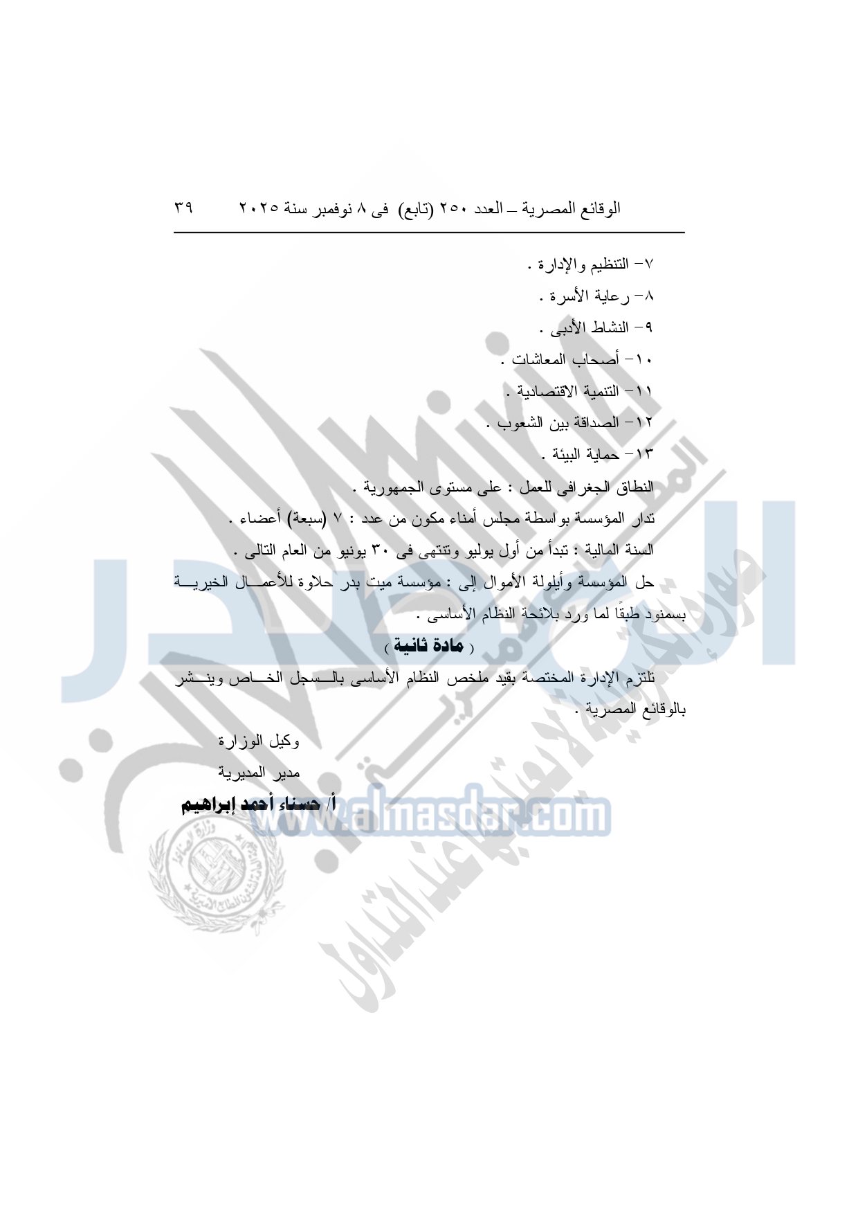يقيد النظام الأساسي لمؤسسة أبو بكر للتنمية والتدريب والنهوض بالمرأة والطفل والمجتمع بأخميم برقم "1858" اعتبارًا من 24-9-2025.