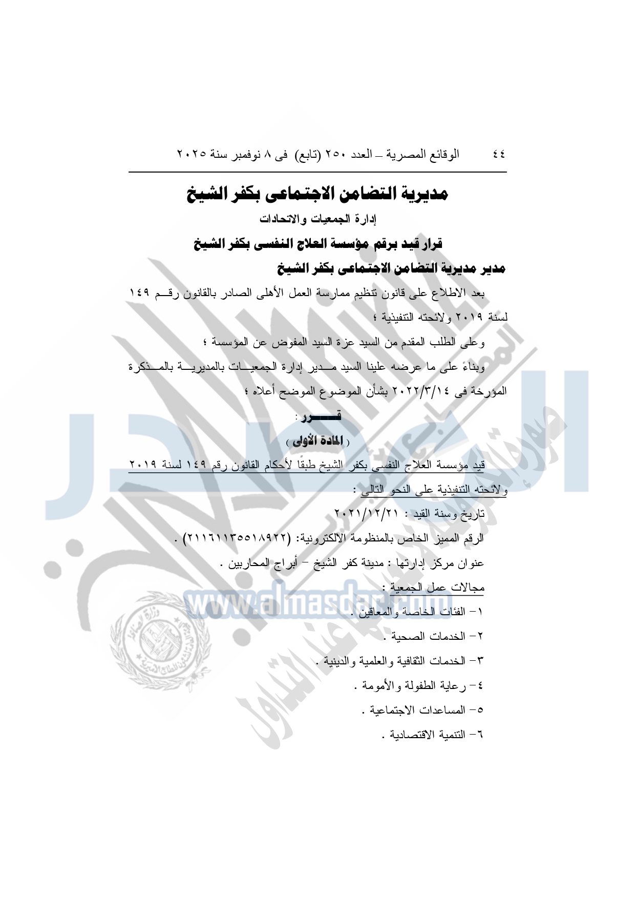 كما نشرت الوقائع المصرية في العدد 250 "تابع" الصادر في 8 نوفمبر سنة 2025، مديرية التضامن الاجتماعي بكفر الشيخ، إدارة الجمعيات والاتحادات، قرار قيم برقم مؤسسة العلاج النفسي بكفر الشيخ.