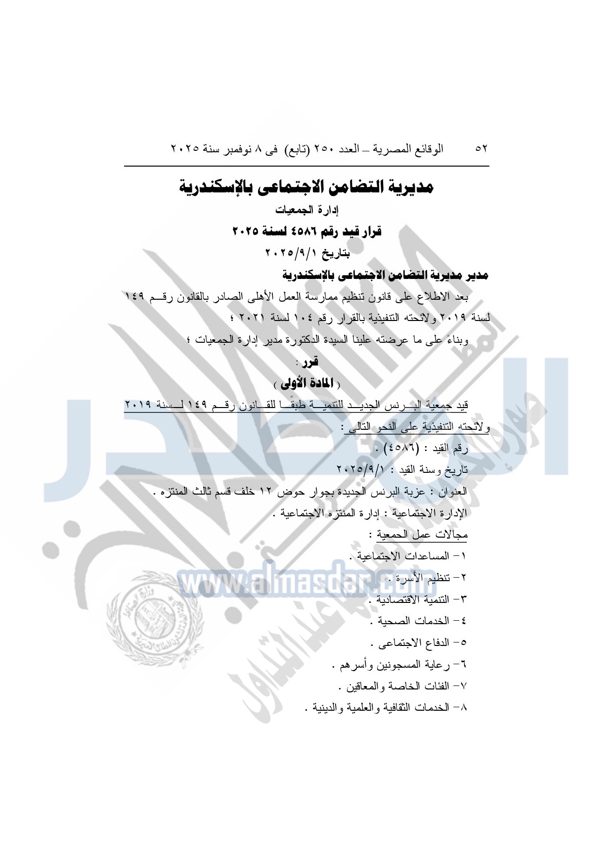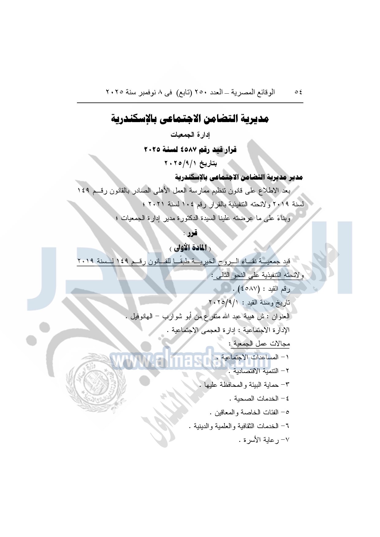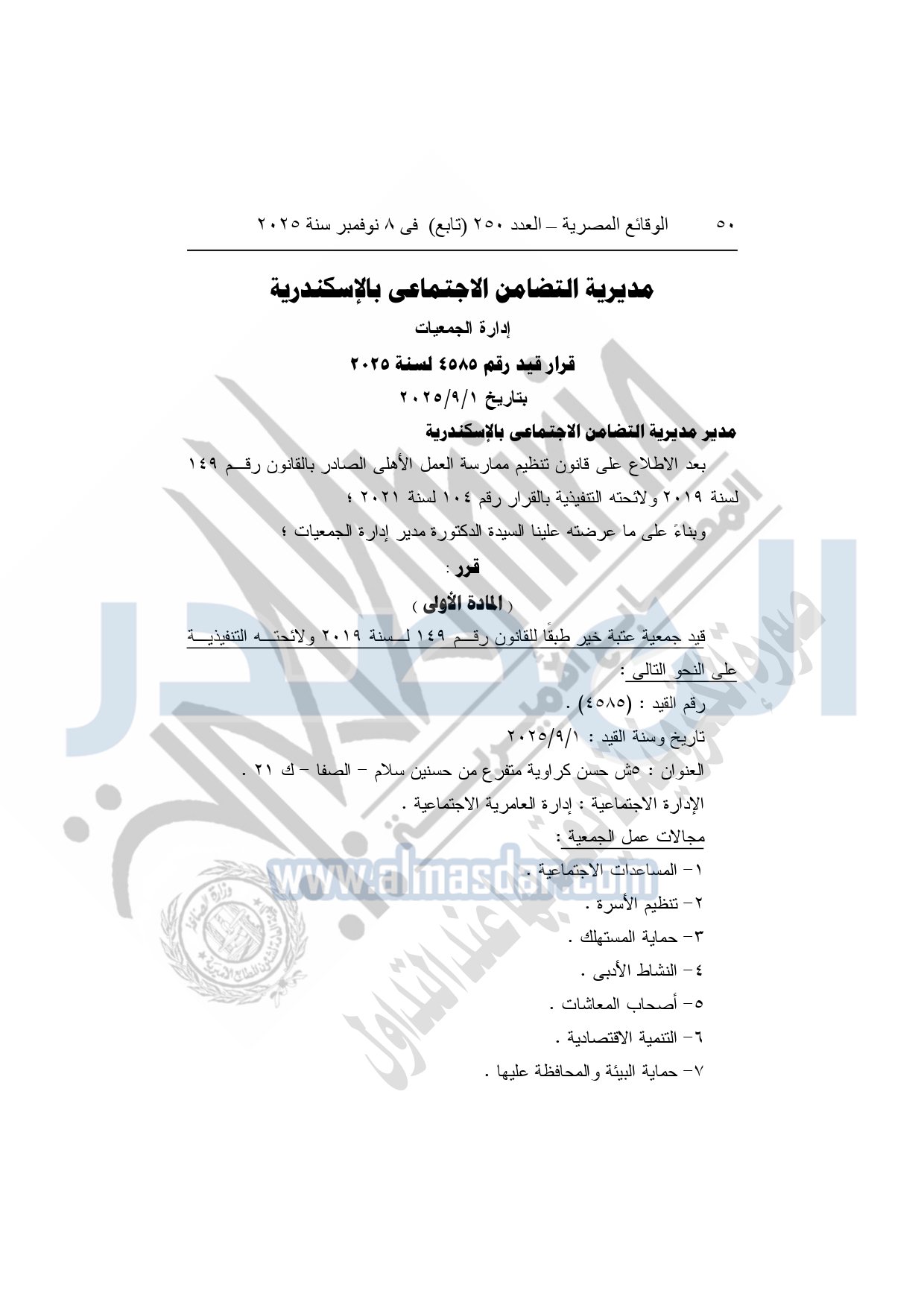 كما نشرت الوقائع المصرية في العدد 250 "تابع" الصادر في 8 نوفمبر سنة 2025، مديرية التضامن الاجتماعي بالإسكندرية، إدارة الجمعيات، قرار قيد رقم 4585 لسنة 2025، بتاريخ 1-9-2025.