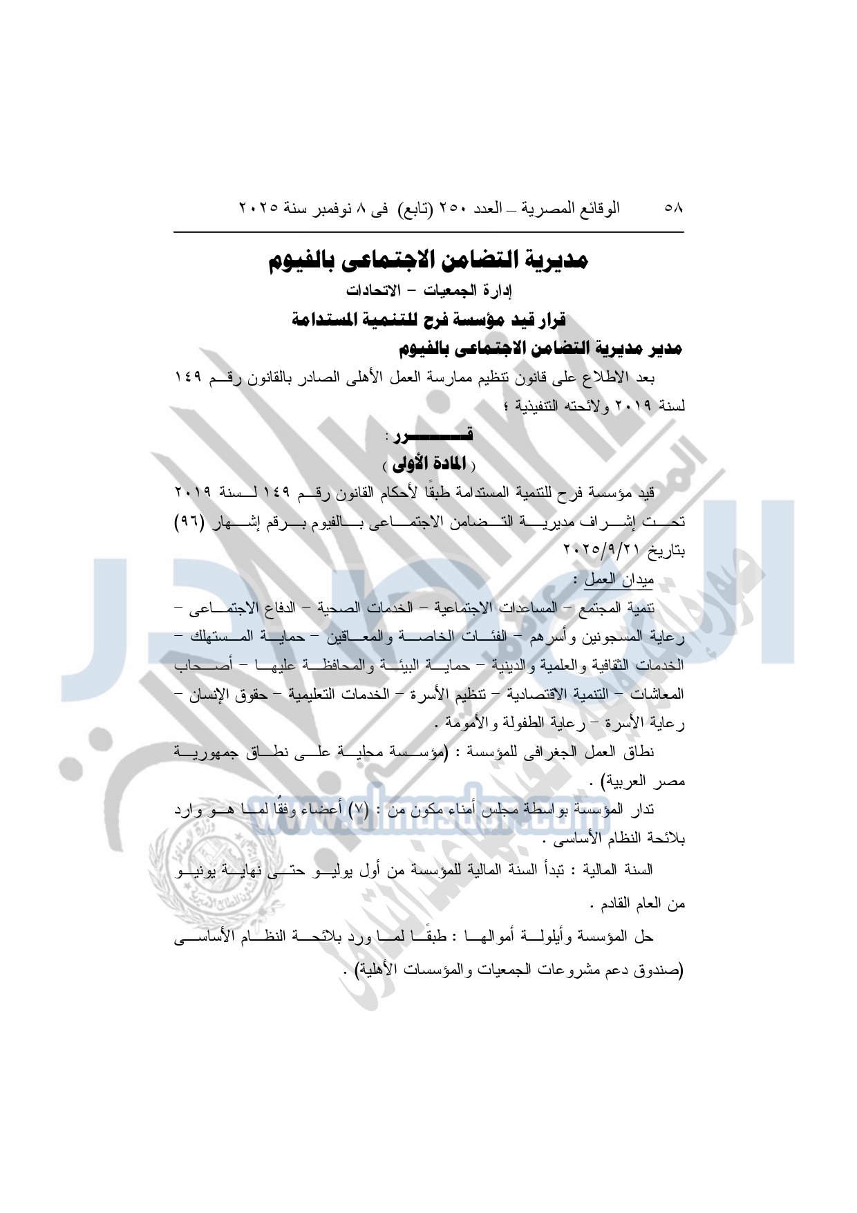 ونشرت الوقائع المصرية في العدد 250 "تابع" الصادر في 8 نوفمبر سنة 2025، مديرية التضامن الاجتماعي بالفيوم، إدارة الجمعيات – الاتحادات، قرار قيد مؤسسة فرح للتنمية المستدامة.