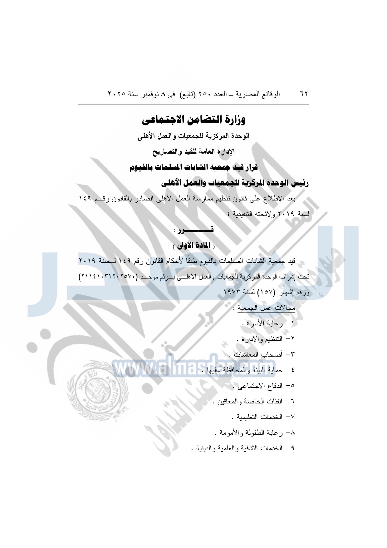 ونشرت الوقائع المصرية في العدد 250 "تابع" الصادر في 8 نوفمبر سنة 2025، وزارة التضامن الاجتماعي الوحدة المركزية للجمعيات والعمل الاهلي، الإدارة العامة للقيد والتصاريح، قرار قيد جمعية الشابات المسلمات بالفيوم.