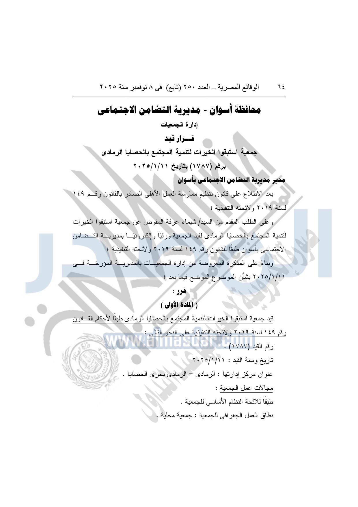 نشرت الوقائع المصرية في العدد 250 "تابع" الصادر في 8 نوفمبر سنة 2025، محافظة أسوان – مديرية التضامن الاجتماعي، إدارة الجمعيات، قرار قيد جمعية استبقوا الخيرات لتنمية المجتمع بالحصايا الرمادي برقم "1787" بتاريخ 11-1-2025.