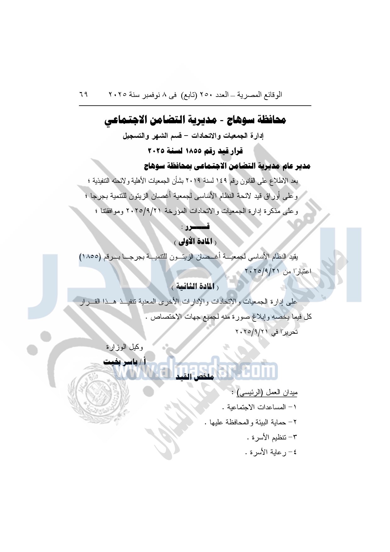 نشرت الوقائع المصرية في العدد 250 "تابع" الصادر في 8 نوفمبر سنة 2025، محافظة سوهاج – مديرية التضامن الاجتماعي، إدارة الجمعيات والاتحادات – قسم الشهر والتسجيل، قرار قيد رقم 1855 لسنة 2025.