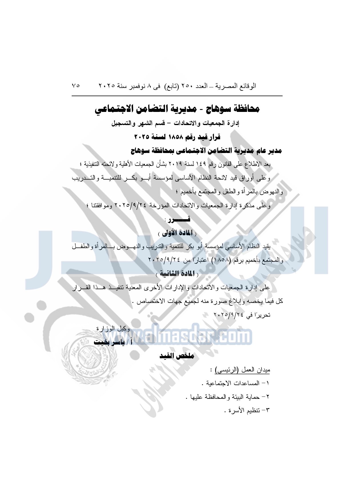 نشرت الوقائع المصرية في العدد 250 "تابع" الصادر في 8 نوفمبر سنة 2025، محافظة سوهاج – مديرية التضامن الاجتماعي، إدارة الجمعيات والاتحادات – قسم الشهر والتسجيل، قرار قيد رقم 1858 لسنة 2025.