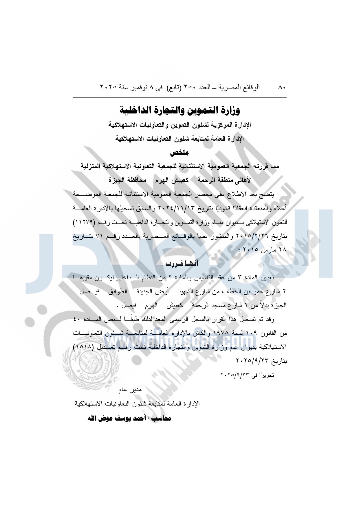 نشرت الوقائع المصرية في العدد 250 "تابع" الصادر في 8 نوفمبر سنة 2025، وزارة التموين والتجارة الداخلية، الإدارة المركزية لشئون التموين والتعاونيات الاستهلاكية، الإدارة العامة لمتابعة شئون التعاونيات الاستهلاكية، ملخص مما قررته الجمعية العمومية الاستثنائية للجمعية التعاونية الاستهلاكية المنزلية لأهالي منطقة الرحمة – كعبيش الهرم – محافظة الجيزة.