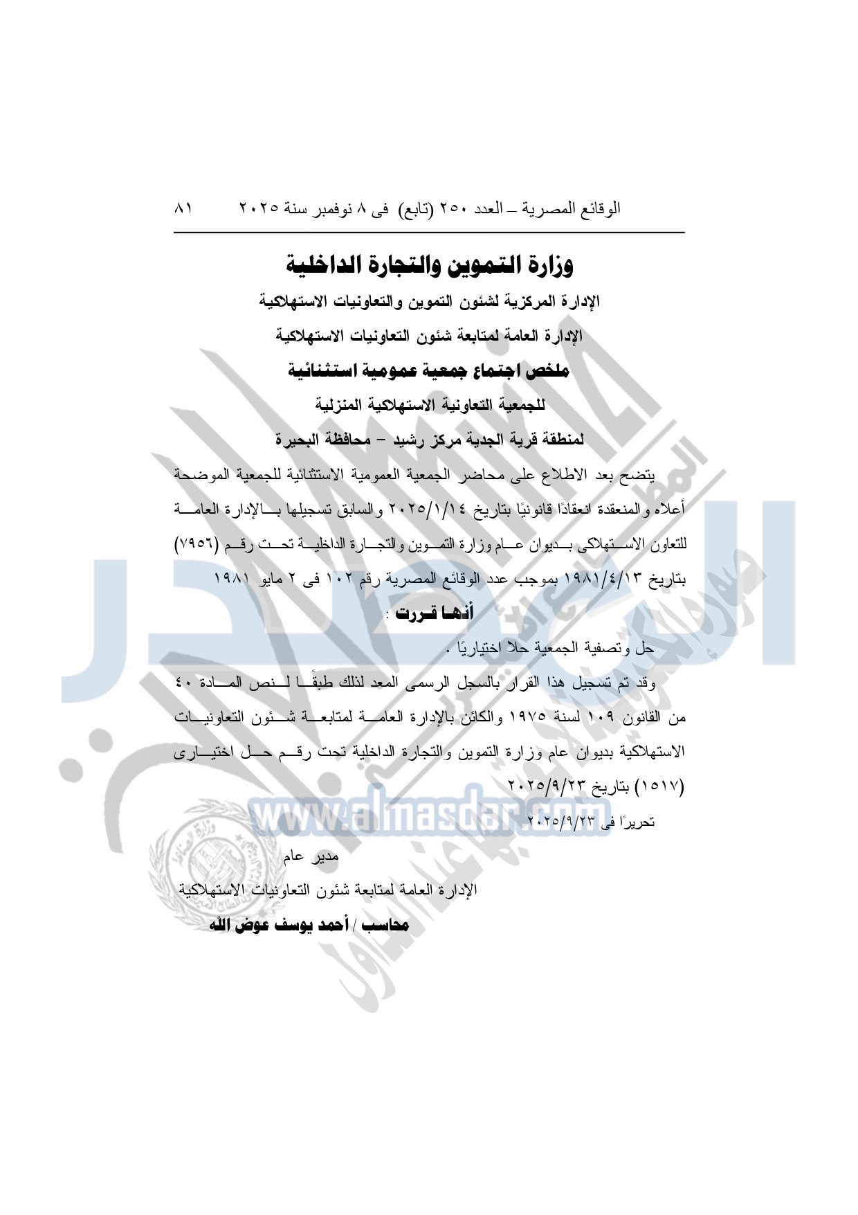 كما نشرت الوقائع المصرية في العدد 250 "تابع" الصادر في 8 نوفمبر سنة 2025، وزارة التموين والتجارة الداخلية، الإدارة المركزية لشئون التموين والتعاونيات الاستهلاكية، الإدارة العامة لمتابعة شئون التعاونيات الاستهلاكية، ملخص اجتماع جمعية عمومية استثنائية للجمعية التعاونية الاستهلاكية المنزلية، لمنطقة قرية الجدية مركز رشيد – محافظة البحيرة.