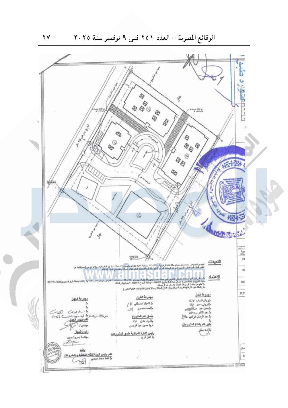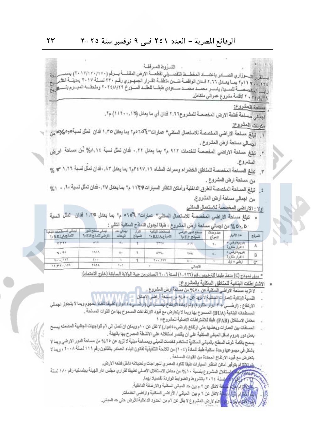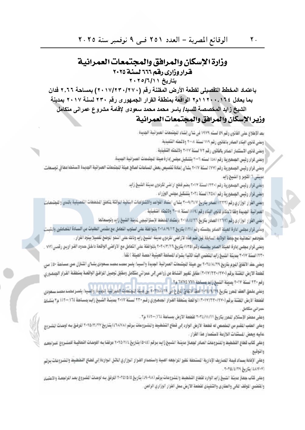 نشرت الوقائع المصرية في العدد 251 الصادر في 9 نوفمبر سنة 2025، وزارة الإسكان والمرافق والمجتمعات العمرانية، قرار رقم 666 لسنة 2025، بتاريخ 11-6-2025، بشأن اعتماد المخطط التفصيلي لقطعة الأرض المقننة رقم "270/ 230/ 2017" بمساحة 2.66 فدان بما يعادل 11200.164م2 الواقعة بمنطقة القرار الجمهورى رقم 230 لسنة 2017 بمدينة الشيخ زايد المخصصة لـ ياسر محمد محمد سعودي لإقامة مشروع عمراني متكامل.