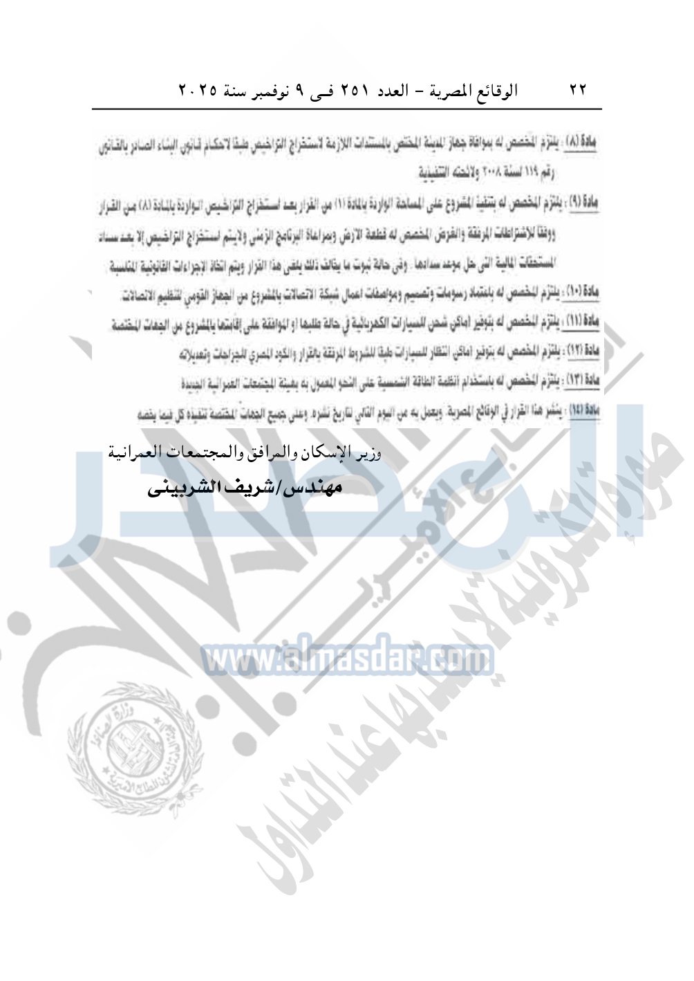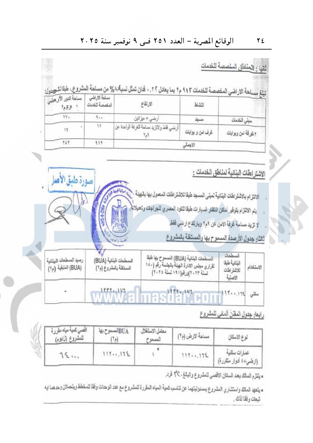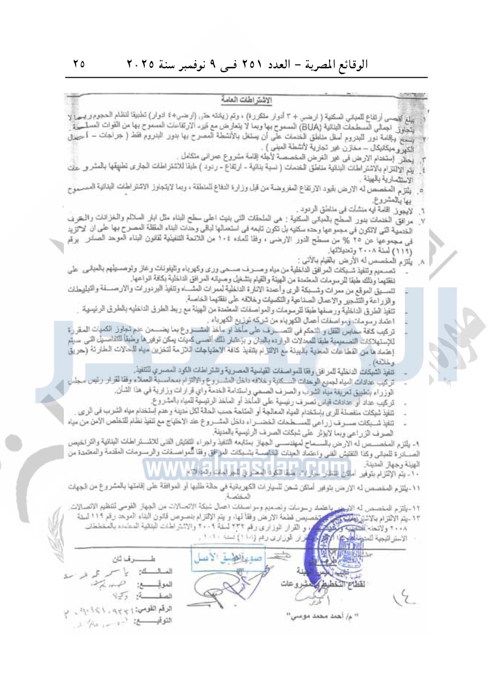 نشرت الوقائع المصرية في العدد 251 الصادر في 9 نوفمبر سنة 2025، وزارة الإسكان والمرافق والمجتمعات العمرانية، قرار رقم 666 لسنة 2025، بتاريخ 11-6-2025، بشأن اعتماد المخطط التفصيلي لقطعة الأرض المقننة رقم "270/ 230/ 2017" بمساحة 2.66 فدان بما يعادل 11200.164م2 الواقعة بمنطقة القرار الجمهورى رقم 230 لسنة 2017 بمدينة الشيخ زايد المخصصة لـ ياسر محمد محمد سعودي لإقامة مشروع عمراني متكامل.