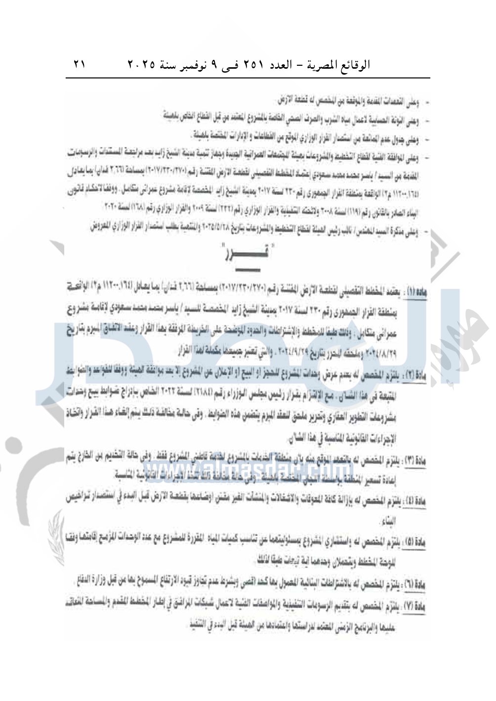 يعتمد المخطط التفصيلي لقطعة الأرض المقننة رقم "270/ 230/ 2017" بمساحة 2.66 فدان بما يعادل 11200.164م2 الواقعة بمنطقة القرار الجمهورى رقم 230 لسنة 2017 بمدينة الشيخ زايد المخصصة لـ ياسر محمد محمد سعودي لإقامة مشروع عمراني متكامل، وذلك طبقا للمخطط والإشتراطات والحدود الموضحة على الخريطة المرفقة بهذا القرار وعقد الاتفاق المبرم بتاريخ 29-8-2024 وملحقه المحرر بتاريخ 29-9-2024، والتي تعتبر جميعها مكملة لهذا القرار.