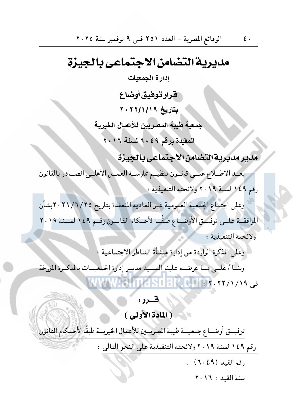 نشرت الوقائع المصرية في العدد 251، بتاريخ 9 نوفمبر 2025، قرار مديرية التضامن الاجتماعي بالجيزة، بشأن توفيق أوضاع جمعية طيبة المصريين للأعمال الخيرية، المقيدة برقم "6049" لسنة 2016.