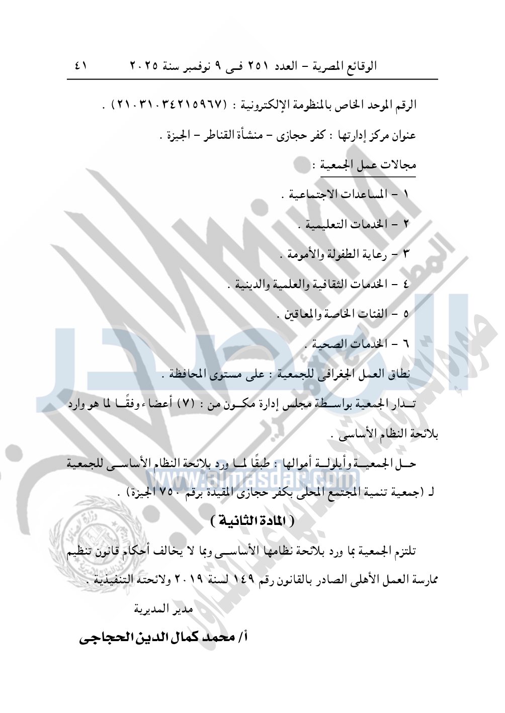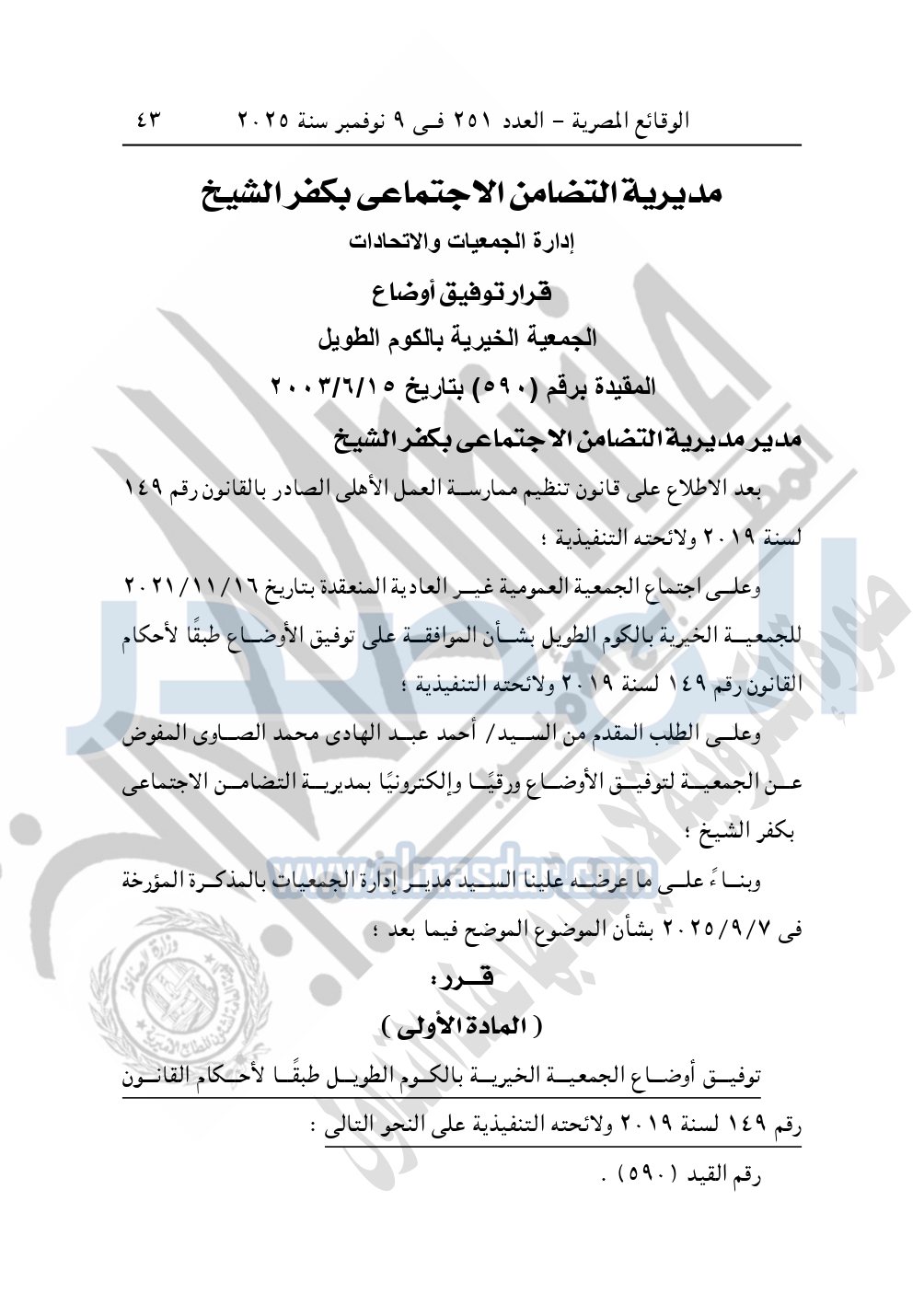 كما نشرت الوقائع المصرية في العدد 251، بتاريخ 9 نوفمبر 2025، قرار مديرية التضامن الاجتماعي بكفر الشيخ، بشأن توفيق أوضاع الجمعية الخيرية بالكوم الطويل، المقيدة برقم "590"، بتاريخ 15-6-2003.