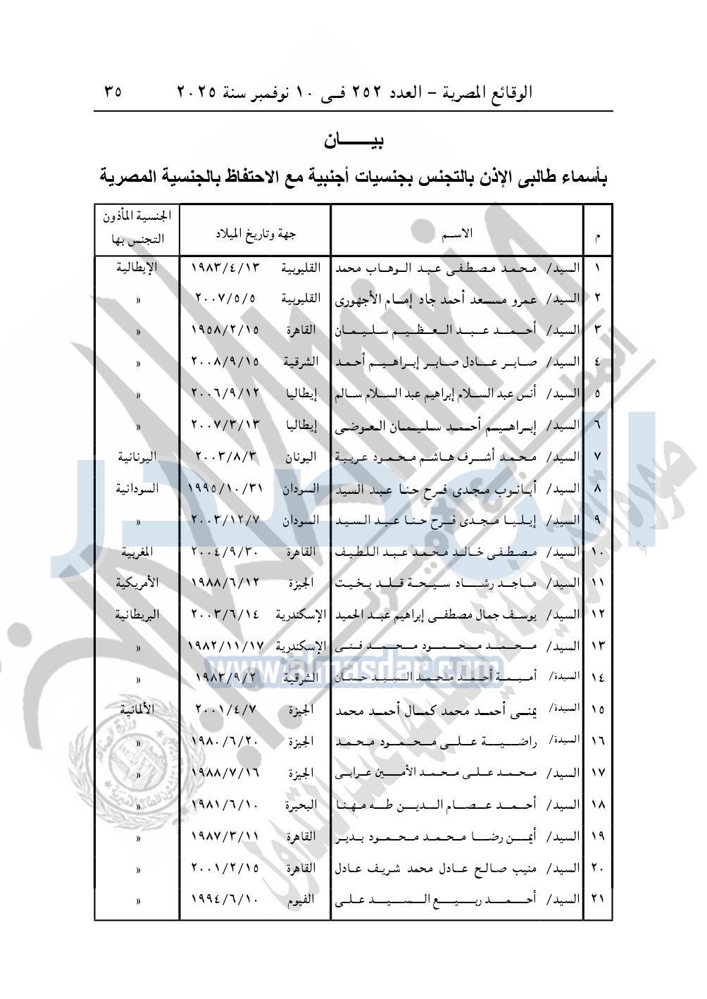 كما نشرت الوقائع المصرية في العدد 252 الصادر في 10 نوفمبر سنة 2025، وزارة الداخلية قرار رقم 1824 لسنة 2025، بشأن منح الإذن لواحد وعشرين مواطن بالتجنس بالجنسية الأجنبية إلى جانب احتفاظهم بالجنسية المصرية.