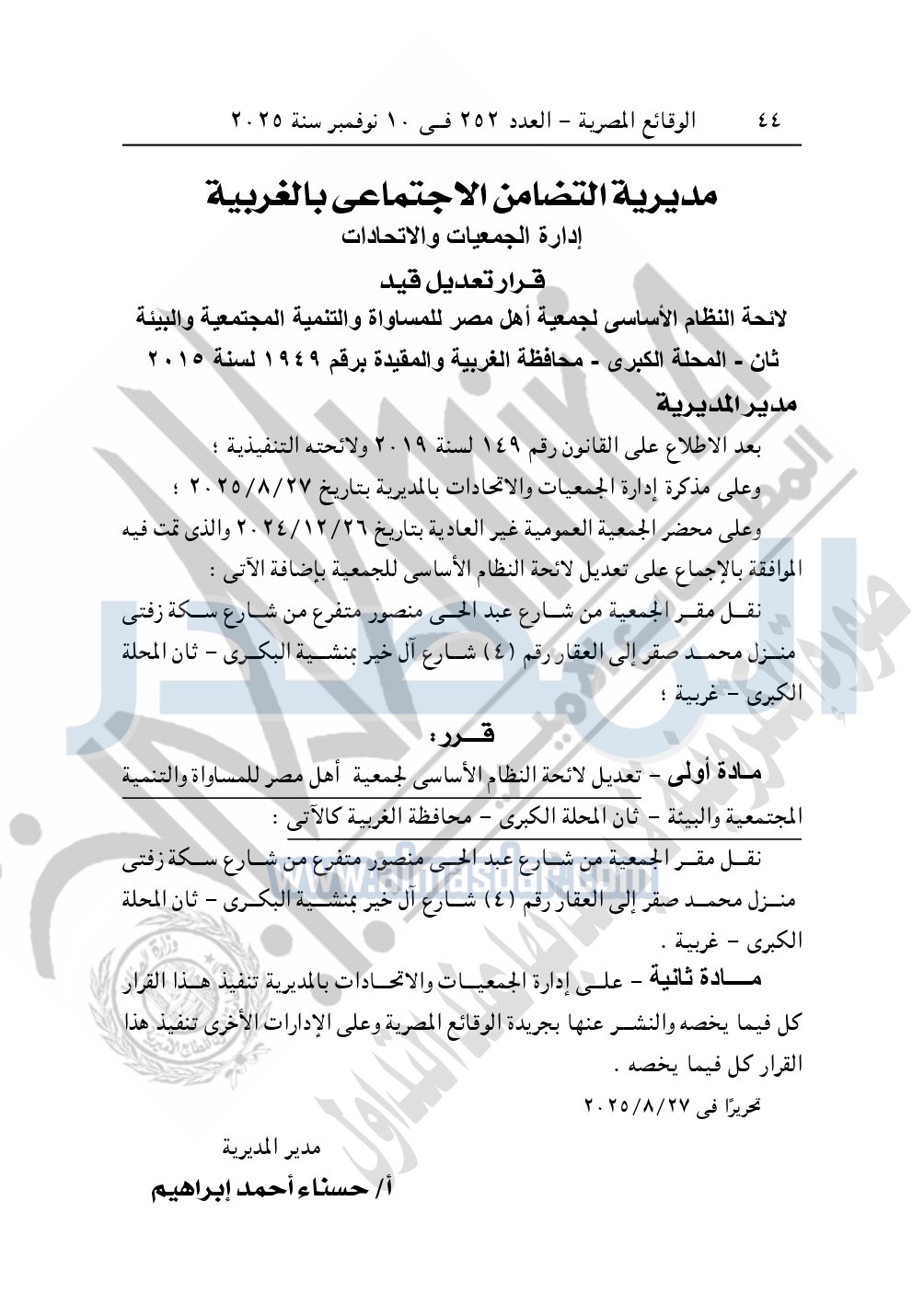 نشرت الوقائع المصرية في العدد 252، بتاريخ 10 نوفمبر 2025، قرار مديرية التضامن الاجتماعي بالغربية، قرار تعديل رقم 1949 لسنة 2015، بشأن تعديل قيد جمعية أهل مصر للمساواة والتنمية المجتمعية والبيئة ثان – المحلة الكبرى – محافظة الغربية.
