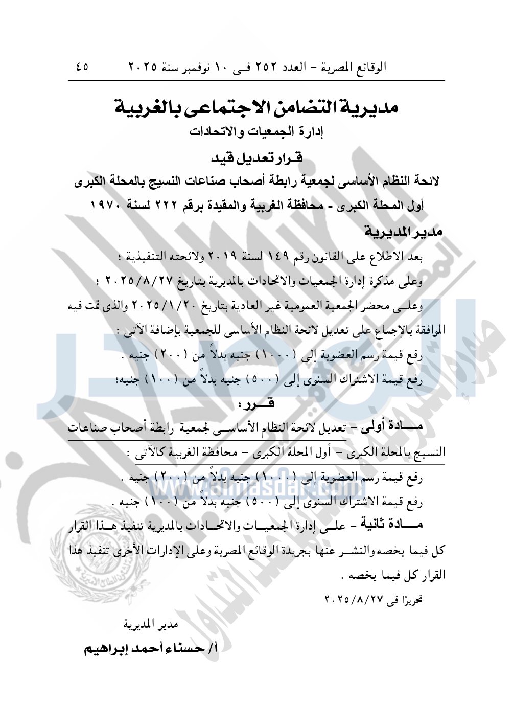كما نشرت الوقائع المصرية في العدد 252، بتاريخ 10 نوفمبر 2025، قرار مديرية التضامن الاجتماعي بالغربية، قرار تعديل رقم 222 لسنة 1970، بشأن تعديل قيد جمعية رابطة أصحاب صناعات النسيج بالمحلة الكبرى – أول المحلة الكبرى – محافظة الغربية.