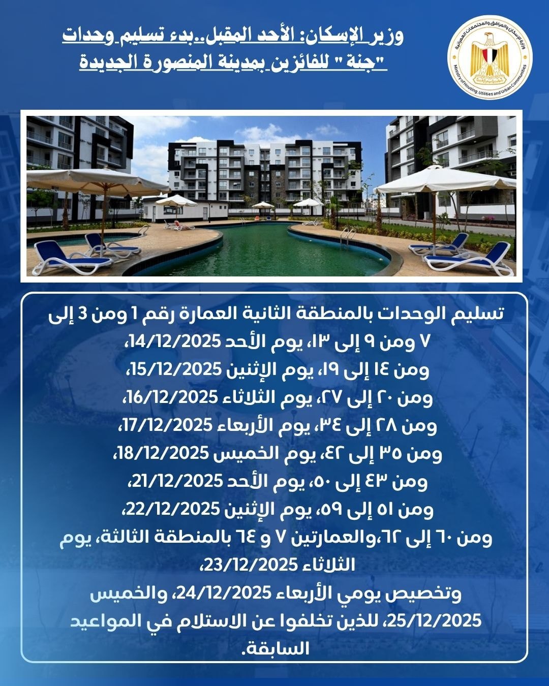 وأشار، إلى أنه سيتم تسليم الوحدات بالمنطقة الثانية العمارة رقم 1 ومن 3 إلى 7 ومن 9 إلى 13، يوم الأحد 14-12-2025، ومن 14 إلى 19، يوم الإثنين 15-12-2025، ومن 20 إلى 27، يوم الثلاثاء 16-12-2025، ومن 28 إلى 34، يوم الأربعاء 17-12-2025، ومن 35 إلى 42، يوم الخميس 18-12-2025، ومن 43 إلى 50، يوم الأحد 21-12-2025، ومن 51 إلى 59، يوم الإثنين 22-12-2025، ومن 60 إلى 62، والعمارتين 7 و64 بالمنطقة الثالثة، يوم الثلاثاء 23-12-2025، وتخصيص يومي الأربعاء 24-12-2025، والخميس 25-12-2025، للذين تخلفوا عن الاستلام في المواعيد السابقة.